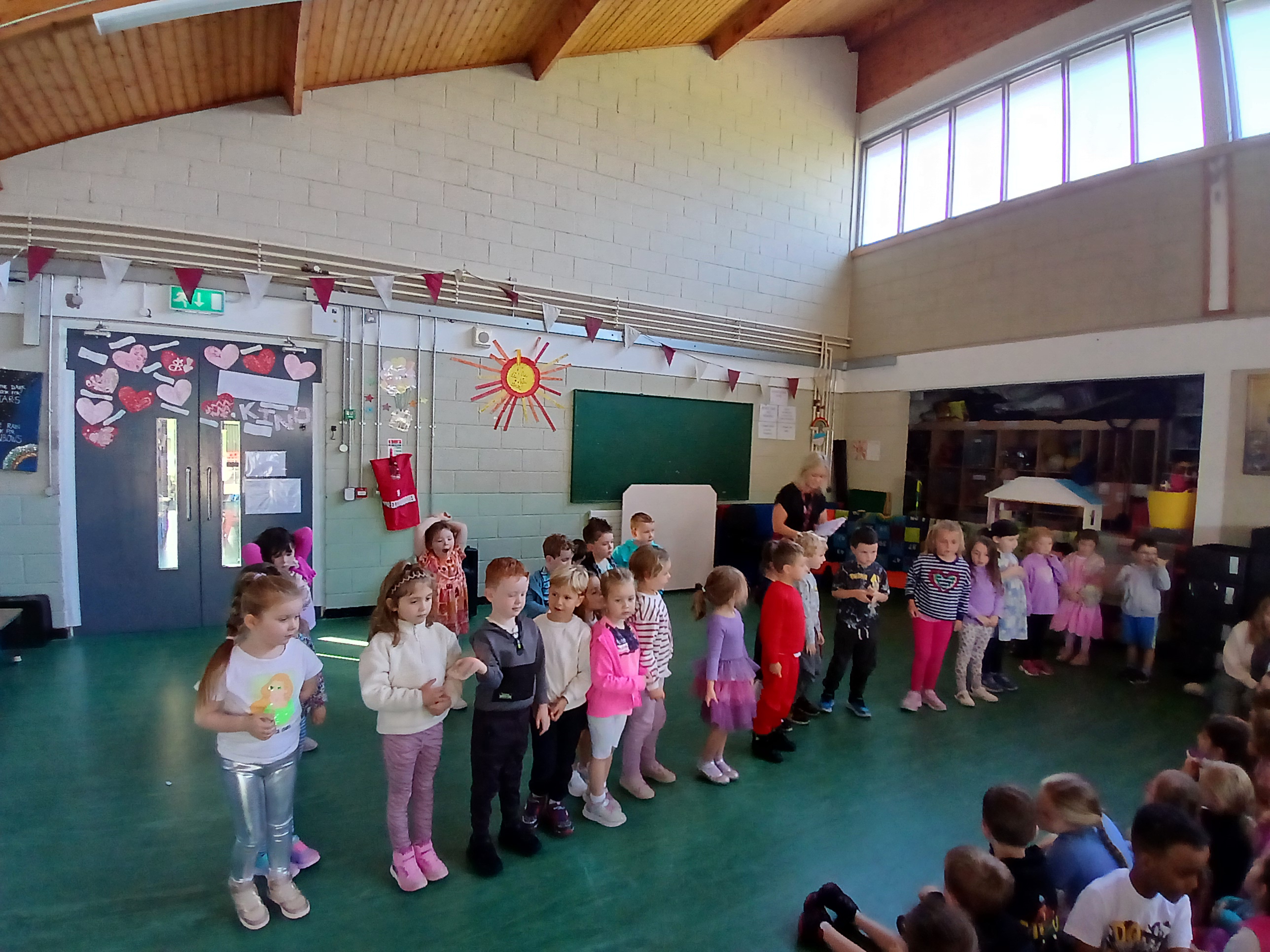 I mí Dheireadh Fómhair bhí deis ag Naíonáin Bheaga agus Rang 5 píosa a thaispeáint don scoil. Bhí an craic ag na Naíonáin baill choirp a thaispeáint, dhá amhráin a chanadh agus cluiche a imirt. Bhí spraoi ag na hardranganna amhráin a chanadh chun tús a chur le cheiliúradh Oíche Shamhna. Maith sibh na páistí uilig. Bhíomar go léir an bhróidiúl asaibh! Ní féidir linn feitheamh chun na ranganna eile a fheiceáil i mí na Samhna