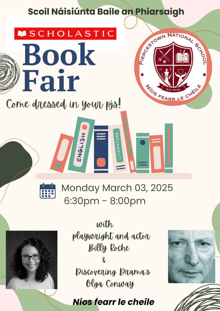 It is, yet another, one of our favourite swashboggling times of year here in Piercestown National School…Scholastic Book Fair Week. The teachers and students are all set for a week jam packed with phizz-whizzingly exciting adventures through literature! Doors will be decorated, books will take centre stage and a wealth of authors will be explored, culminating in the event we all love…Book Fair evening! So, have the pjs and pocketmoney on standby for the March 3rd at 6:30pm to spend the evening perusing, purchasing and watching performances by the amazing playwright and actor Billy Roche and the wonderful Discovering Drama’s Olga Conway. It is an evening not to be missed!