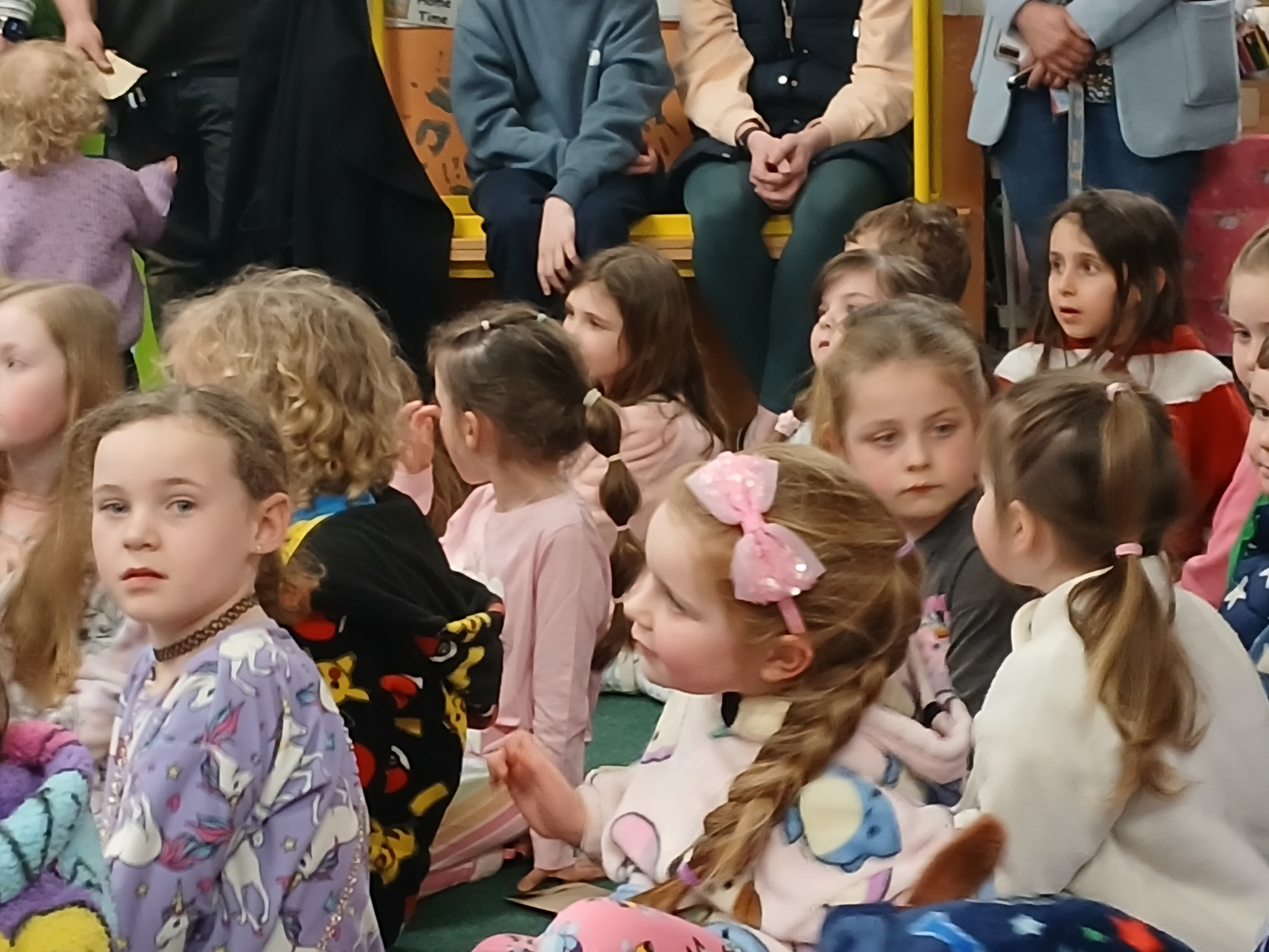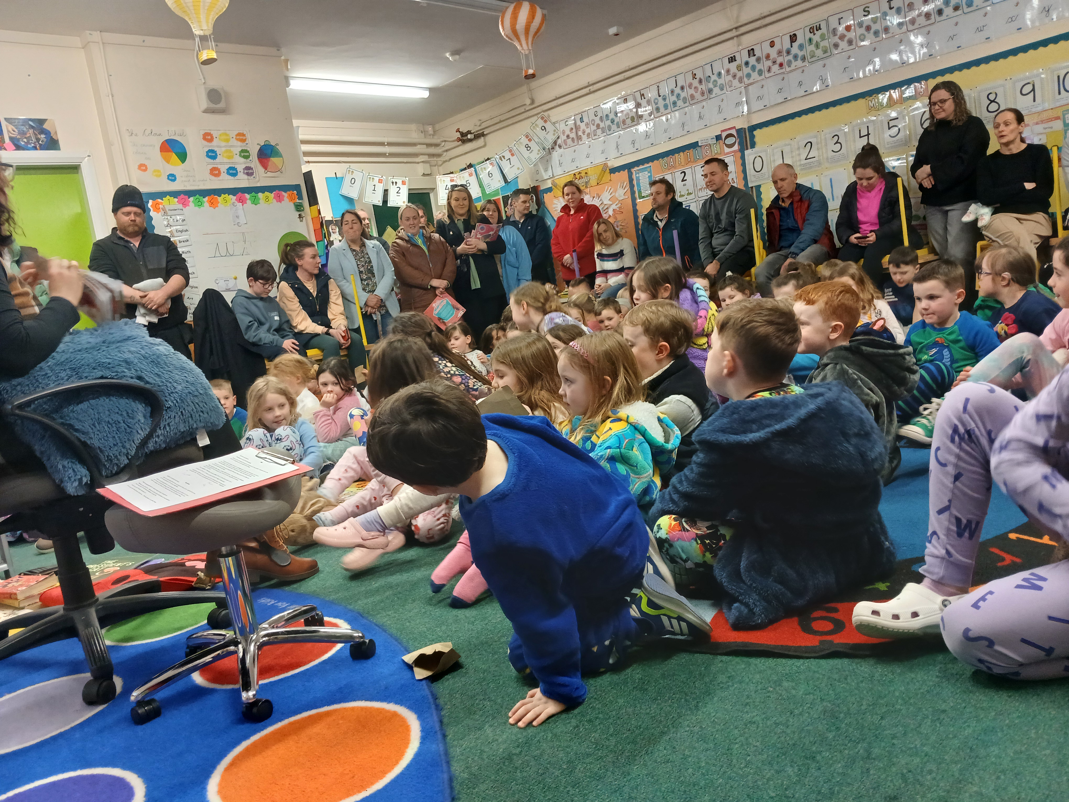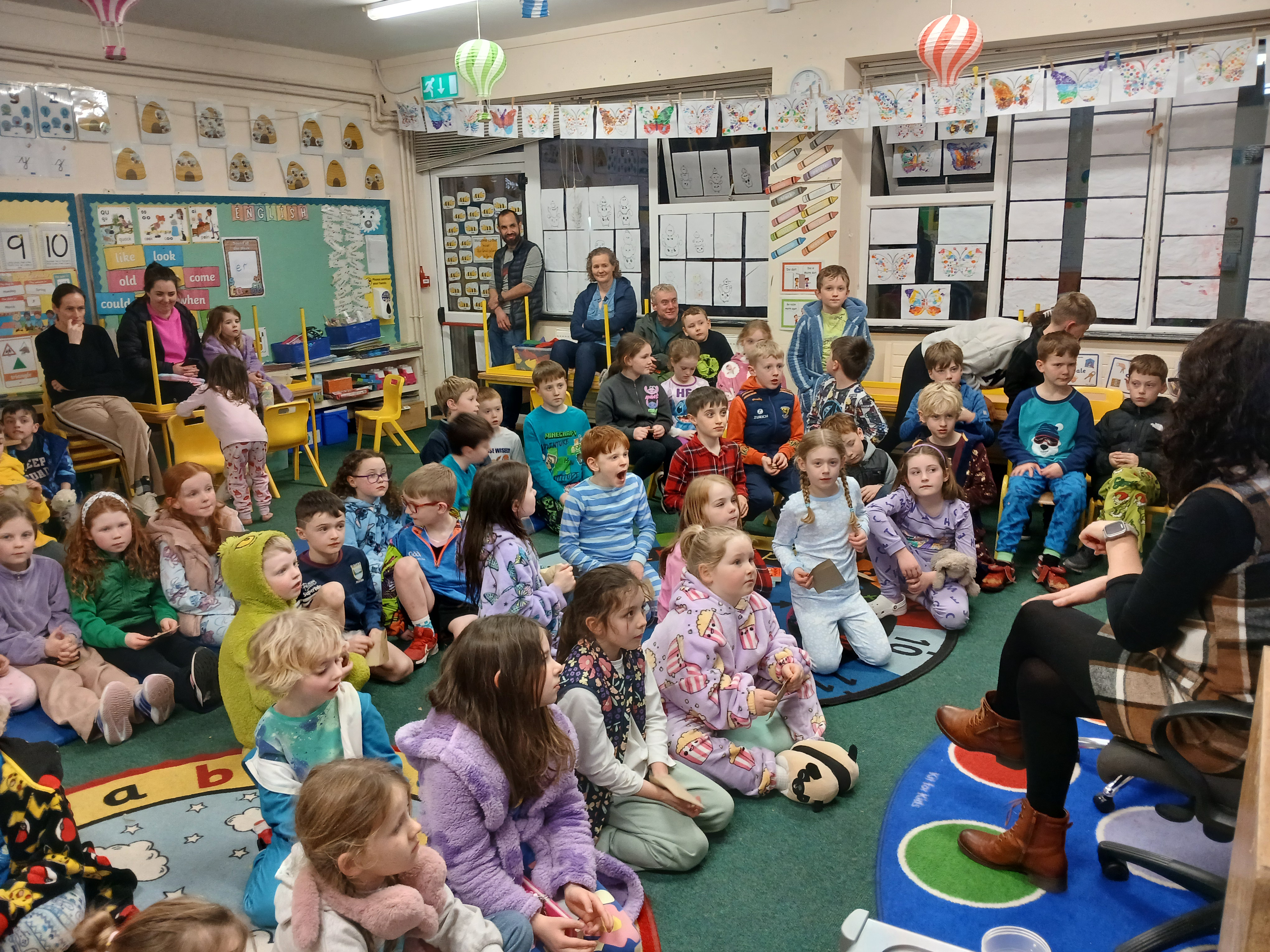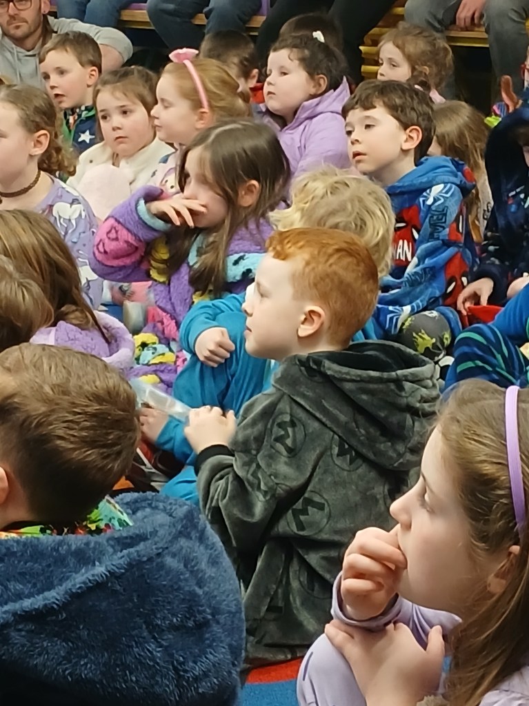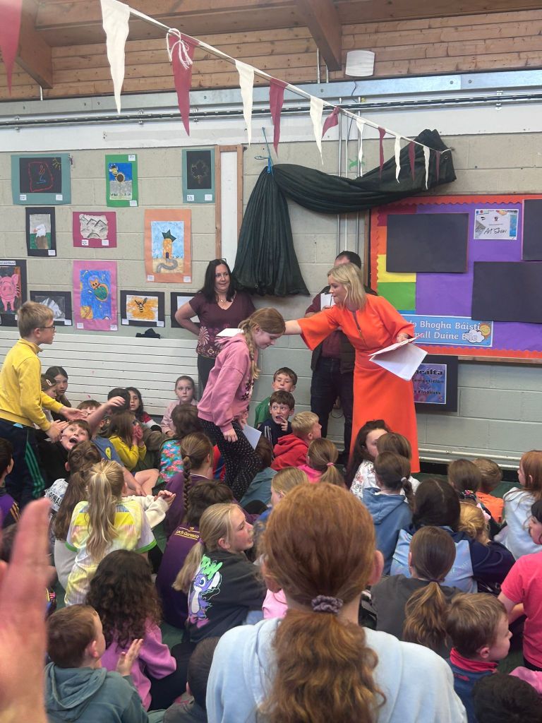 One of the most enchanting parts of the night was the storytelling sessions. What an absolute treat it was to have the children turn up, ready for bed, in their pyjamas and to have the wonderful Olga Conway read them their bed-time stories and Billy Roche to entertain them with his magical words! Ms. Walsh greeted everyone and presented them with their lucky envelopes, four of which contained the golden tickets! Jack in Junior Infants was thrilled for brother Harry and Nora in 2nd class, Cara in 4th, Ciara in 5th were delighted with their wins. Then it was over to Olga. Her ability to captivate an audience with a simple story is truly a gift. The students were enthralled and the parents were happy to hand over the hard work to her for a night…although they might have to up their story telling game going forward. The senior classes were also treated to a snippet of the wonderful play ‘Belfry’ that was brought to life by Billy Roche himself and his equally talented grandchild, and our very own, Lily Fox. Lily’s peers watched on in awe and their wasn’t a dry eye amongst the adults and staff present.