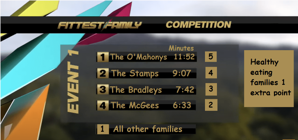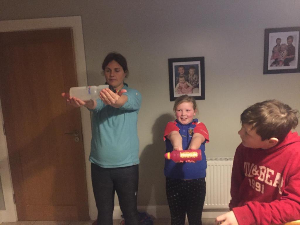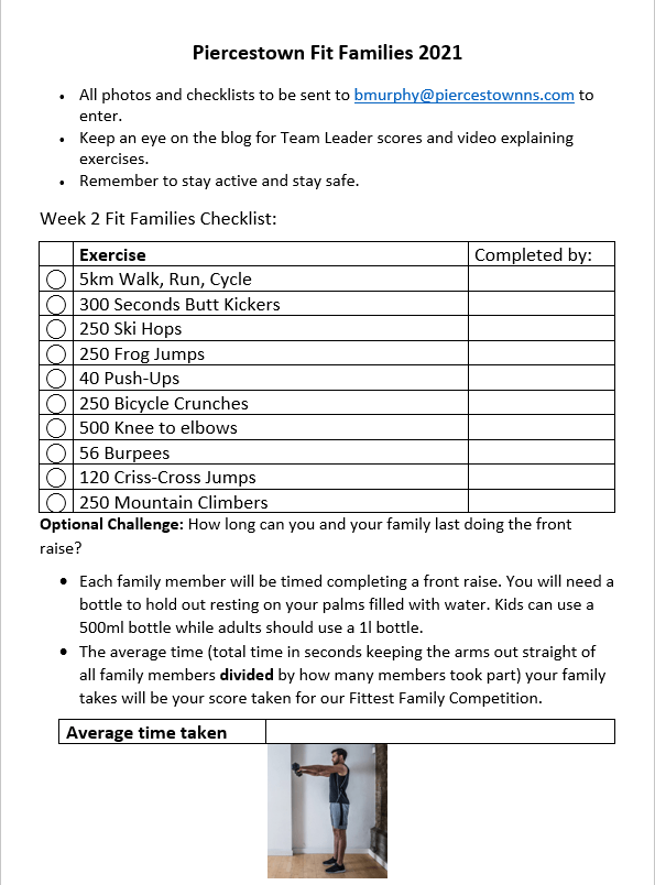Thank you all for your super effort already in week 3 of our Fittest Family. The concentration on the pupils and parents faces have been gold so far as we tackle a new week. This week we are doing the Front Raise with a bottle of water rather 500ml or 1l. It is an exercise for the physical and mentally strong as you try to keep those arms straight out. So stretch those arms out and fill up your bottle and stand up straight and prepare to laugh at your family as they try not to bottle it. Keep your eyes out for some celebrity times still to come to compete against too on Wednesday night. All emails to bmurphy@piercestownns.com please. We are also offering an extra bonus point to all families who take a photo of themselves this week outside in the fresh air as a team.