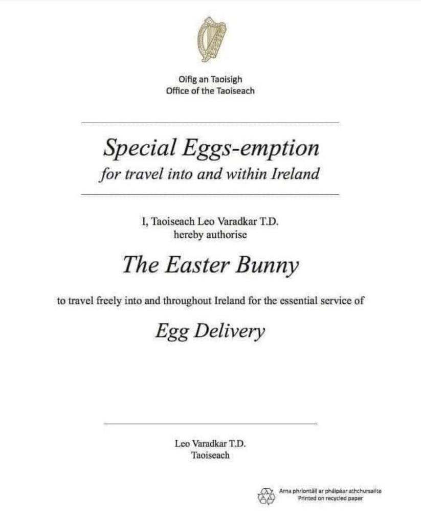 Thankfully, our Taoiseach, has granted a special eggs-emption for this weekend for the Easter Bunny to travel.