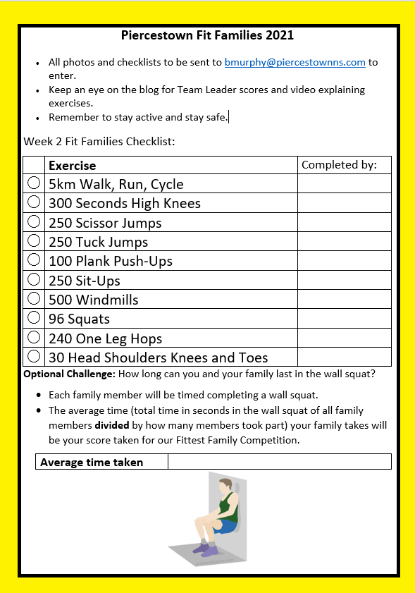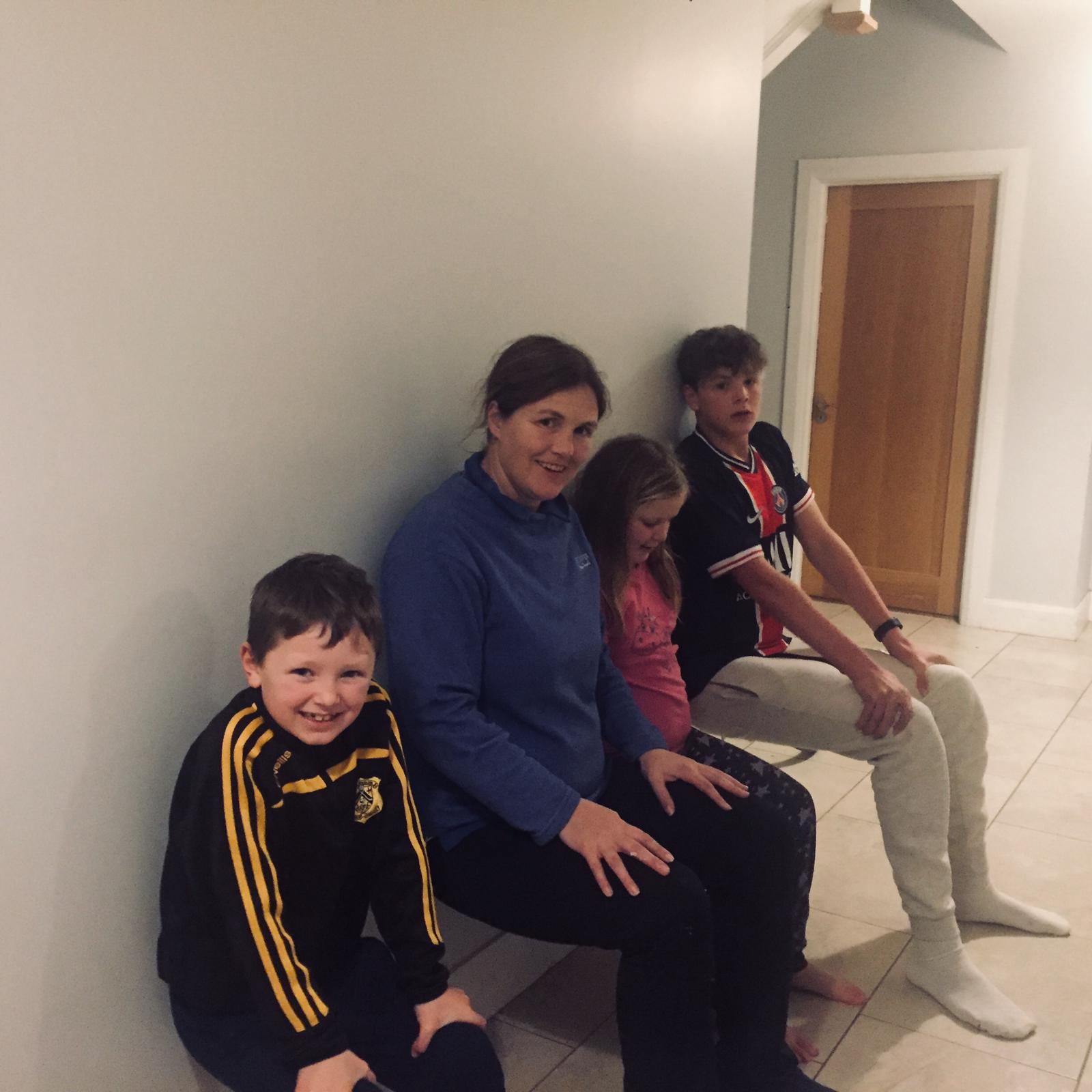 Congratulations to everyone who took part in our weekly exercise initiative again this week. It was great to see so many pupils out moving around safely in their area all with a smile on their faces. The activities are all about keeping us connected and smiling through these weeks. This week saw our families take on our team leaders and elite sport stars in a wall squat contest. The tremendous effort involved was amazing to see by all who took part in it. Special mention to so many pupils this week from our own school and others. So a huge bualadh bos for Katie Stamp (1st Class), Donagh McGee (1st Class), Rory O’Connell (2nd Class), Dawn Bradley-Jugessur (5th Class), Sarah O’Mahony (6th Class), Shane Ryan (Team Ryan) and Tommy Hearne (Team Hearne) for their amazing times this week. Our fittest family this week was The O’Mahony family who on average racked up their family wall squat time of 11 minutes and 52 seconds. This week we are also introducing a most creative photo category with the prizes this week going to The Devereux family for their amazing family shot of 4 wall squats on top of each other and The Crosbie family for their dog assisted squat. Thank you for all who took part and look out for tomorrow’s new weekly challenge on the blog too and throughout the week as some new sport stars take part in our challenges. Prizes will be announced at the end of our competitions.