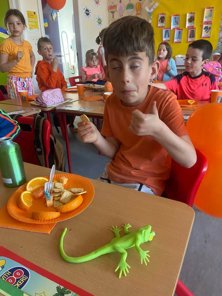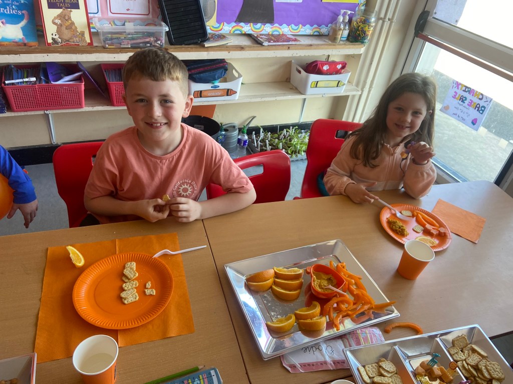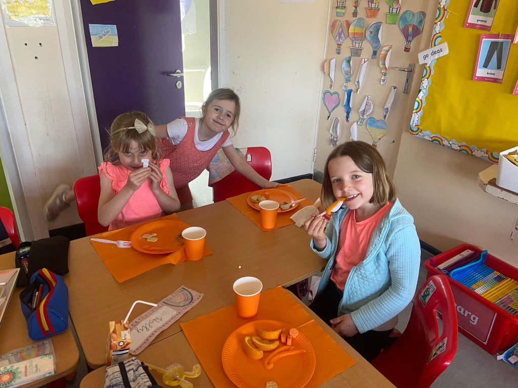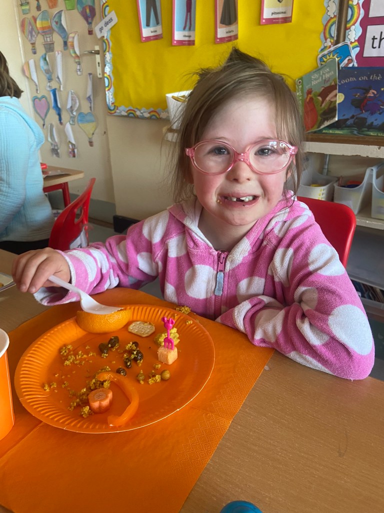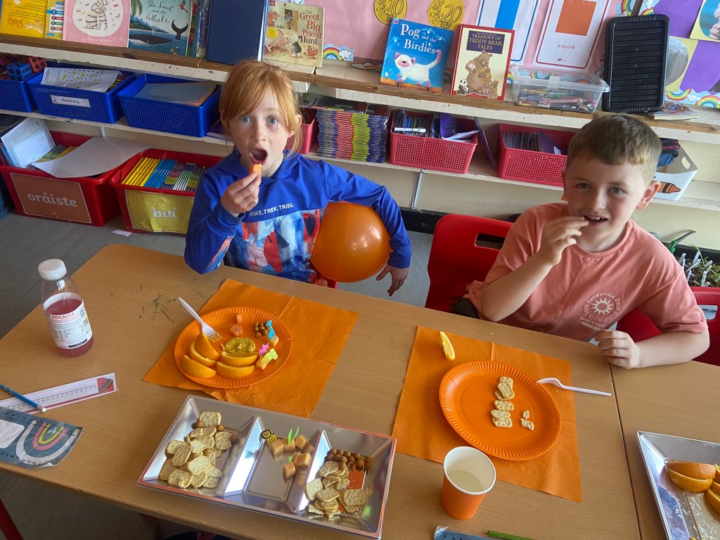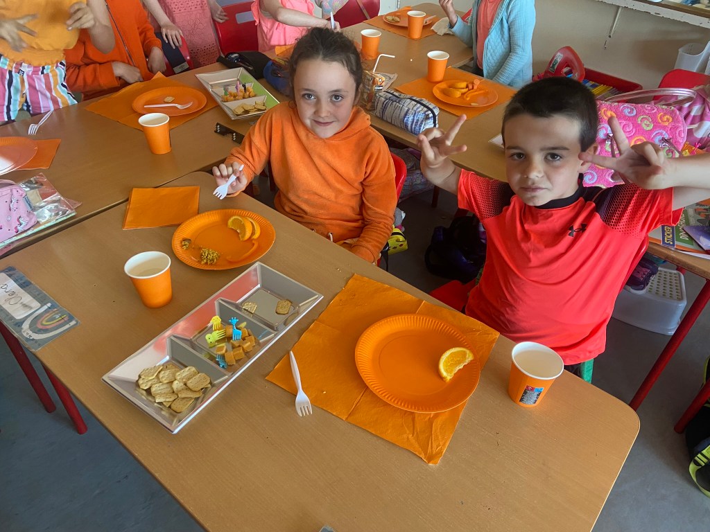 We rocked our socks on March 21st to celebrate World Down Syndrome Day. Teresa had the room decorated in beautiful purple balloons and all on her day off!! Special thank you to Teresa!! We read the book This is Me written by George Webster a boy with Down syndrome celebrating how each one of us is different. There were some information sheets explaining how we all get 23 chromosomes from our Mother and Father, and people with Down Syndrome have an extra copy of Chromosome 21 which looks like a pair of odd socks …. Hence the odd socks day! All the children in 1st class made pairs of odd socks, which they displayed on a “clothes line”. Eve and Henri had fun making pizza slices with Ms Lyttleton. Odd Socks day encourages us all to have a conversation about diversity, uniqueness, inclusion and acceptance.