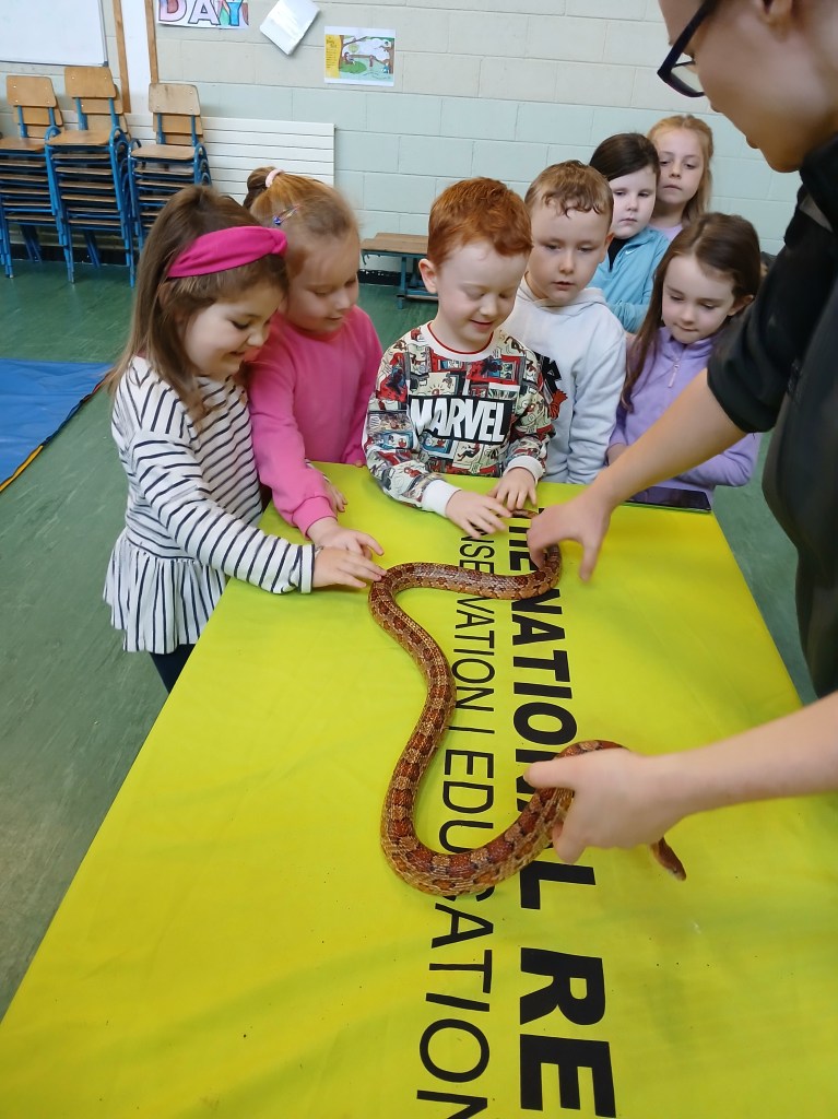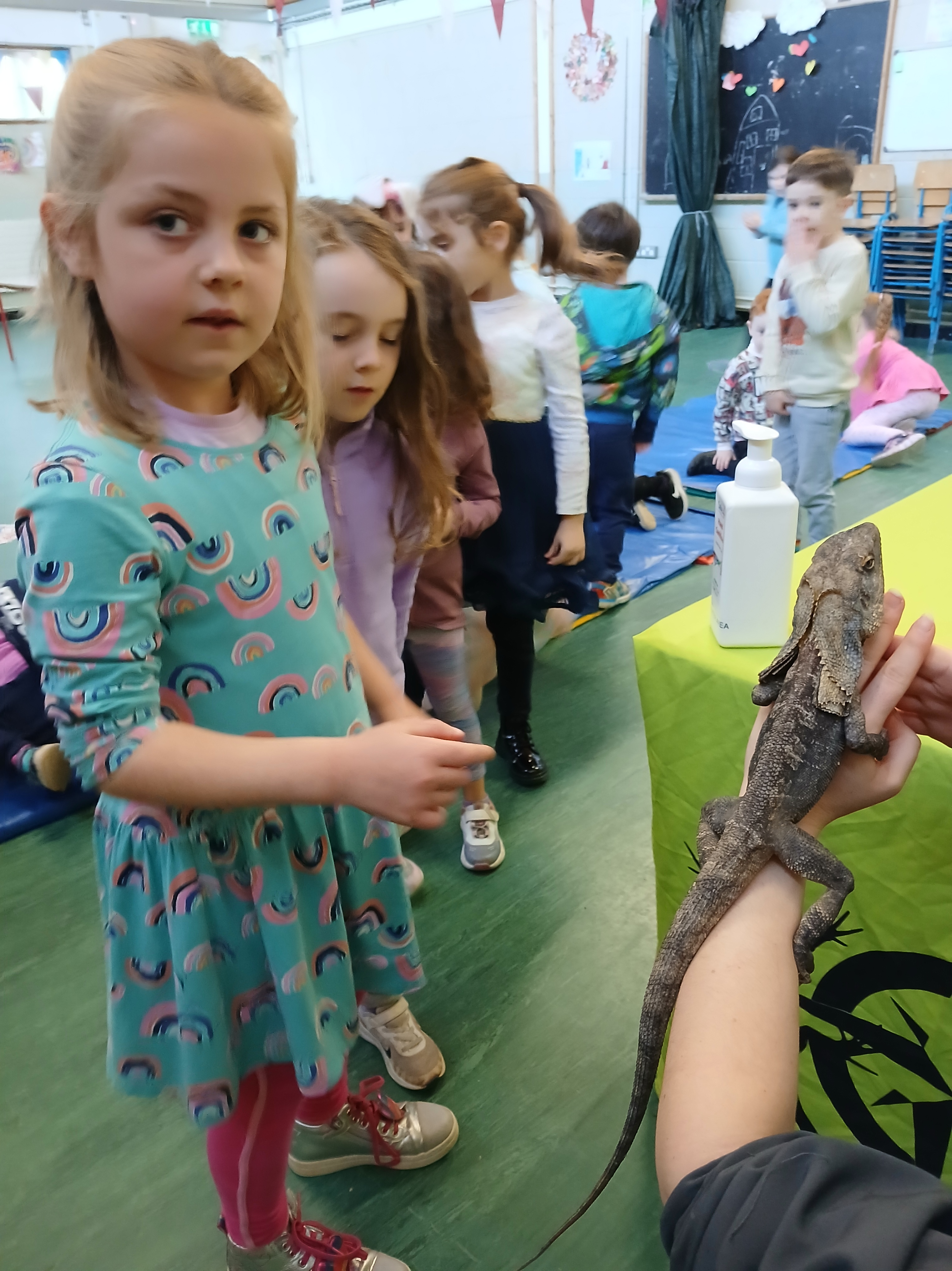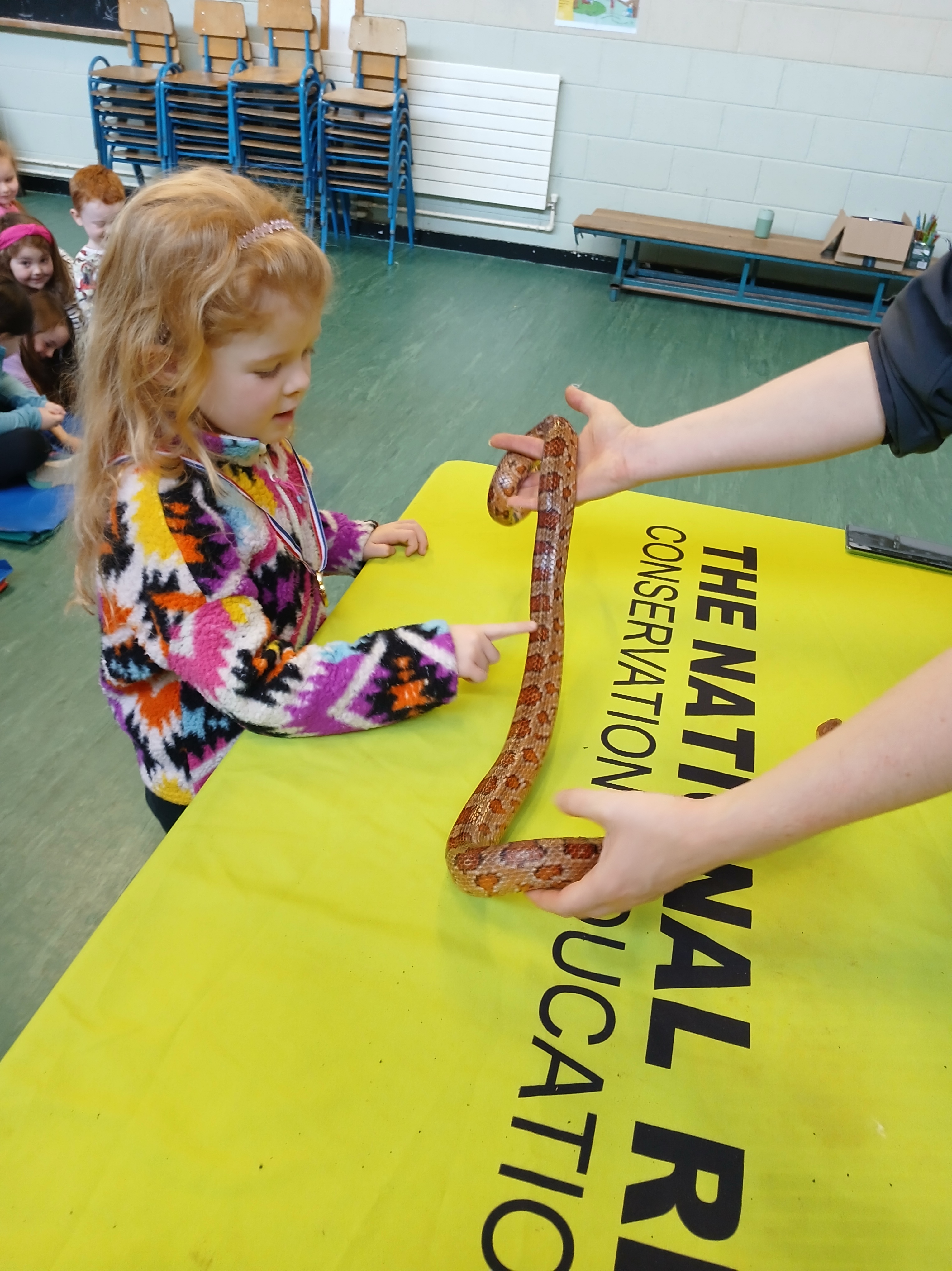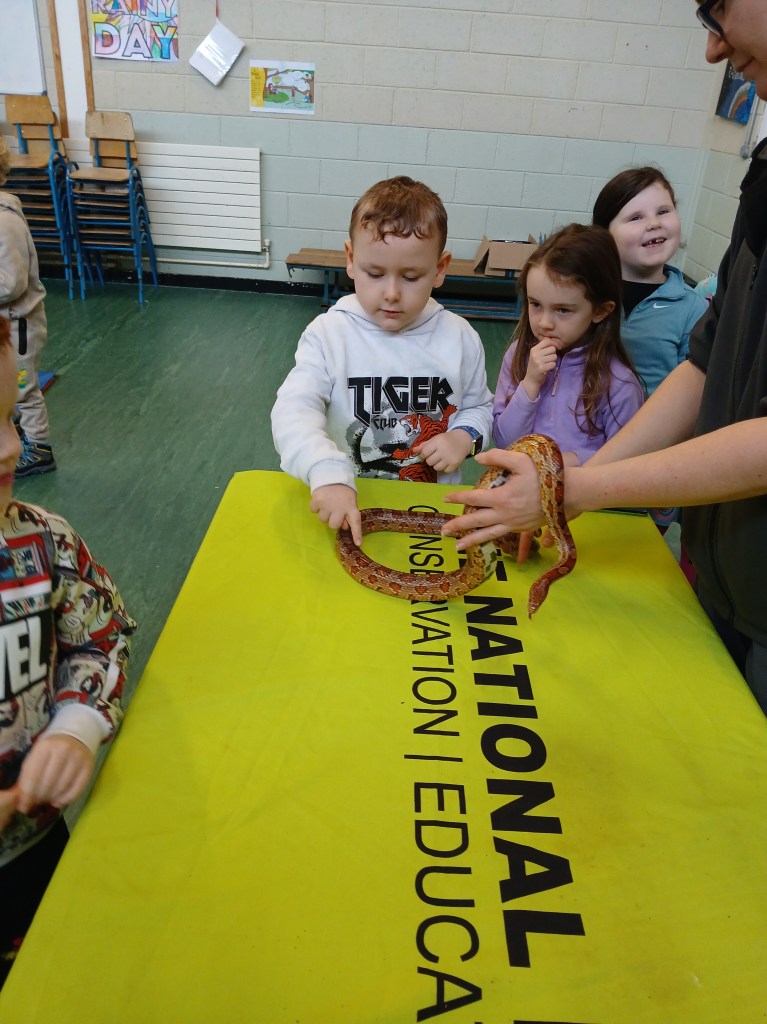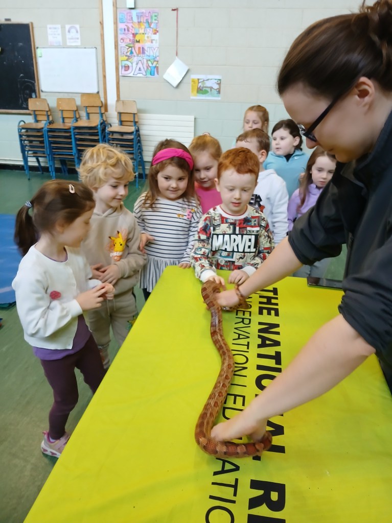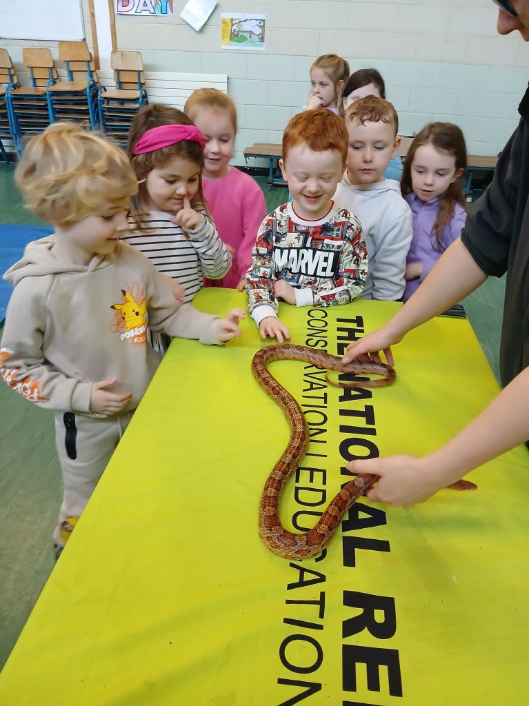 A friendly email from a junior infant parent ensured that the entire school benefited from the generous actions of Ms. Walsh who kindly arranged for the National Reptile Zoo to visit all the boys and girls in Piercestown National School. The junior end got to meet some scaly friends during Science Week. What a brave bunch they were!
