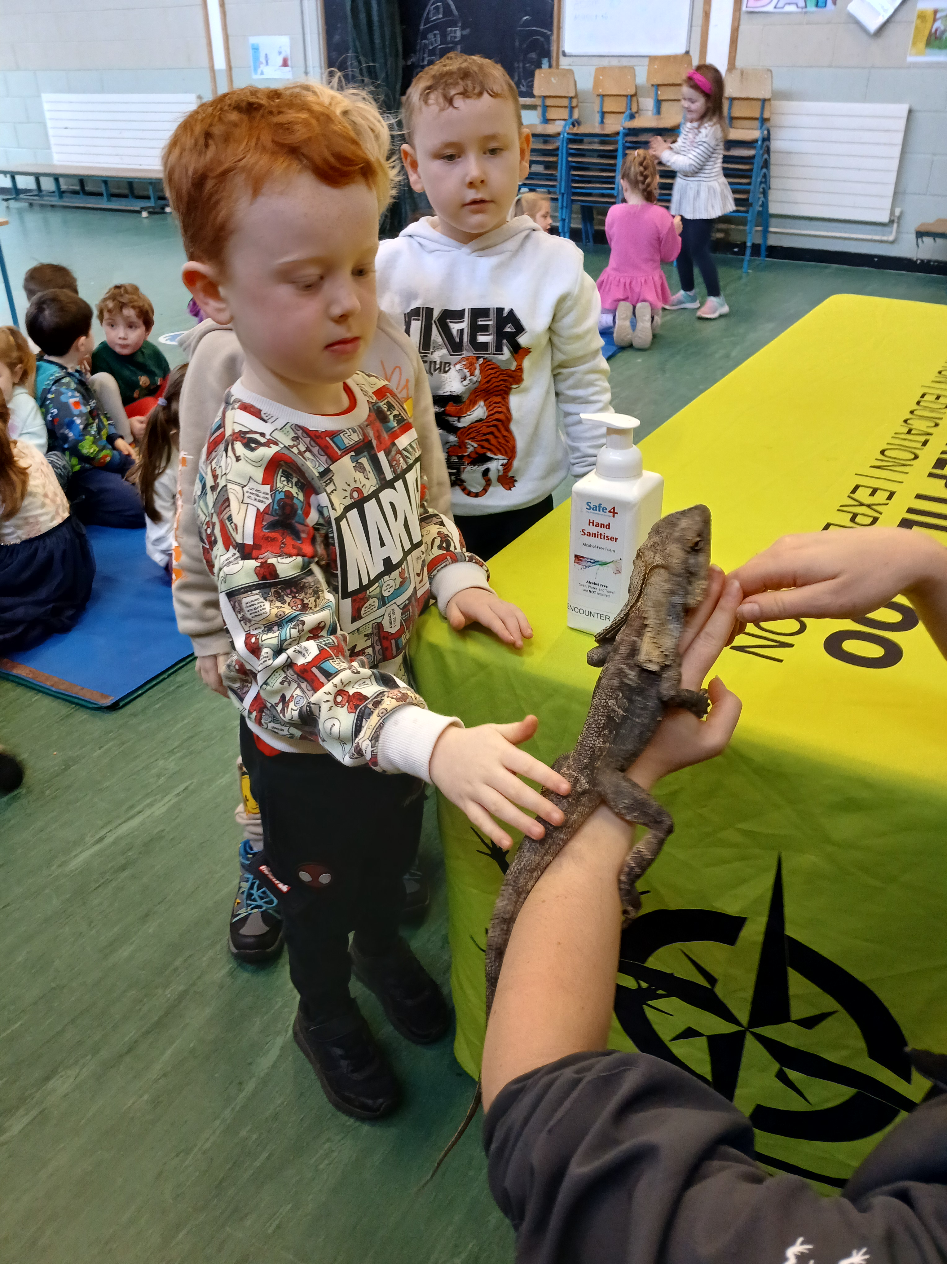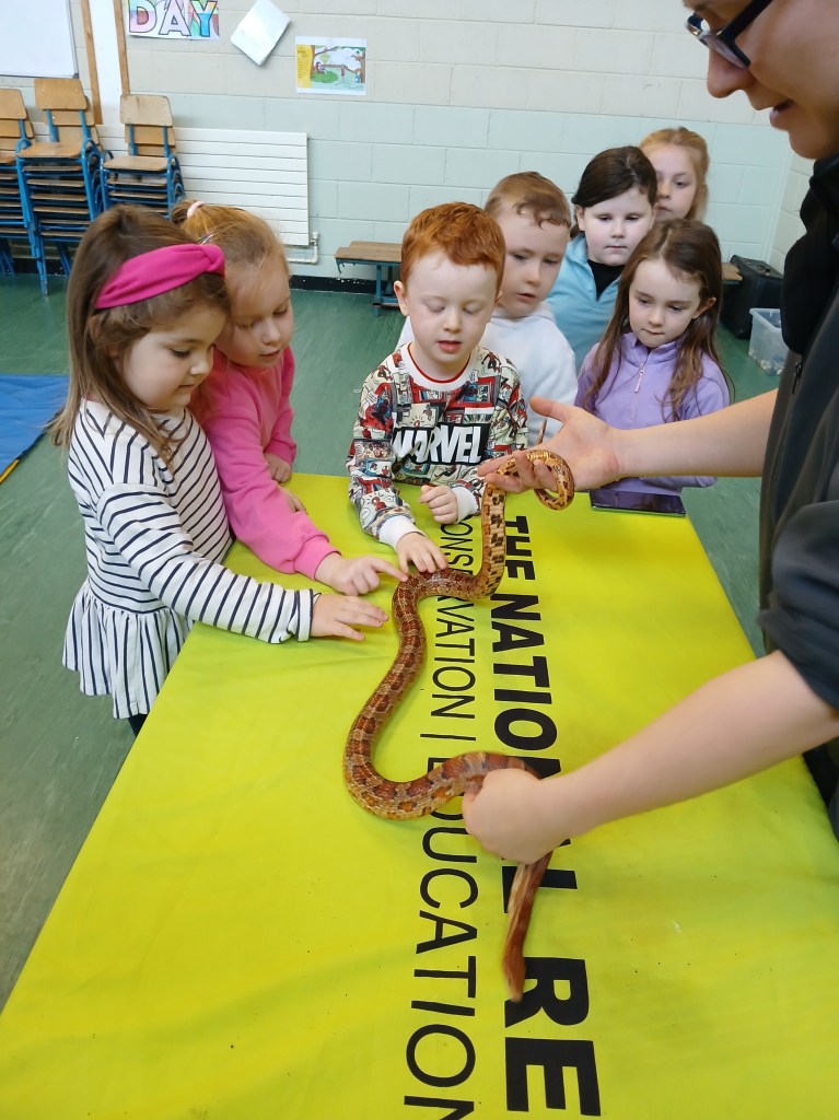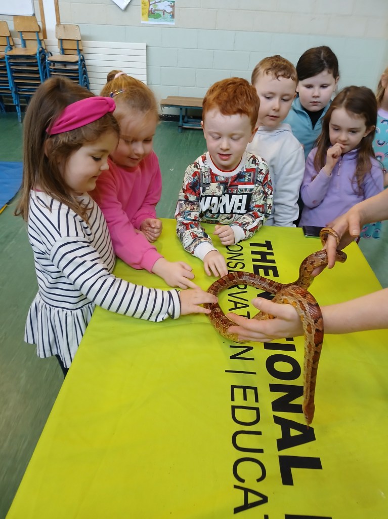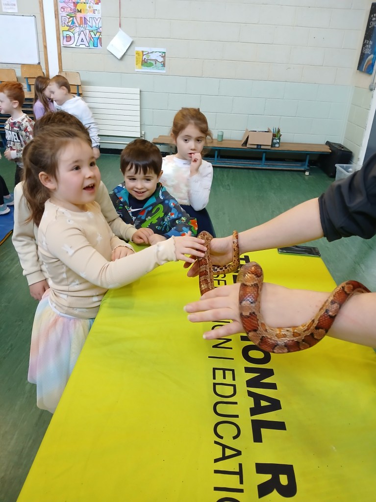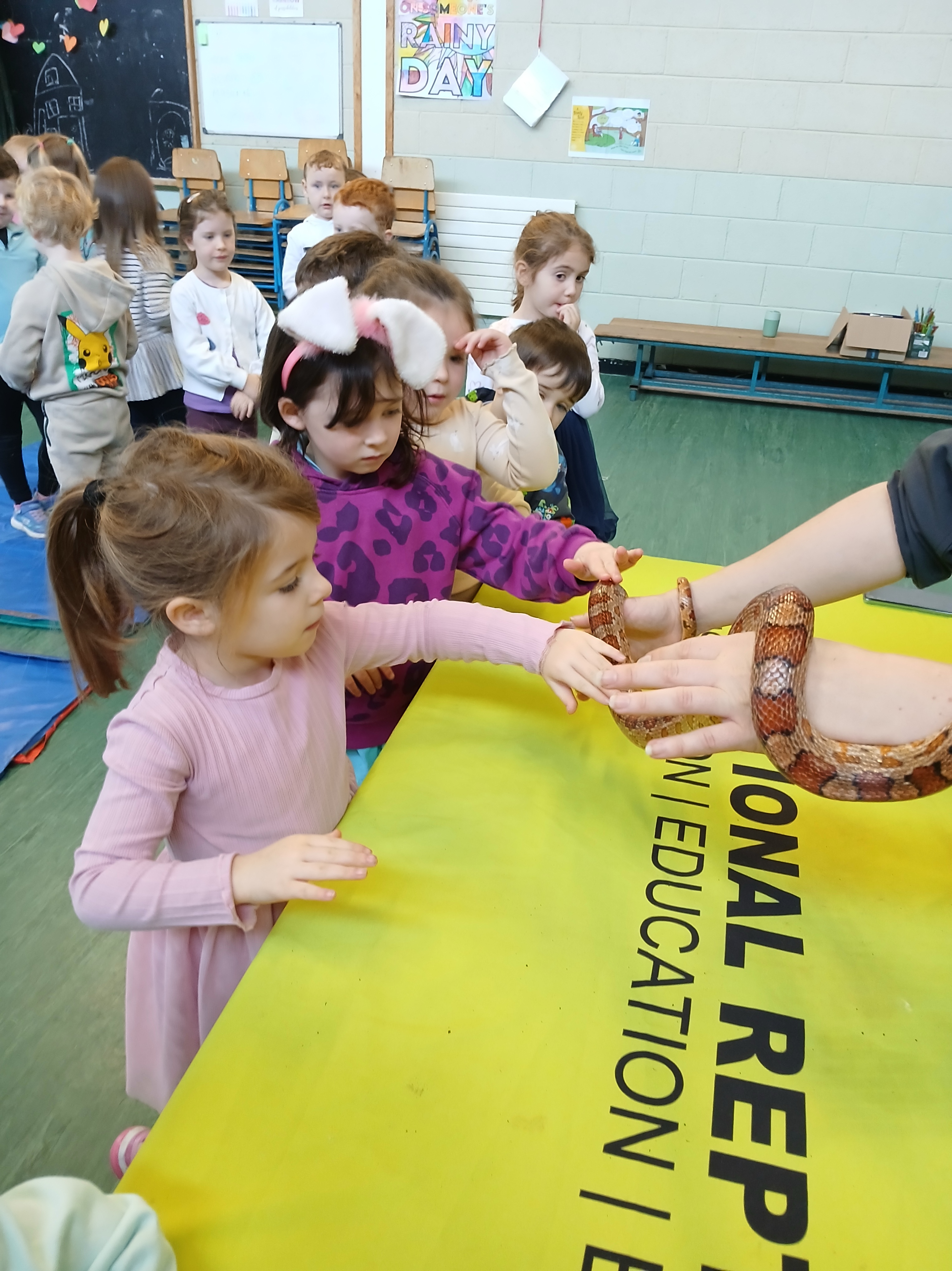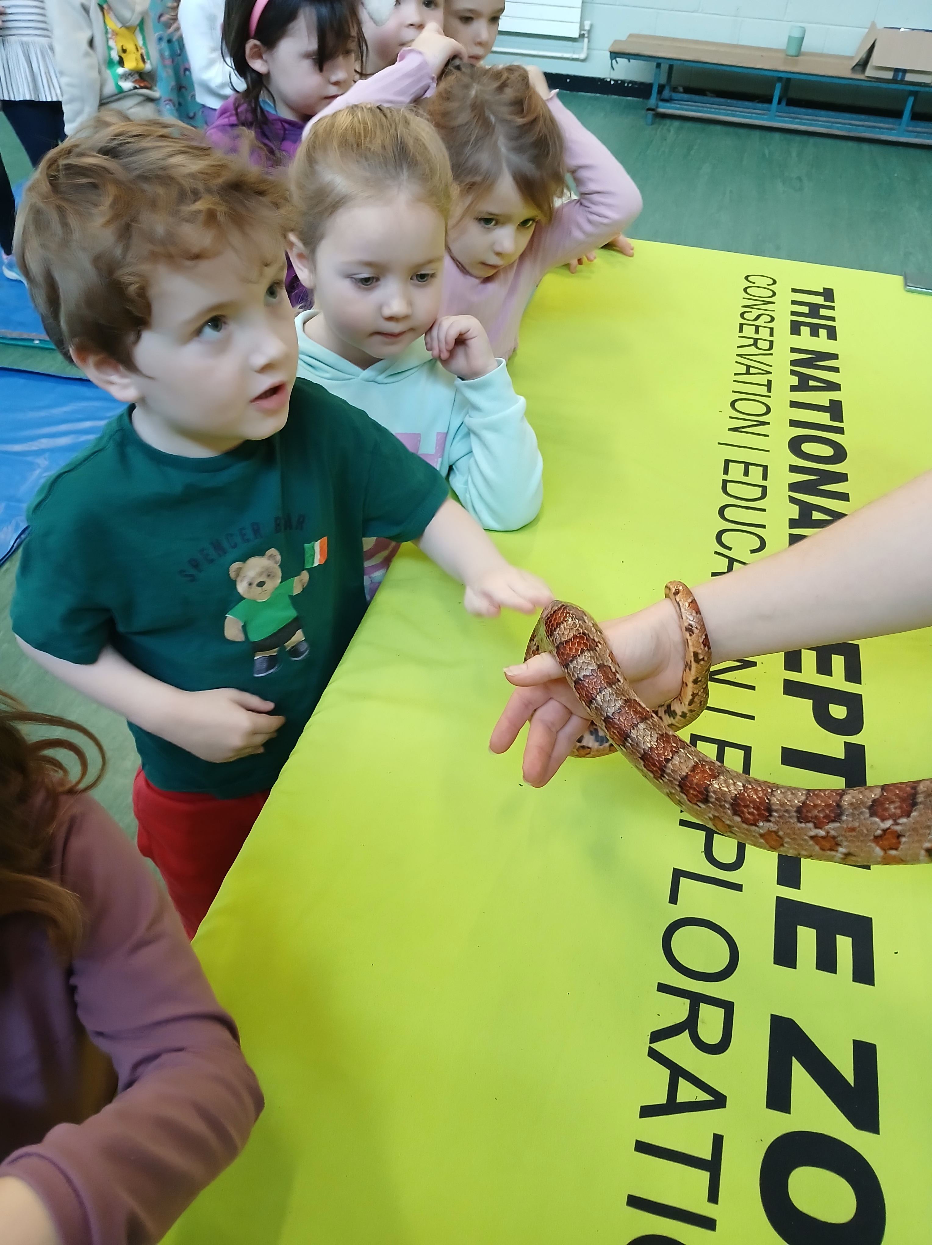 A friendly email from a junior infant parent ensured that the entire school benefited from the generous actions of Ms. Walsh who kindly arranged for the National Reptile Zoo to visit all the boys and girls in Piercestown National School. The junior end got to meet some scaly friends during Science Week. What a brave bunch they were!