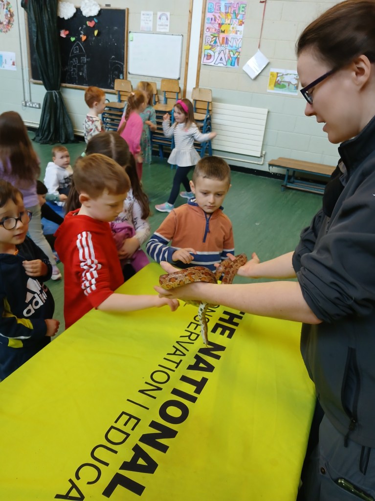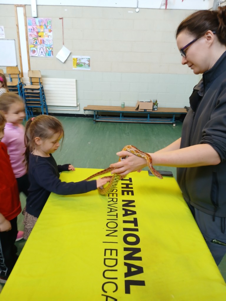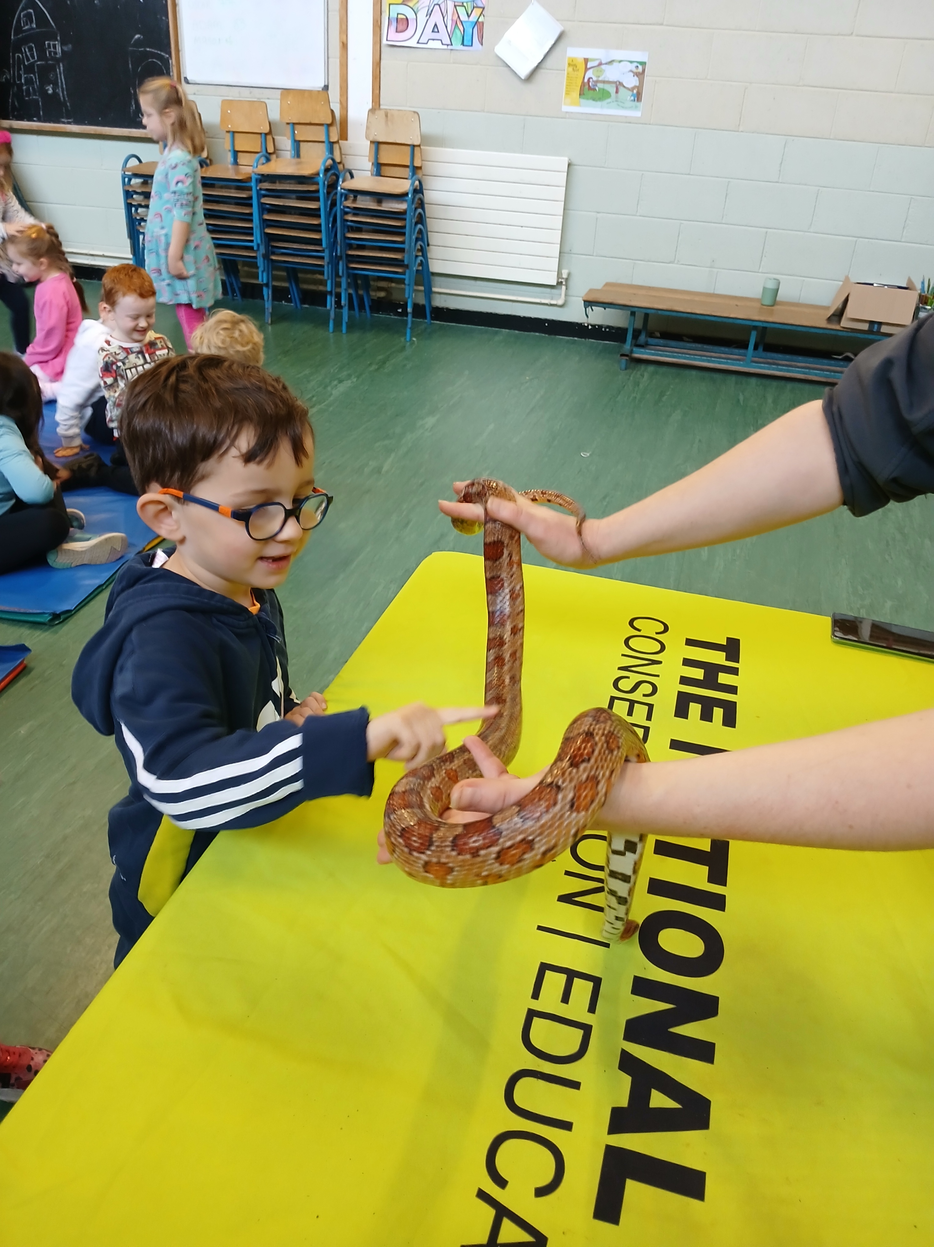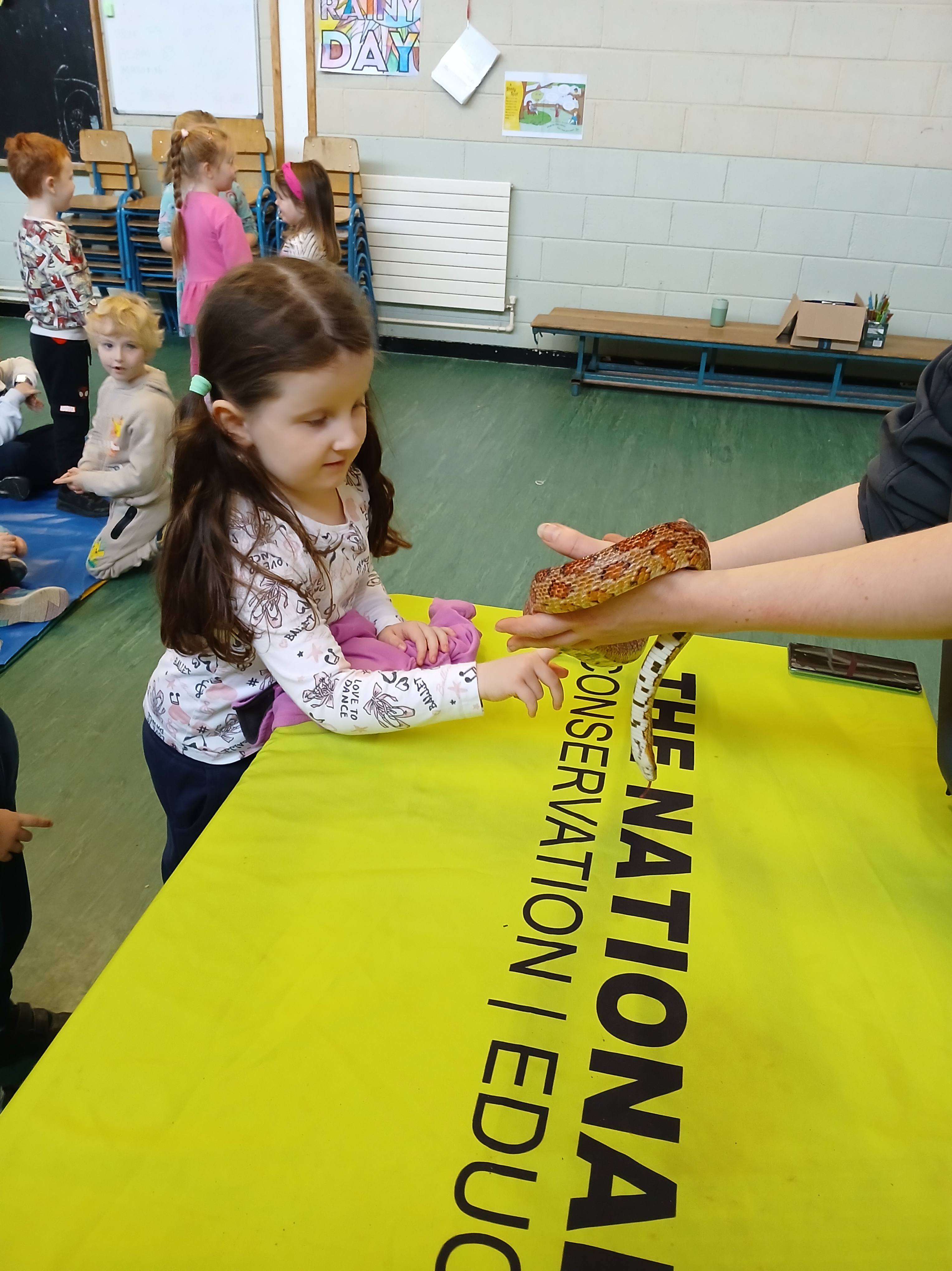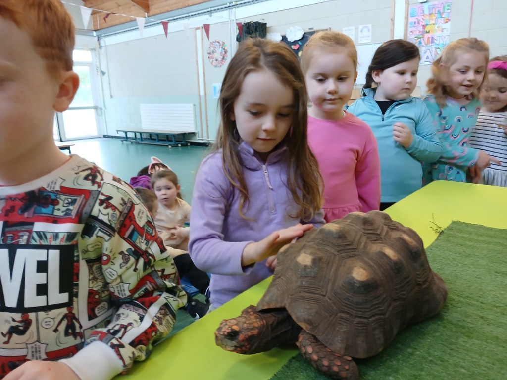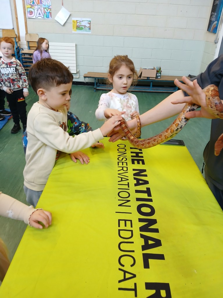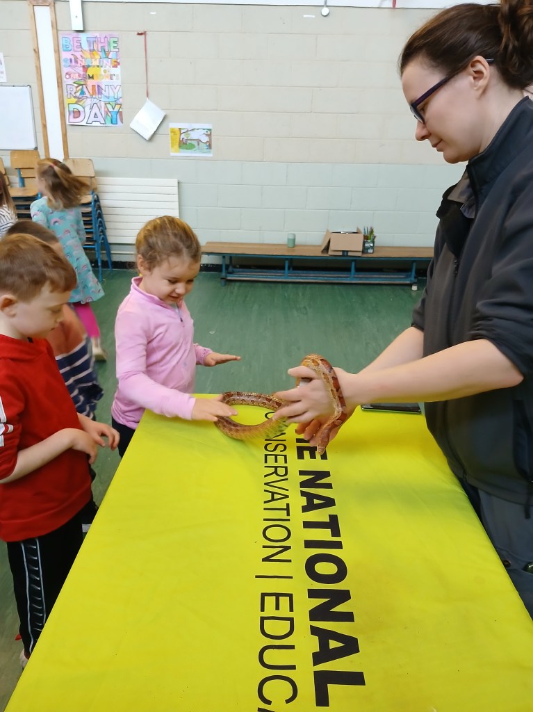 A friendly email from a junior infant parent ensured that the entire school benefited from the generous actions of Ms. Walsh who kindly arranged for the National Reptile Zoo to visit all the boys and girls in Piercestown National School. The junior end got to meet some scaly friends during Science Week. What a brave bunch they were!