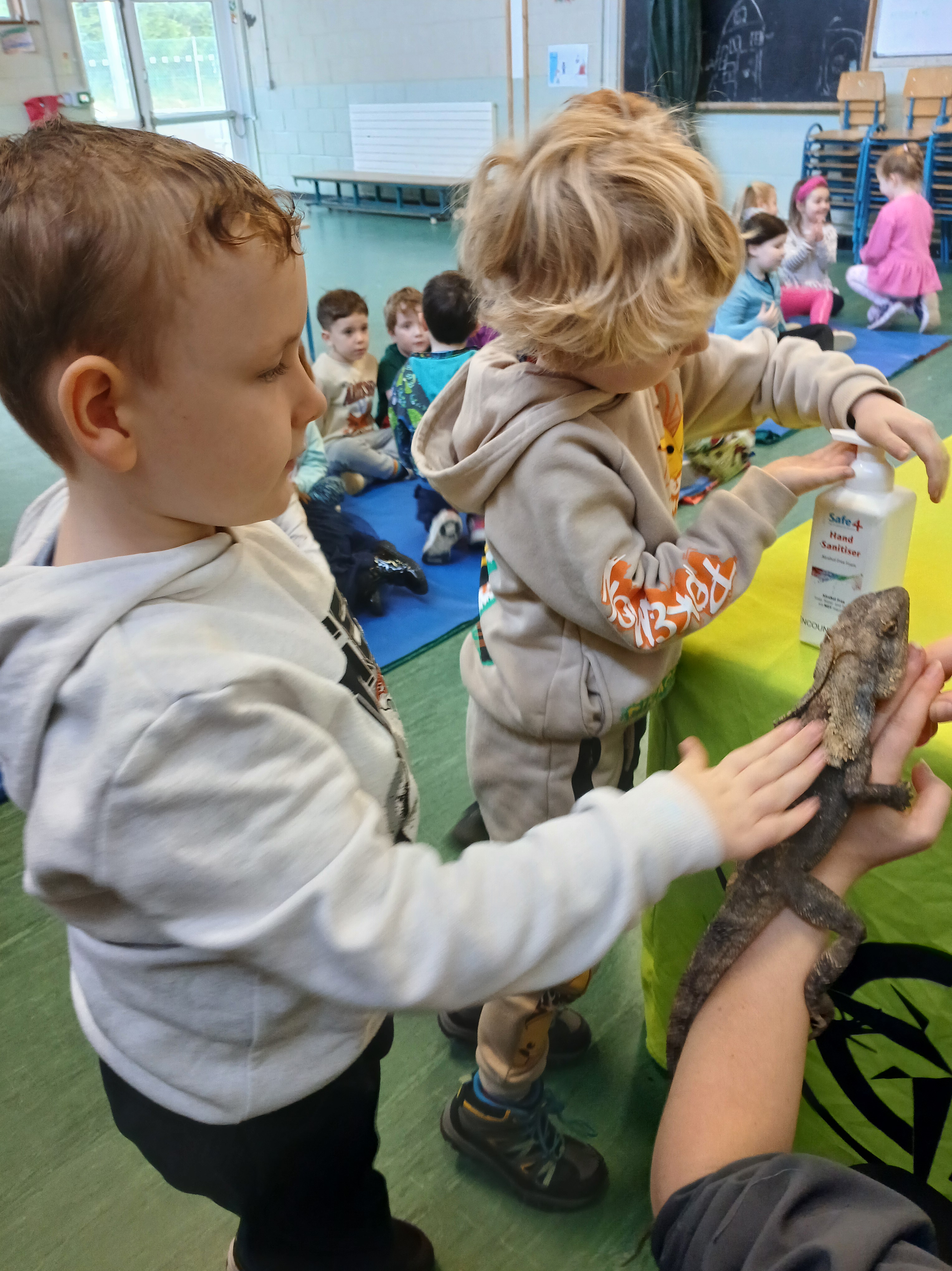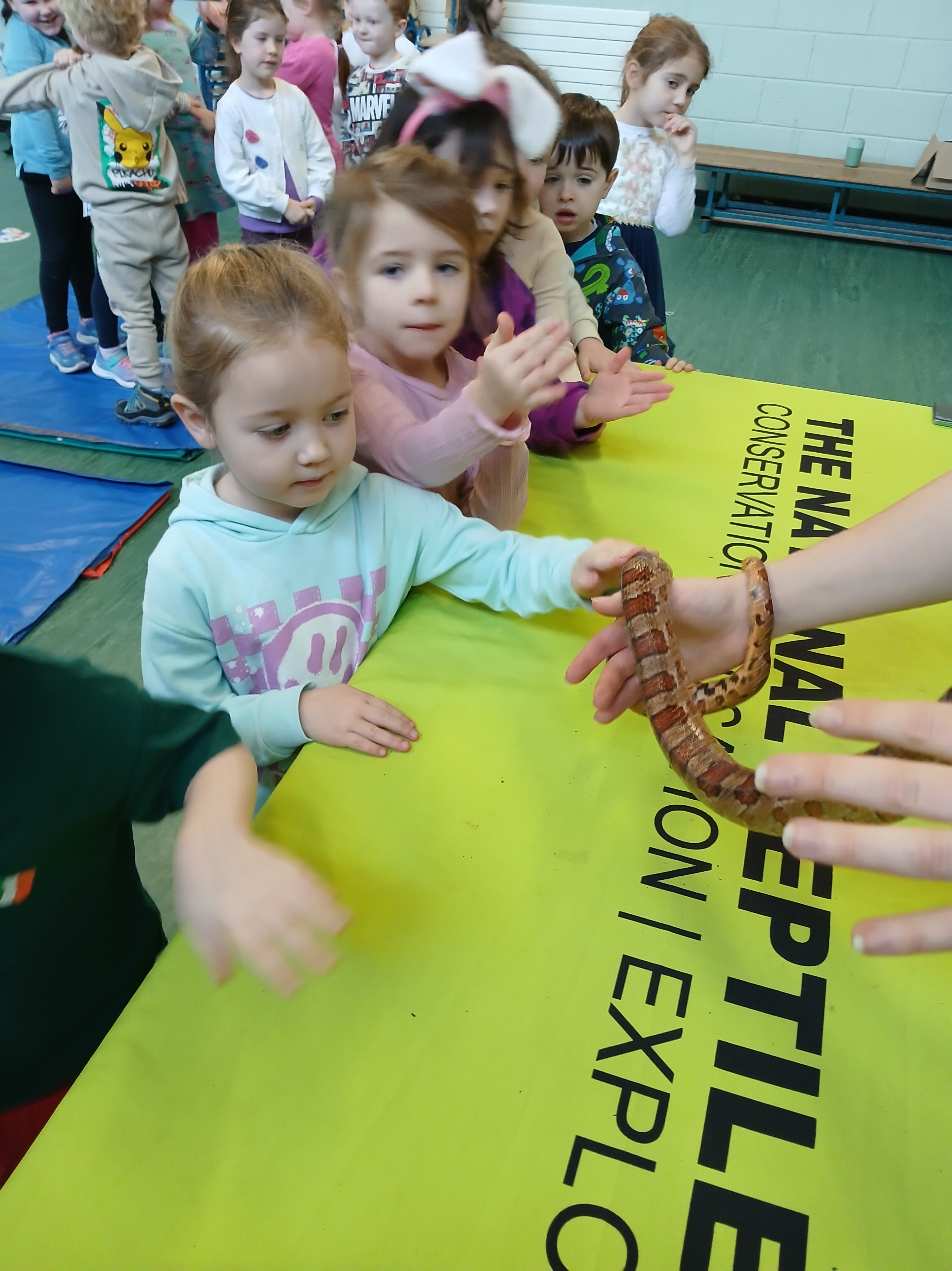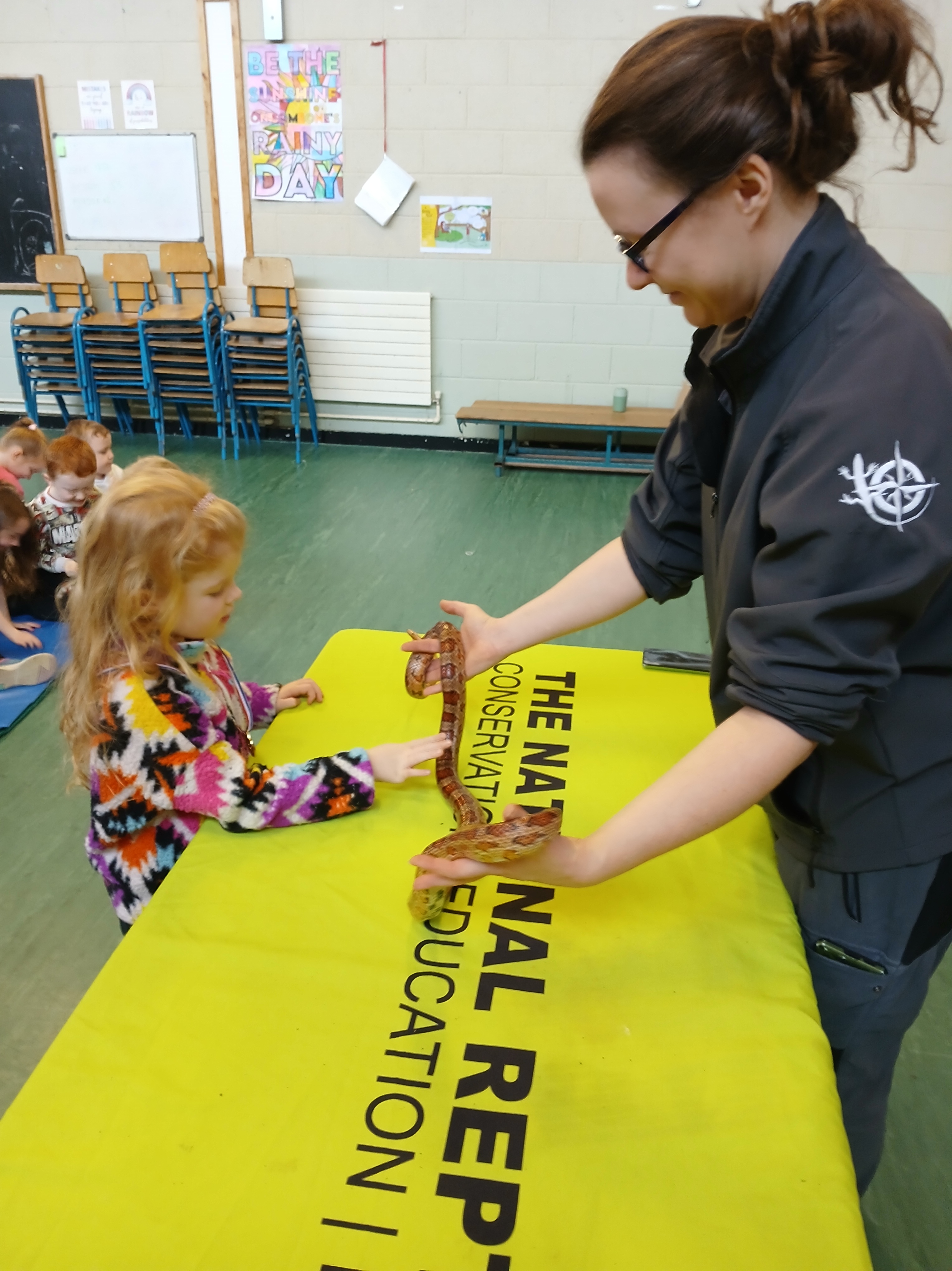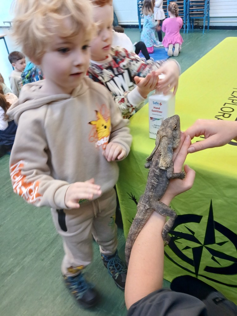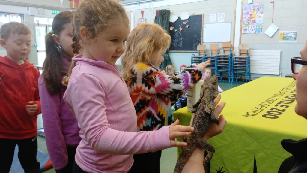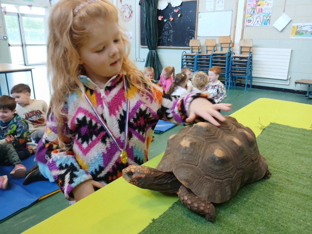 A friendly email from a junior infant parent ensured that the entire school benefited from the generous actions of Ms. Walsh who kindly arranged for the National Reptile Zoo to visit all the boys and girls in Piercestown National School. The junior end got to meet some scaly friends during Science Week. What a brave bunch they were!