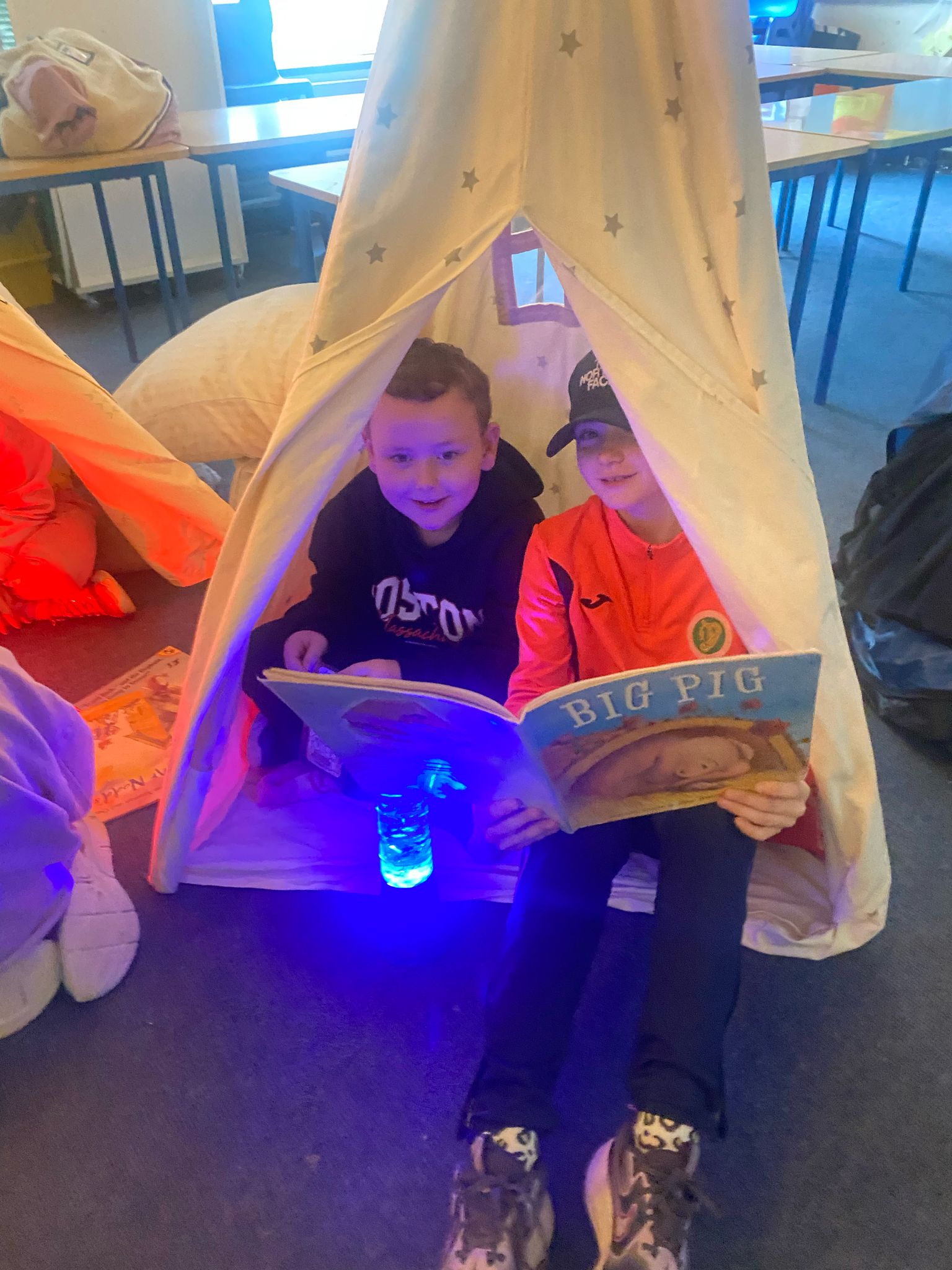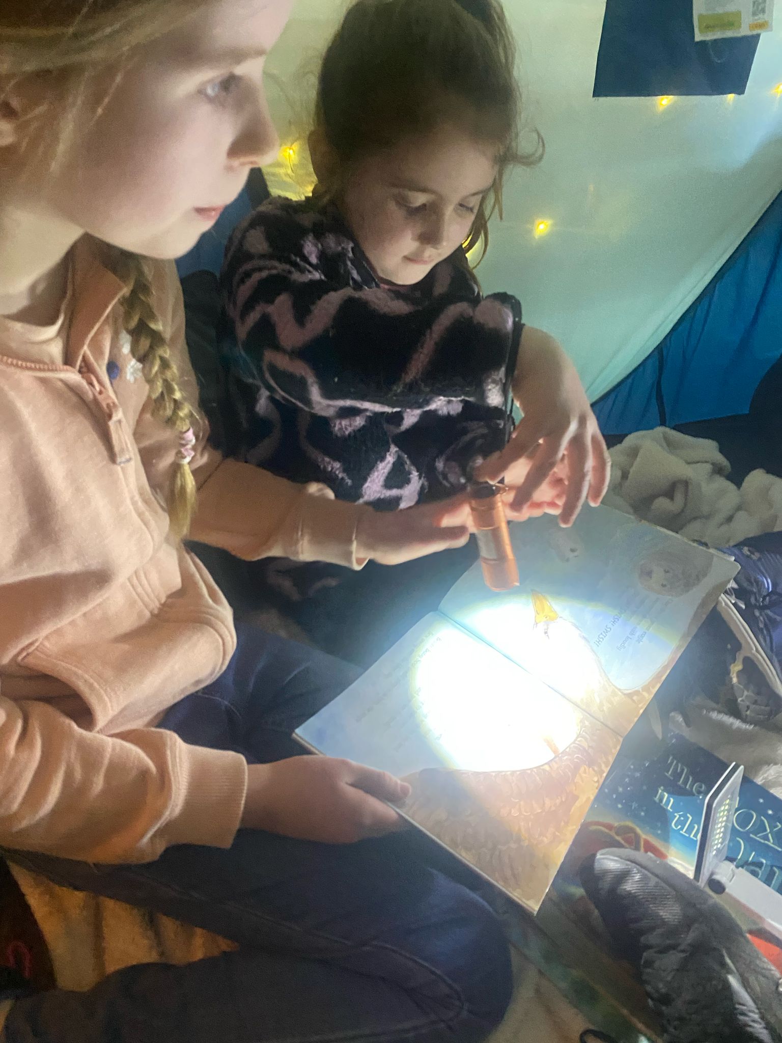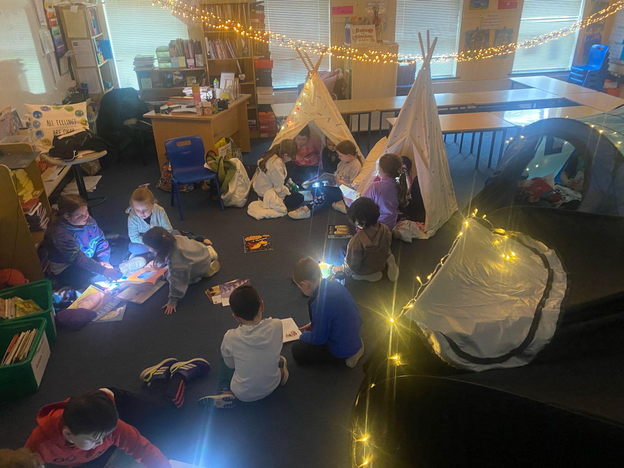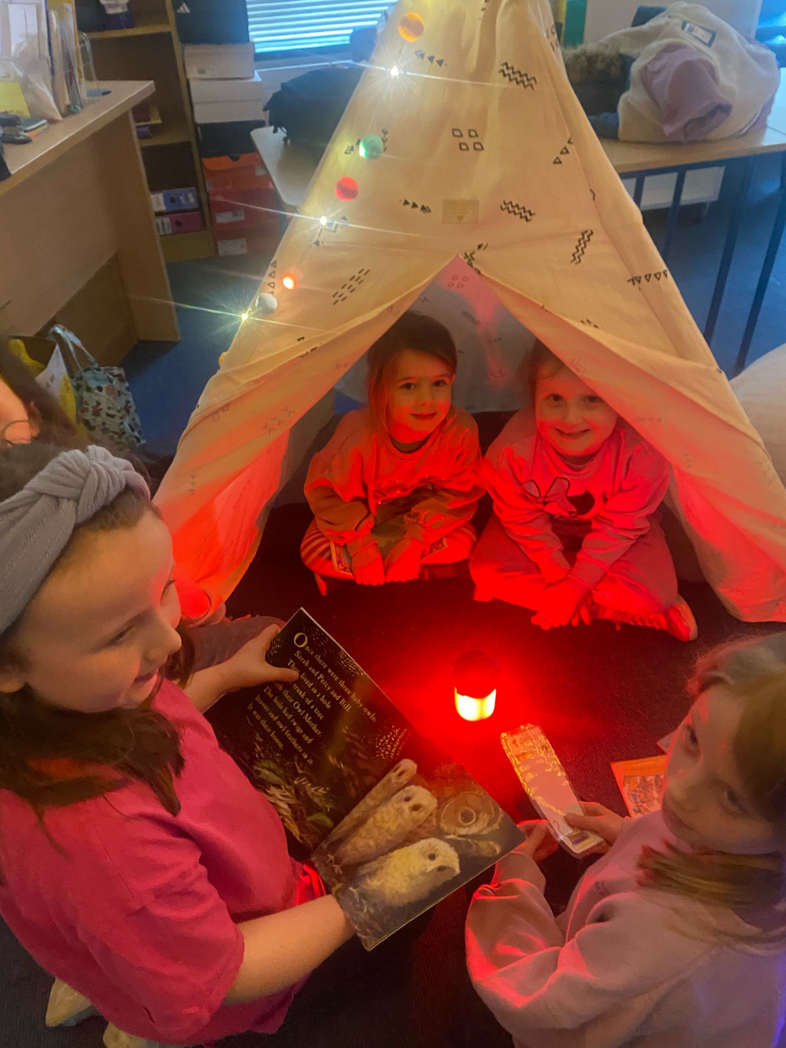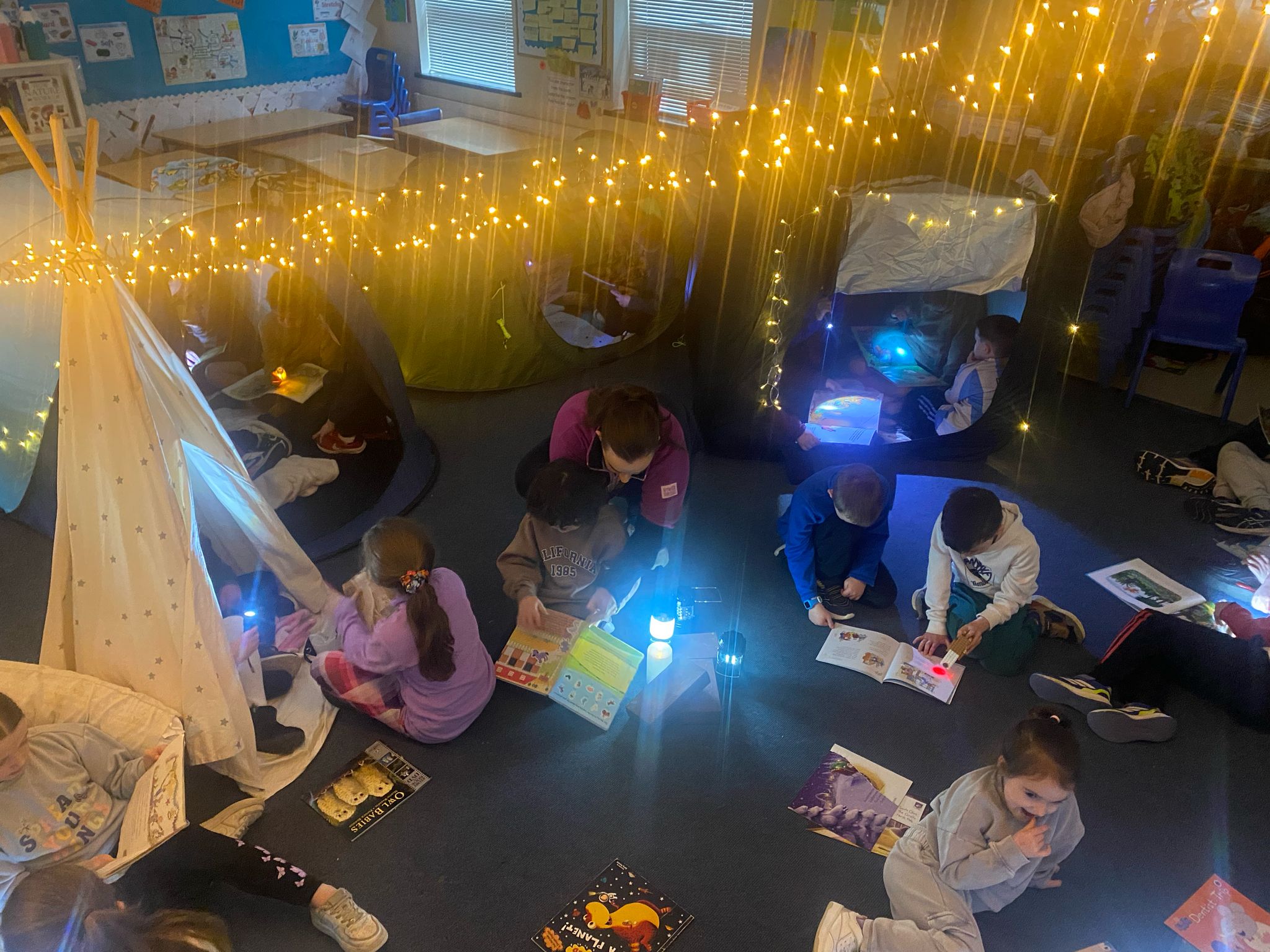 Picture this: tents set up throughout the room, soft torchlight flickering across the pages of storybooks, casting a warm glow on the eager faces of the young listeners. The 3rd class students took on the role of storytellers, reading aloud to their younger peers with excitement and passion. The use of torchlight made it feel as though the children were embarking on a magical journey into the heart of the story, with every word creating a sense of wonder.