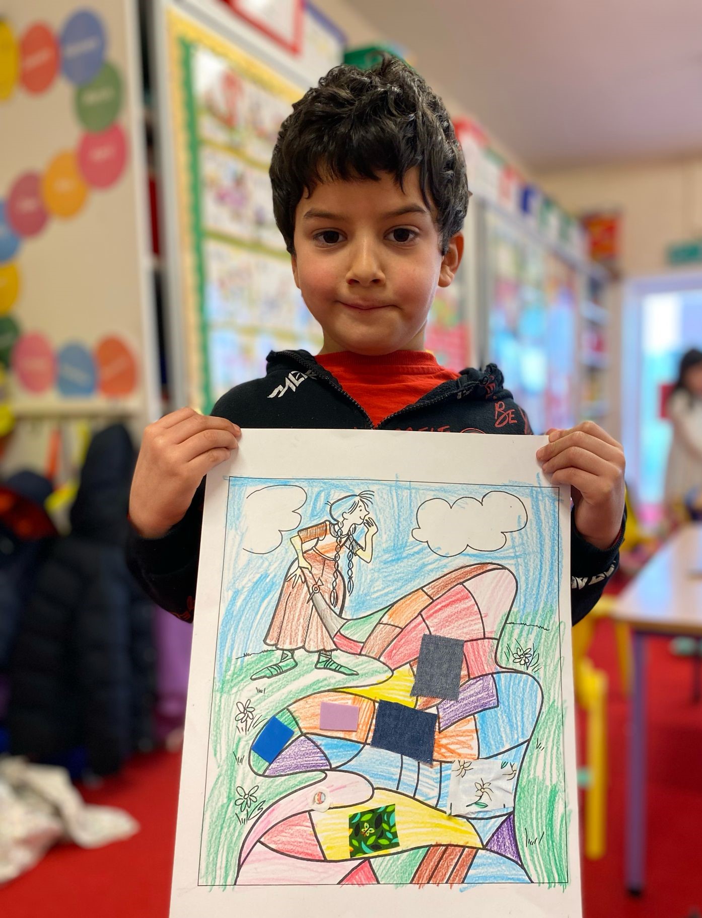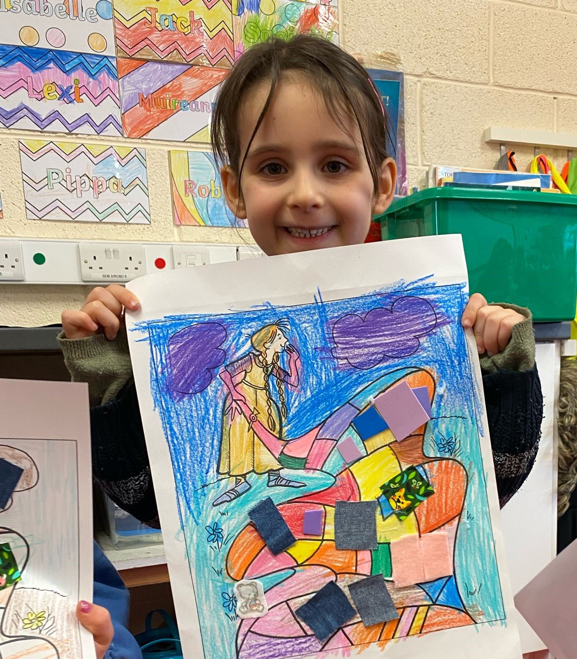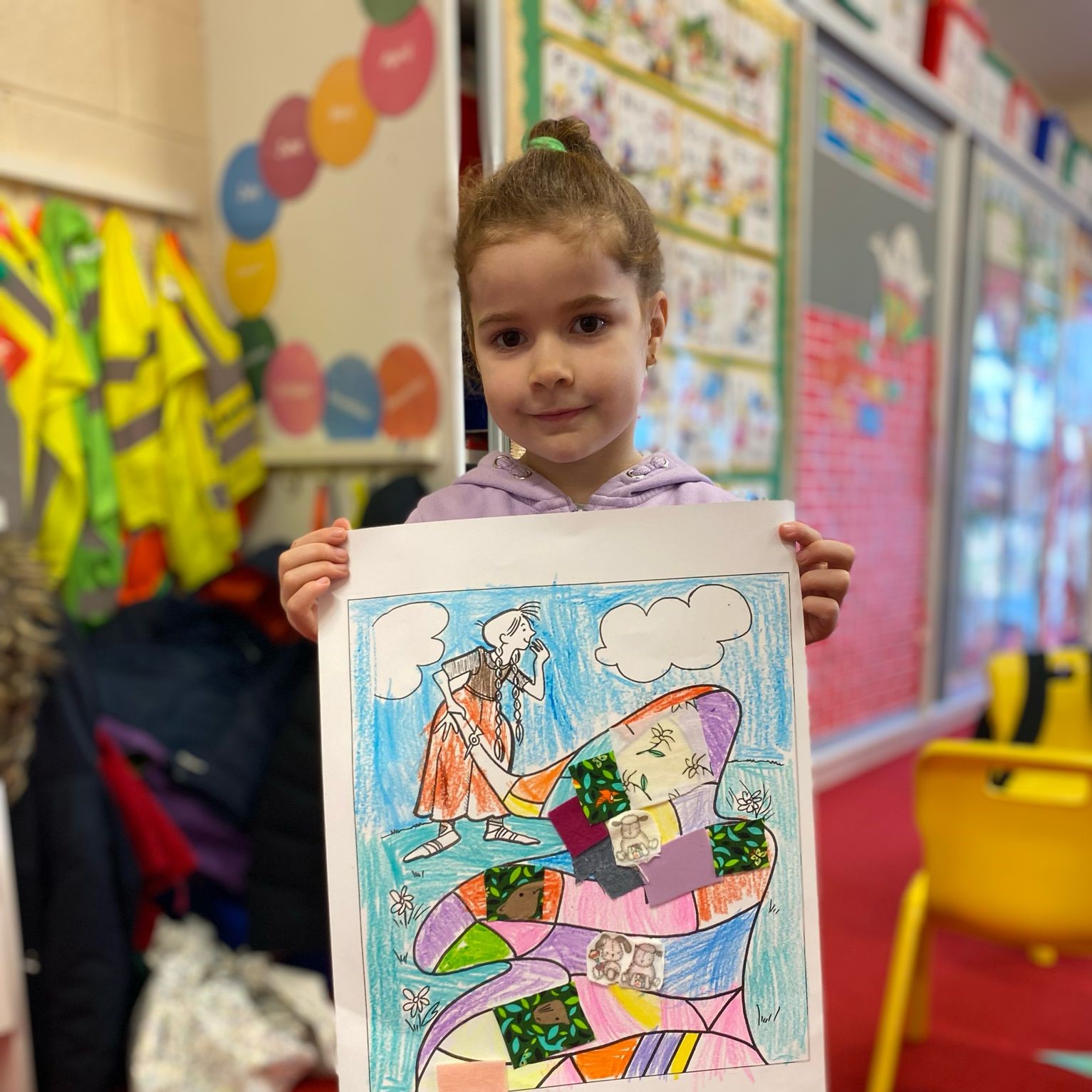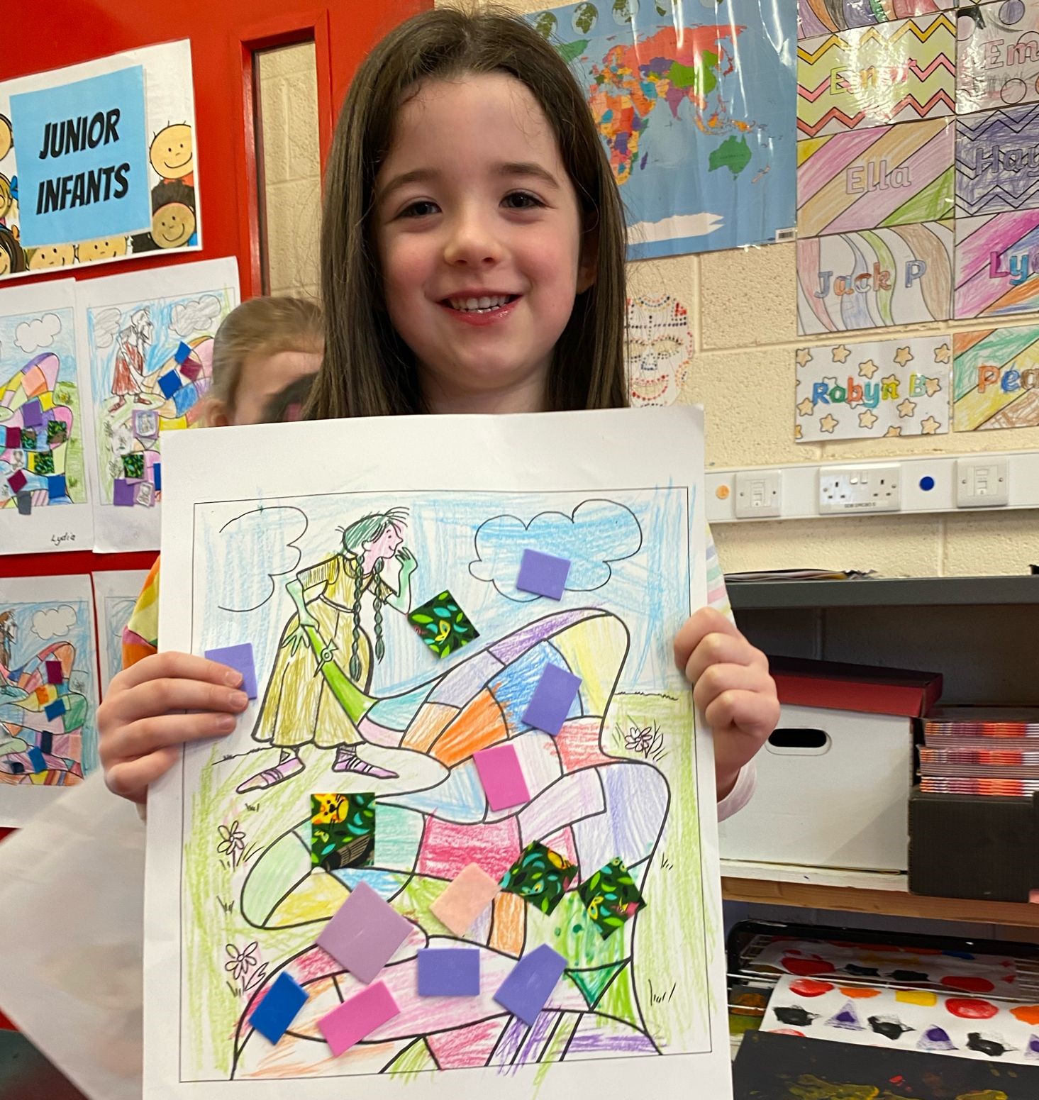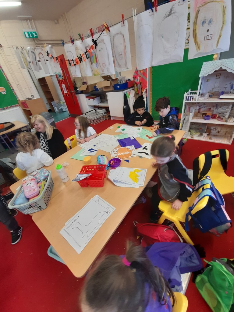 Junior Infants immersed themselves in the history and traditions of Saint Brigid today to celebrate her feast day. They were enthralled in the story of her cloak and loved decorating their own with colours and fabrics.
