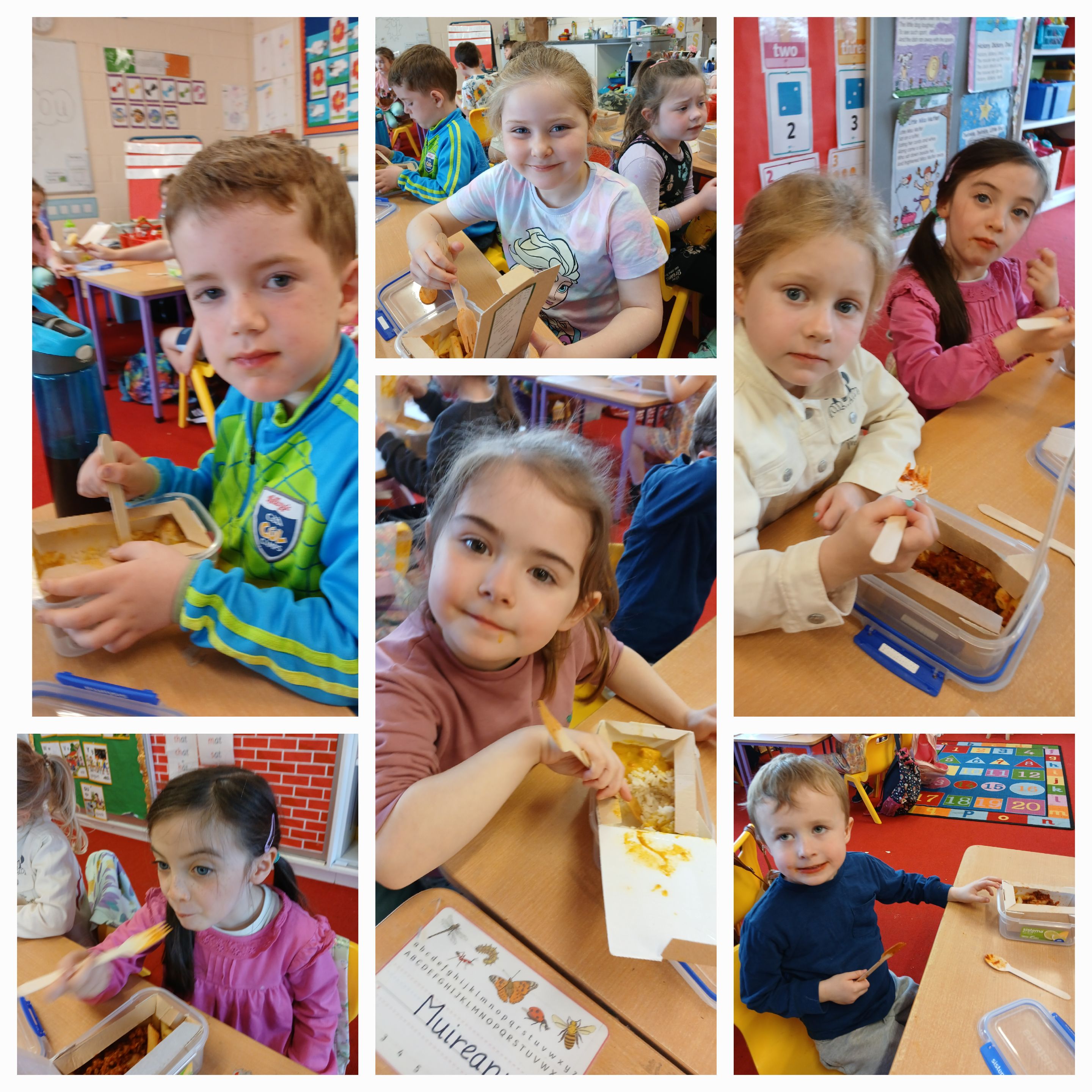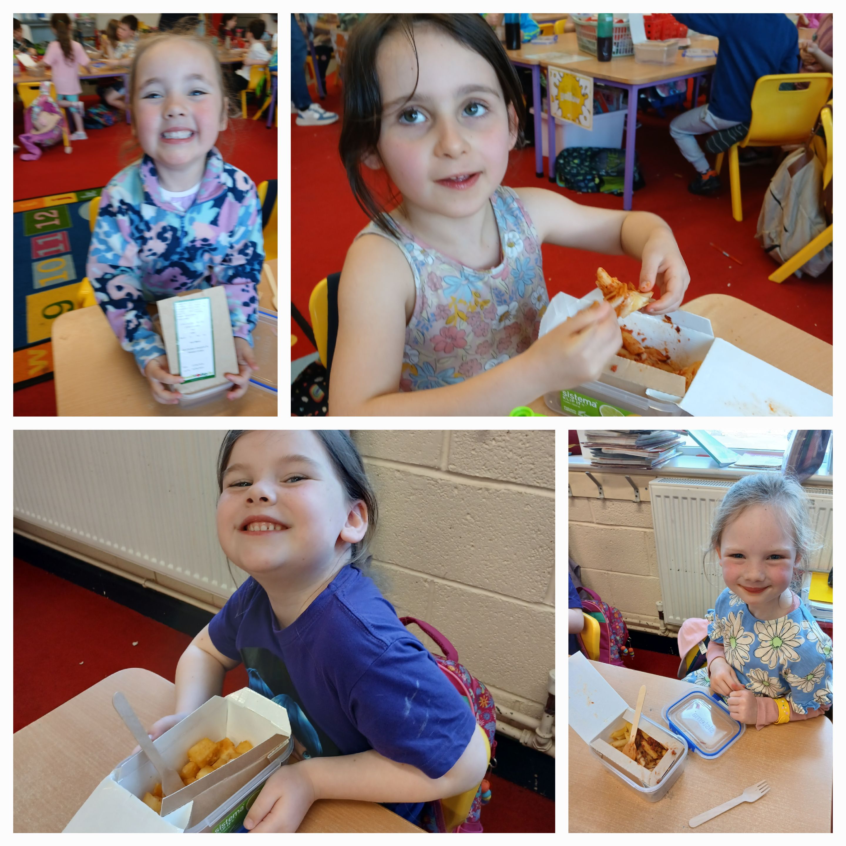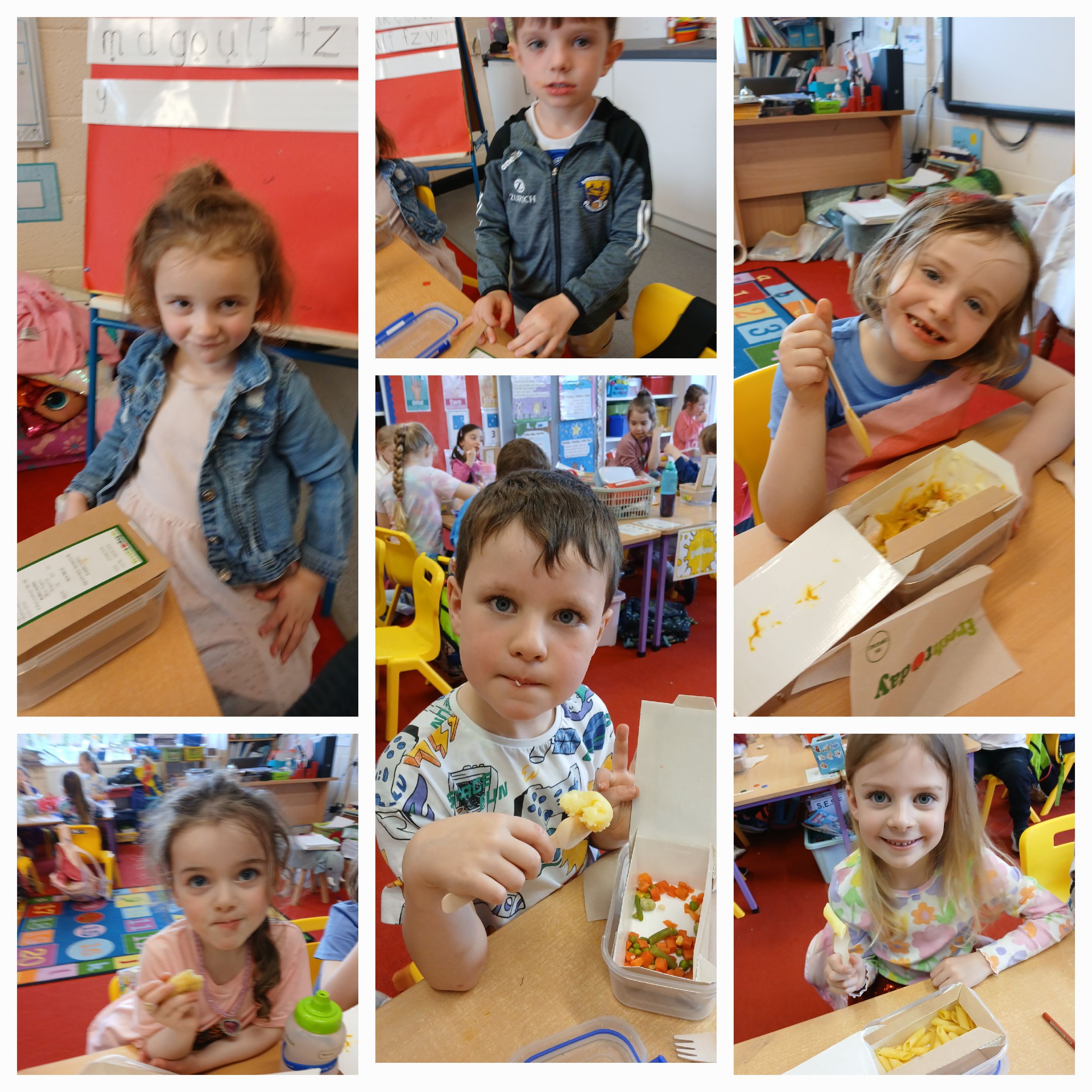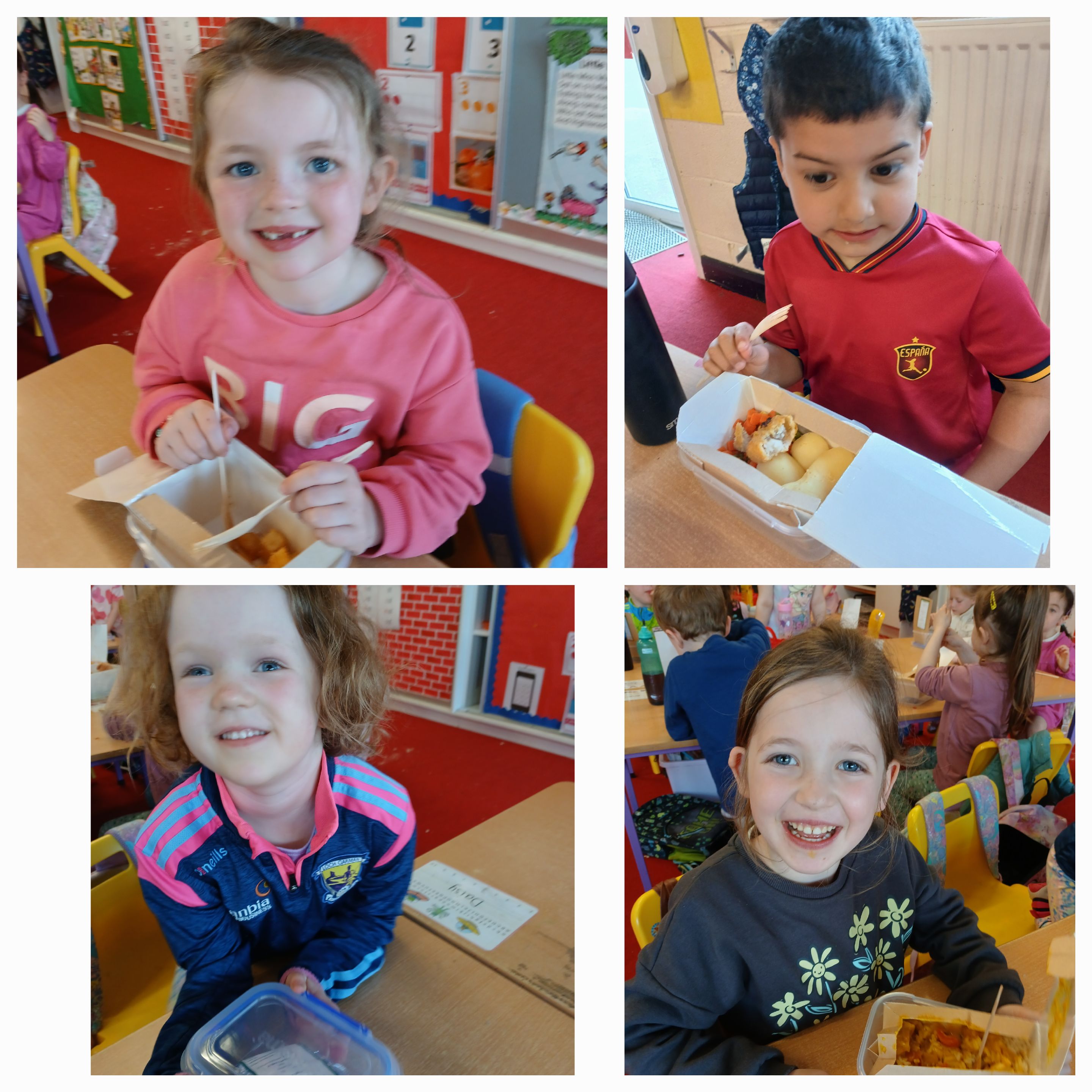 Thankfully Elizabeths’s version of events wasn’t what the children in Junior Infants experienced when they received their very first hot school lunch! It was (almost) smiles all round and a huge thumbs up from them all. Hopefully the novelty won’t wear off and we will be sending them home with full bellies each day!