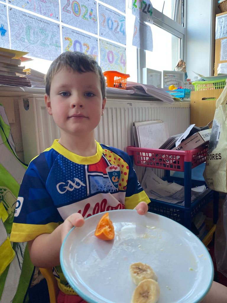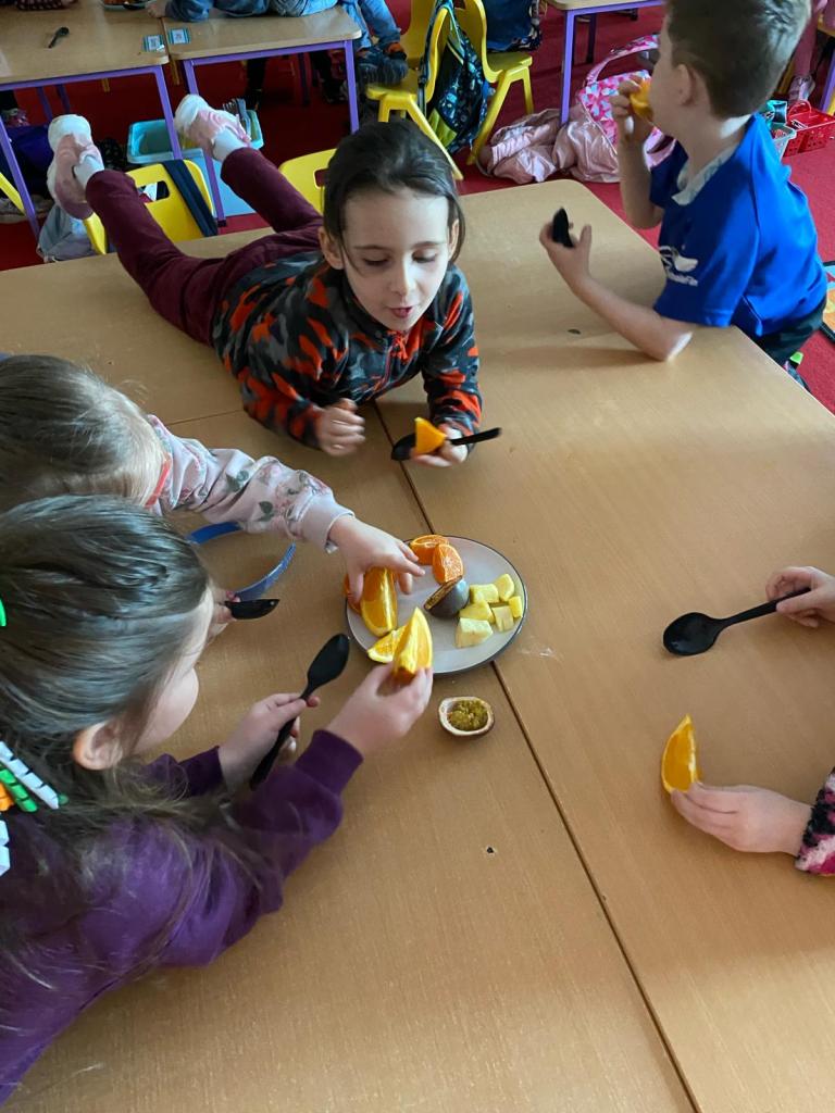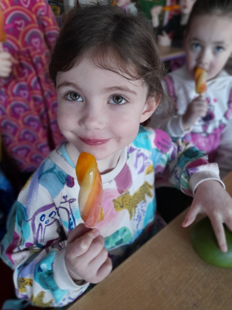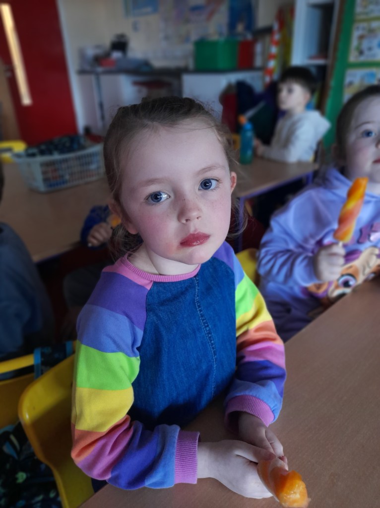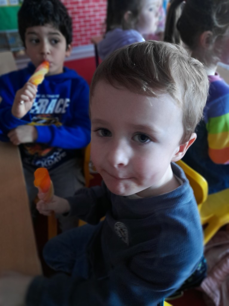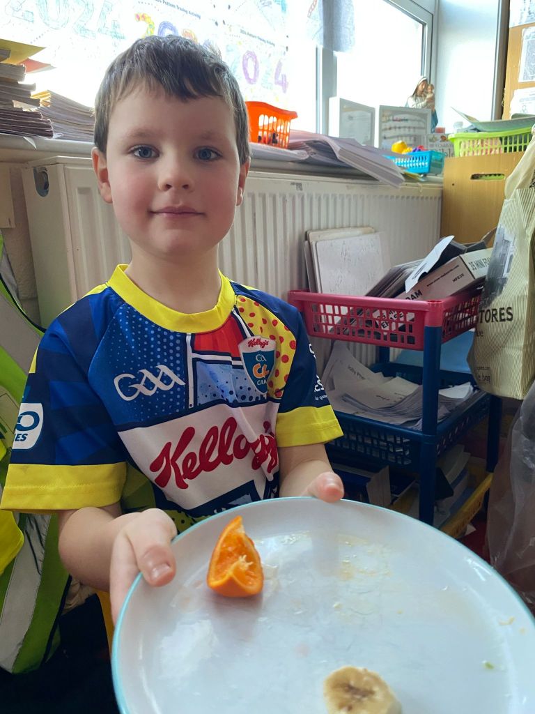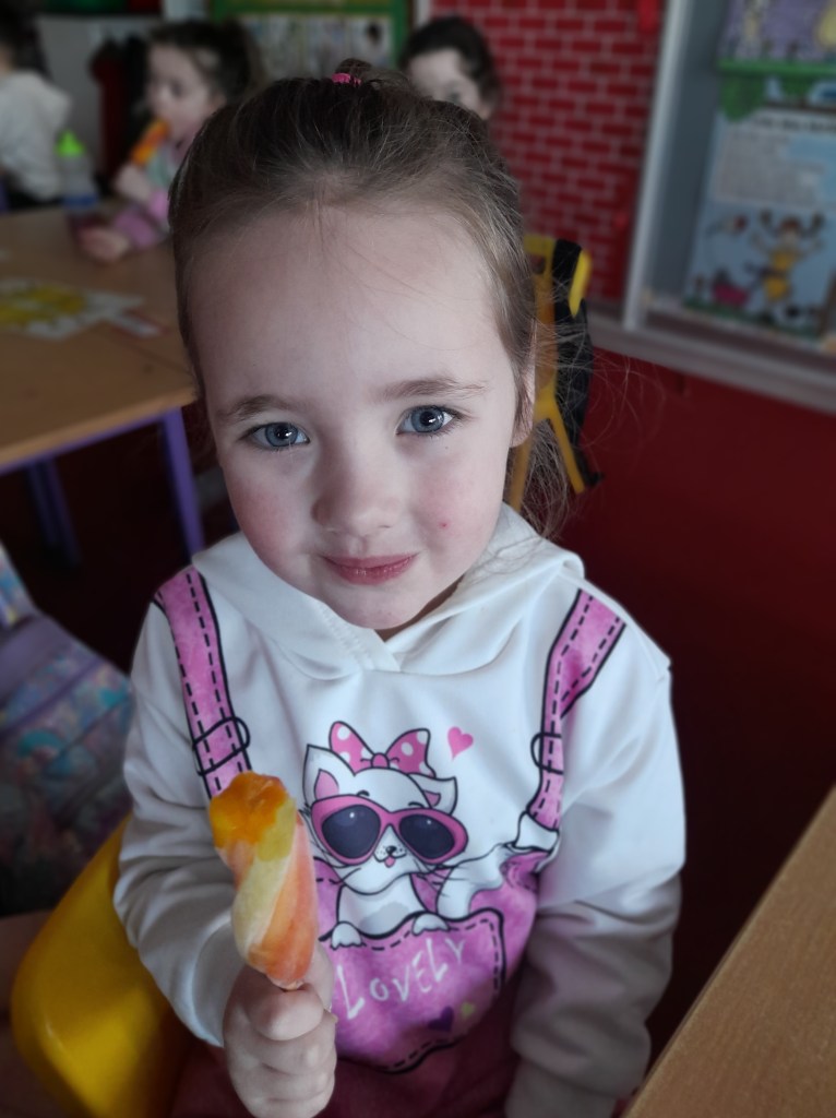 Junior Infants couldn’t read Handa’s Surprise and not sample the delicious fruits that appeared in the book! The book is about a girl called Handa who places seven different fruits in her basket and carries them to her friend Akeyo’s house. On the journey some very cheeky animals help themselves, one by one, to the fruits! Handa is very surprised to find that her basket is full of tangerines by the time she reaches Akeyo’s house rather than the variety of fruits that she started with! Many of the children have never tasted a real mango, avocado or passion fruit and were very curious as to what they looked, smelt and tasted like. So, as a surprise, the children had their very own fruit tasting session! It would seem that getting hold of a guava is very tricky and despite Mrs Larkin’s searching! Despite this, the children were amazed at the beautiful colours and smells within the fruits. They were more than happy with the extra surprise at the end…an ice-pop containing many of the fruits they didn’t really like!