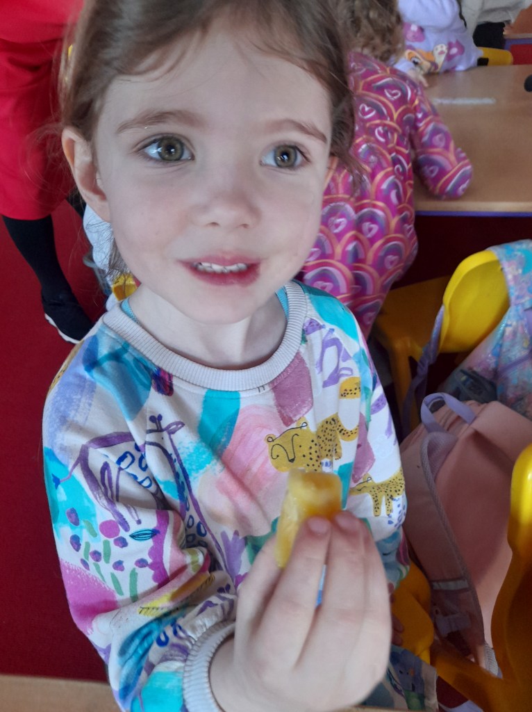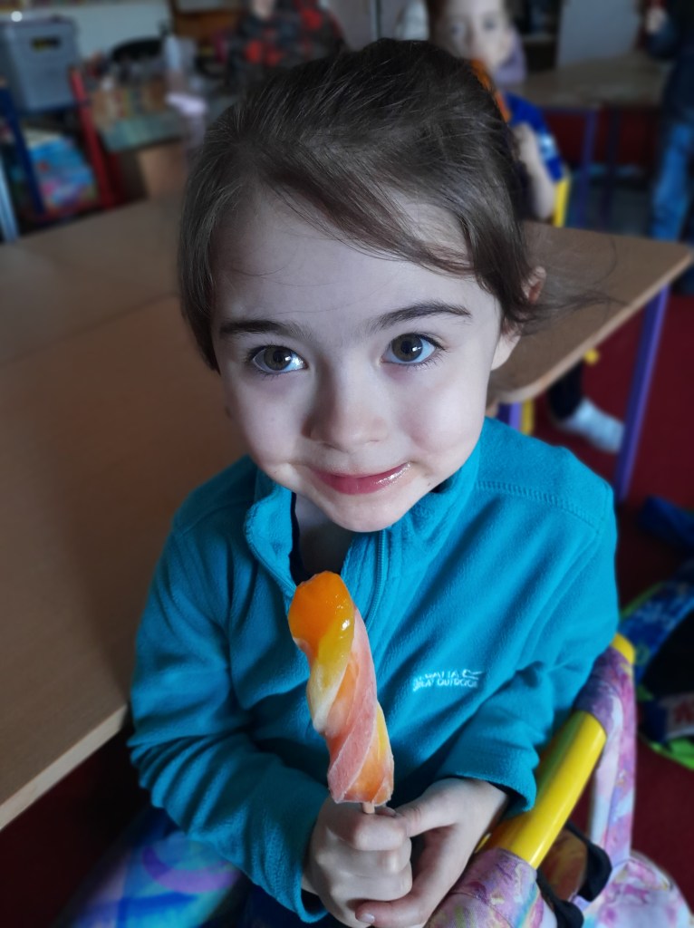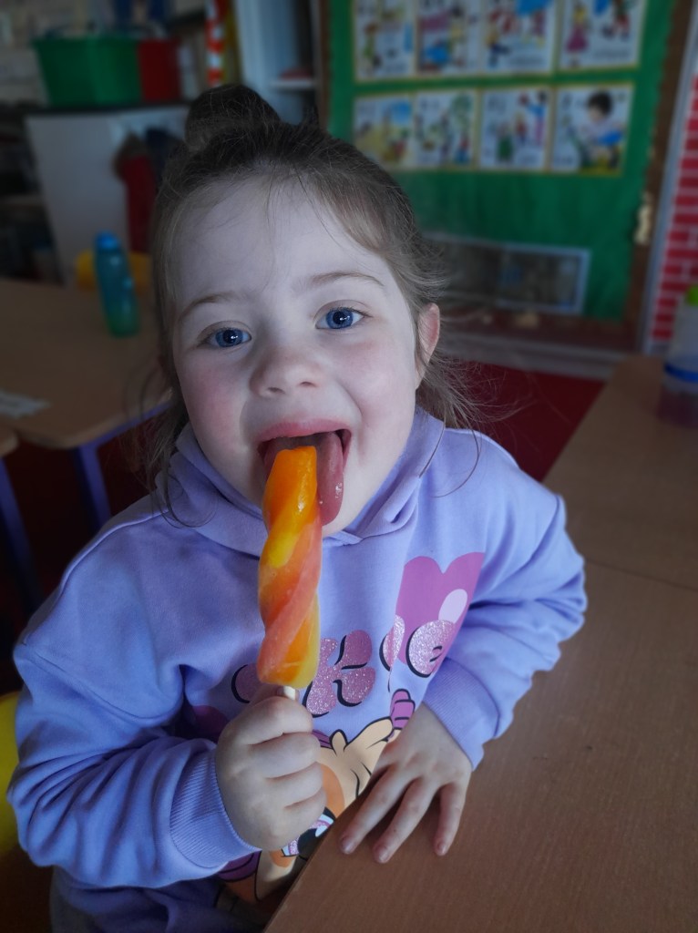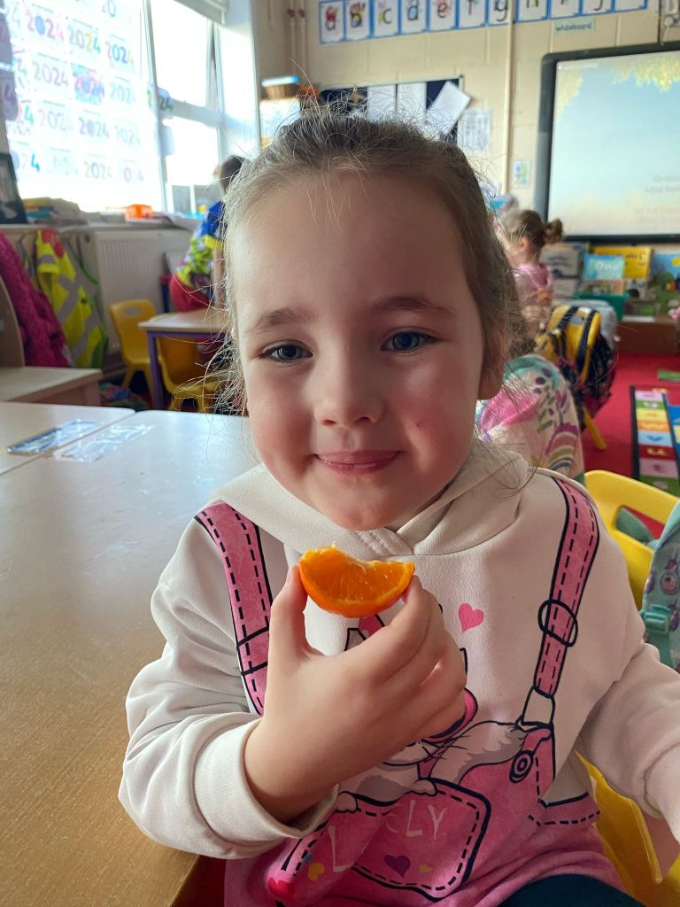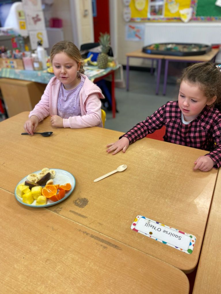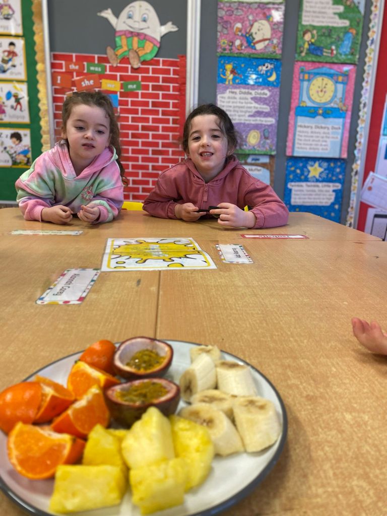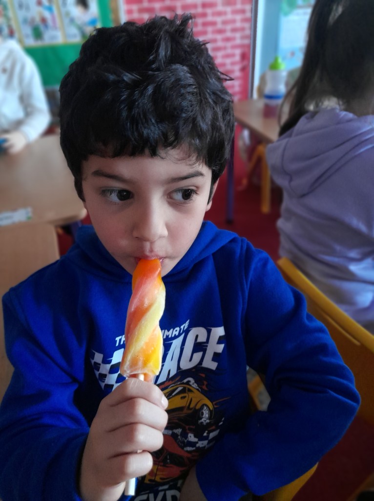 Junior Infants couldn’t read Handa’s Surprise and not sample the delicious fruits that appeared in the book! The book is about a girl called Handa who places seven different fruits in her basket and carries them to her friend Akeyo’s house. On the journey some very cheeky animals help themselves, one by one, to the fruits! Handa is very surprised to find that her basket is full of tangerines by the time she reaches Akeyo’s house rather than the variety of fruits that she started with! Many of the children have never tasted a real mango, avocado or passion fruit and were very curious as to what they looked, smelt and tasted like. So, as a surprise, the children had their very own fruit tasting session! It would seem that getting hold of a guava is very tricky and despite Mrs Larkin’s searching! Despite this, the children were amazed at the beautiful colours and smells within the fruits. They were more than happy with the extra surprise at the end…an ice-pop containing many of the fruits they didn’t really like!