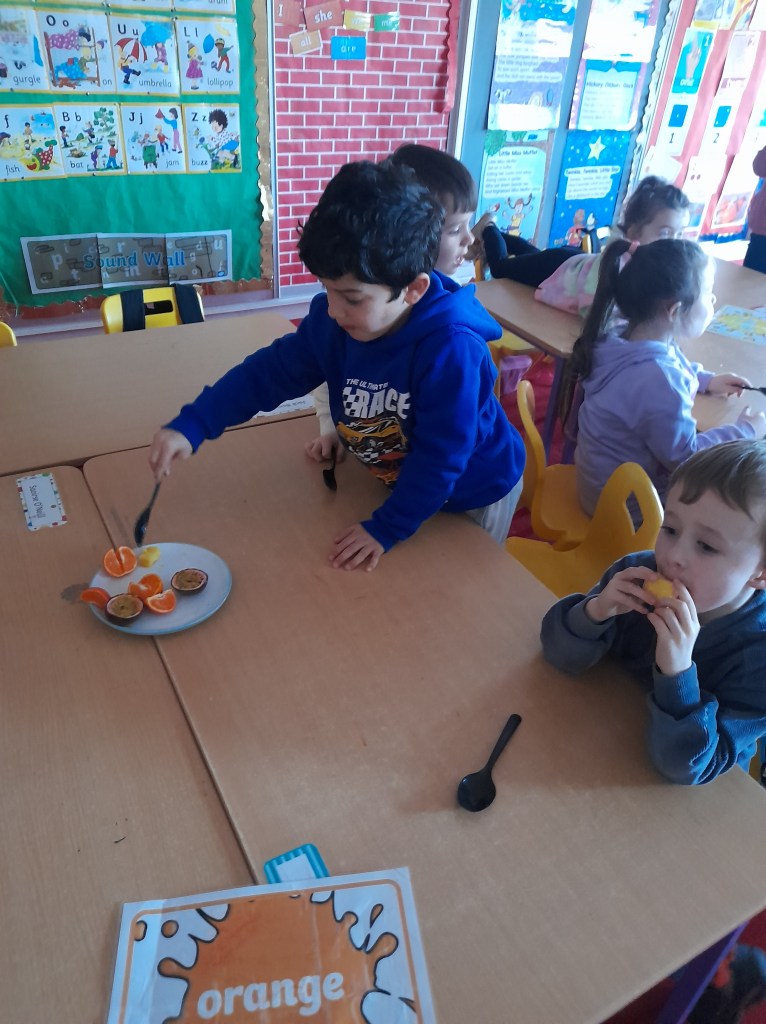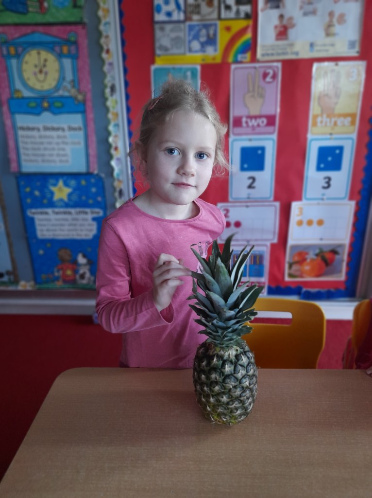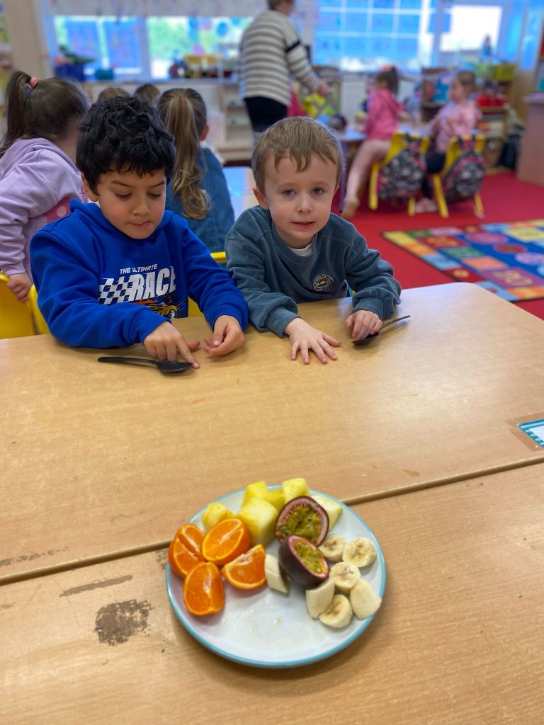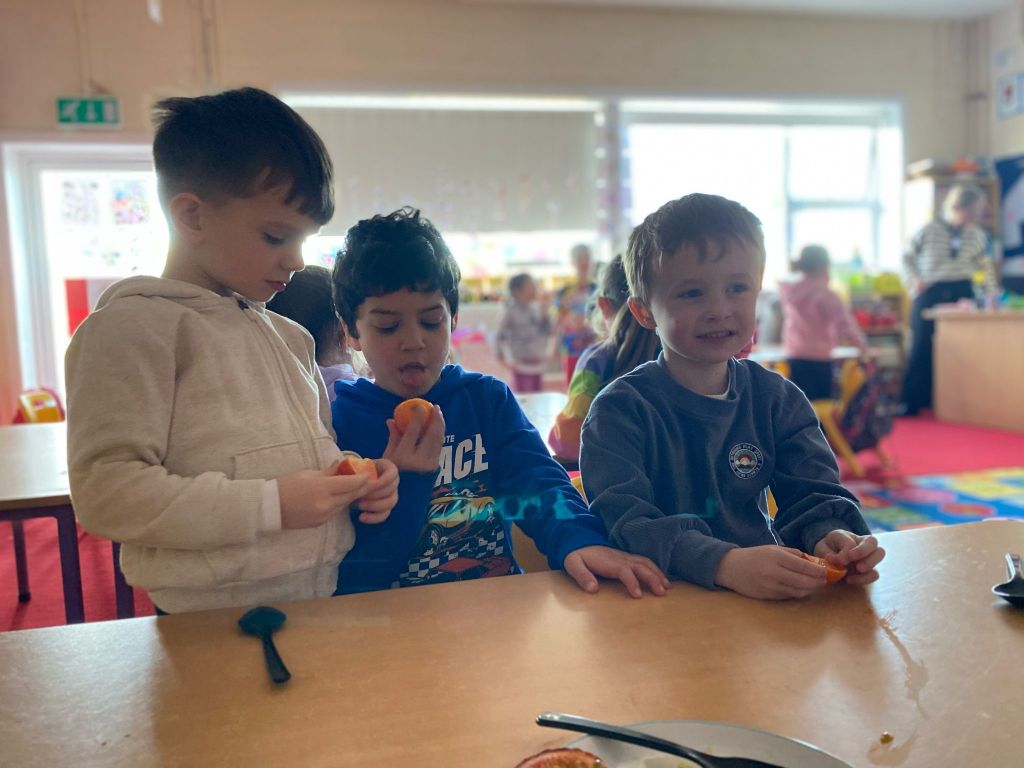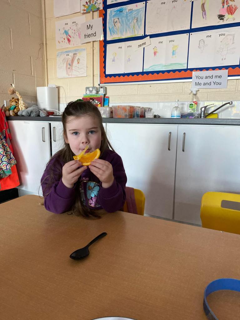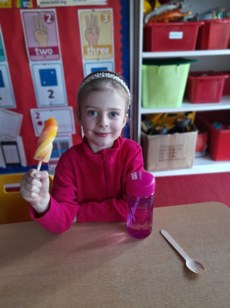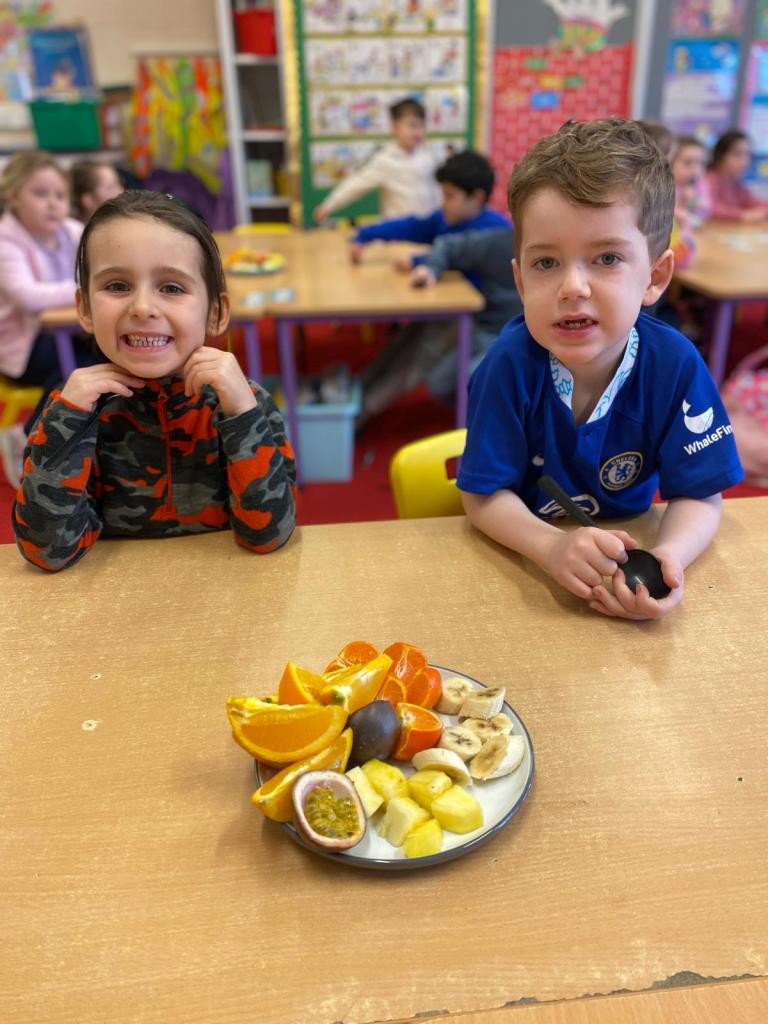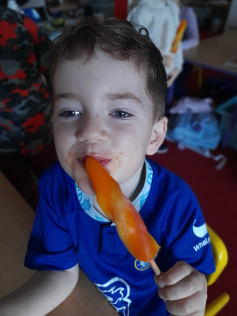 Junior Infants couldn’t read Handa’s Surprise and not sample the delicious fruits that appeared in the book! The book is about a girl called Handa who places seven different fruits in her basket and carries them to her friend Akeyo’s house. On the journey some very cheeky animals help themselves, one by one, to the fruits! Handa is very surprised to find that her basket is full of tangerines by the time she reaches Akeyo’s house rather than the variety of fruits that she started with! Many of the children have never tasted a real mango, avocado or passion fruit and were very curious as to what they looked, smelt and tasted like. So, as a surprise, the children had their very own fruit tasting session! It would seem that getting hold of a guava is very tricky and despite Mrs Larkin’s searching! Despite this, the children were amazed at the beautiful colours and smells within the fruits. They were more than happy with the extra surprise at the end…an ice-pop containing many of the fruits they didn’t really like!