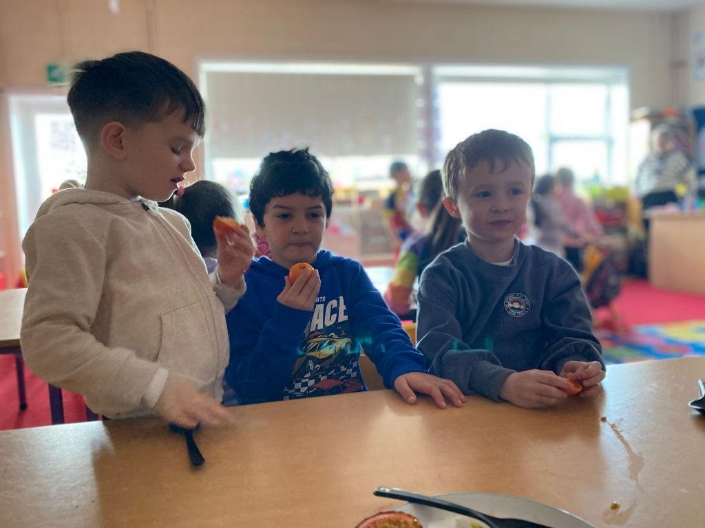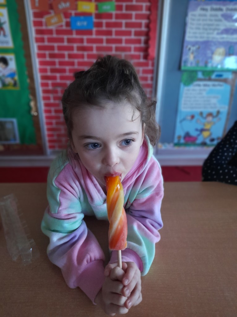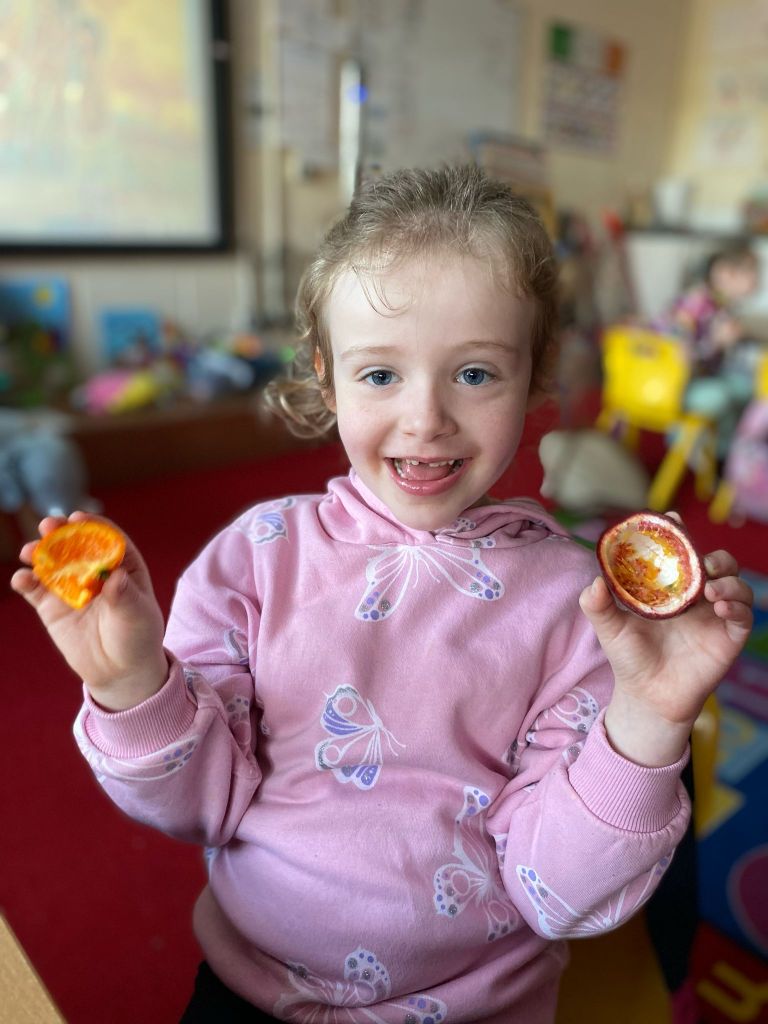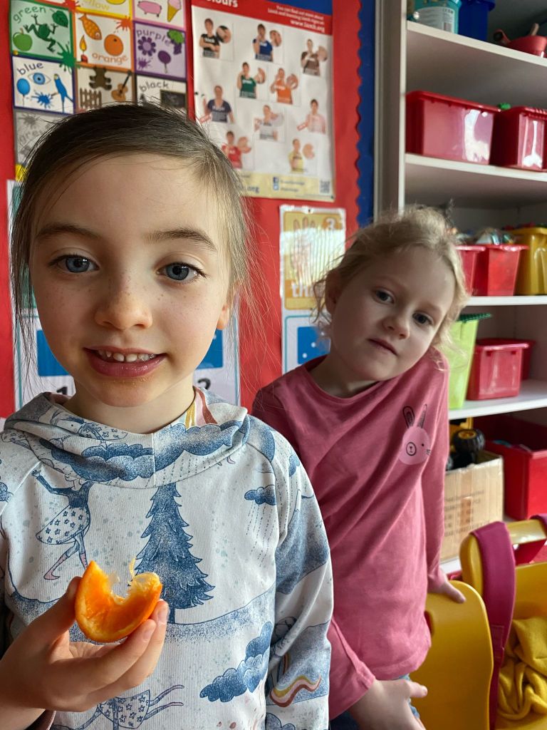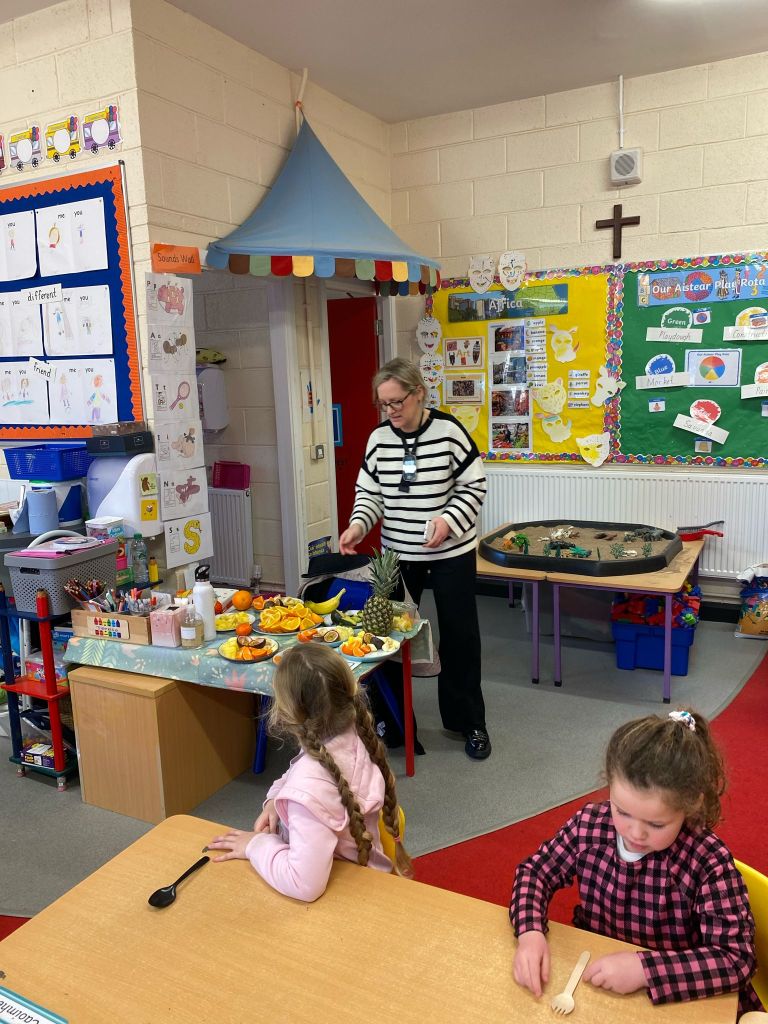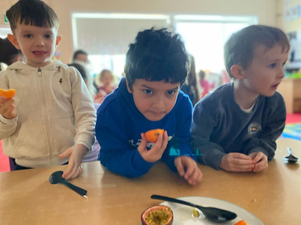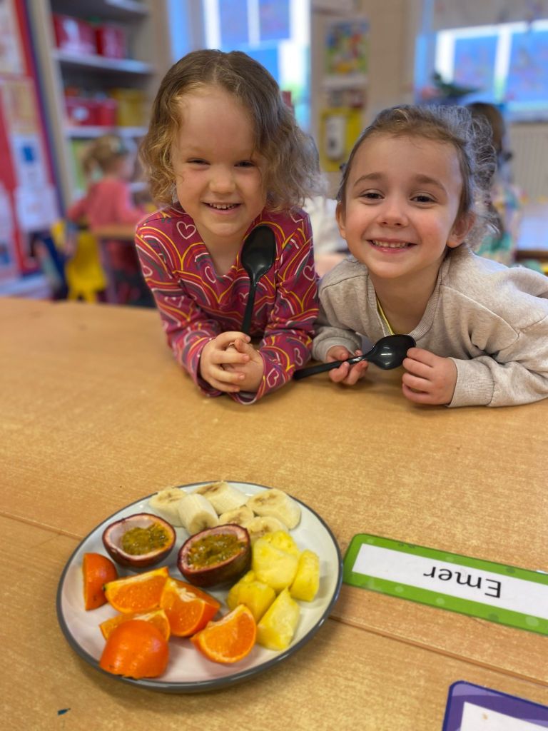 Junior Infants couldn’t read Handa’s Surprise and not sample the delicious fruits that appeared in the book! The book is about a girl called Handa who places seven different fruits in her basket and carries them to her friend Akeyo’s house. On the journey some very cheeky animals help themselves, one by one, to the fruits! Handa is very surprised to find that her basket is full of tangerines by the time she reaches Akeyo’s house rather than the variety of fruits that she started with! Many of the children have never tasted a real mango, avocado or passion fruit and were very curious as to what they looked, smelt and tasted like. So, as a surprise, the children had their very own fruit tasting session! It would seem that getting hold of a guava is very tricky and despite Mrs Larkin’s searching! Despite this, the children were amazed at the beautiful colours and smells within the fruits. They were more than happy with the extra surprise at the end…an ice-pop containing many of the fruits they didn’t really like!