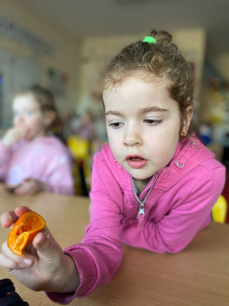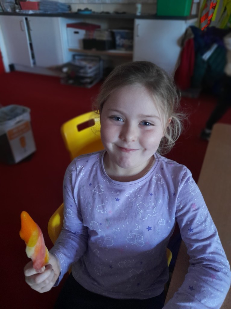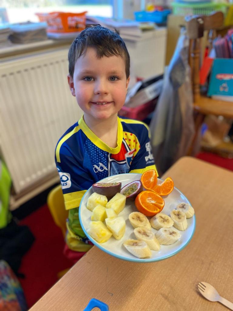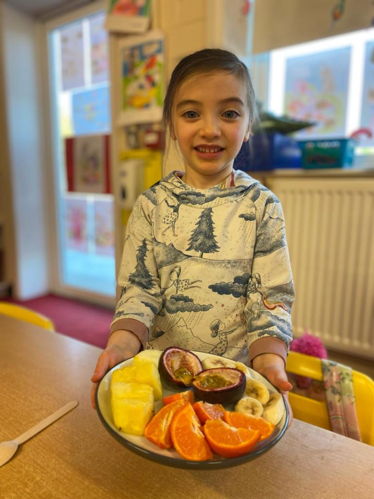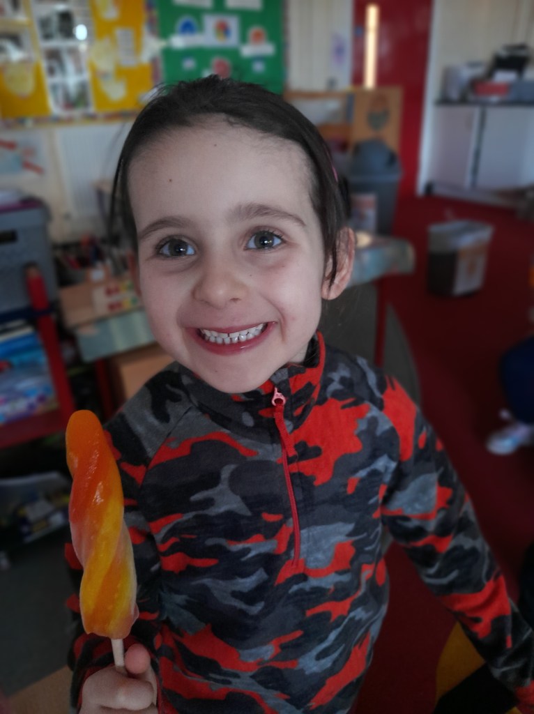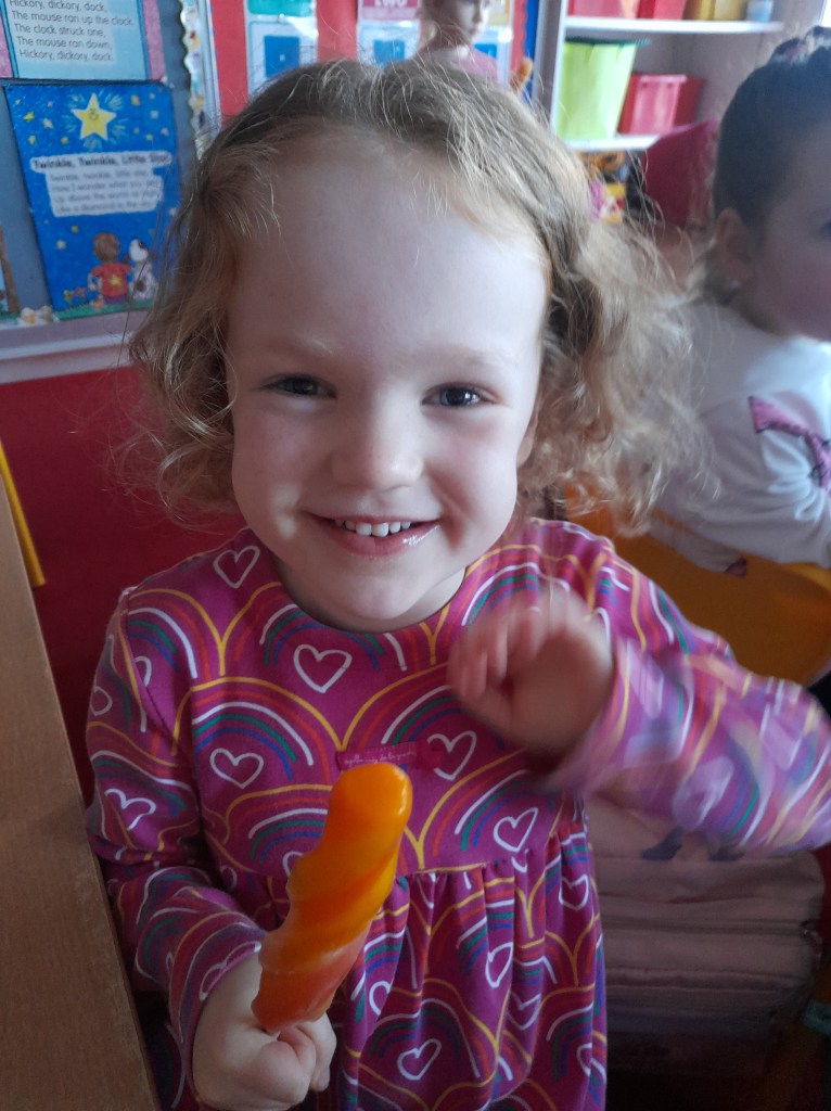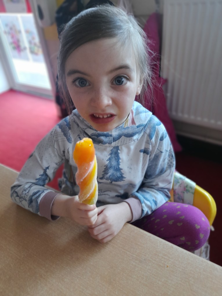 Junior Infants couldn’t read Handa’s Surprise and not sample the delicious fruits that appeared in the book! The book is about a girl called Handa who places seven different fruits in her basket and carries them to her friend Akeyo’s house. On the journey some very cheeky animals help themselves, one by one, to the fruits! Handa is very surprised to find that her basket is full of tangerines by the time she reaches Akeyo’s house rather than the variety of fruits that she started with! Many of the children have never tasted a real mango, avocado or passion fruit and were very curious as to what they looked, smelt and tasted like. So, as a surprise, the children had their very own fruit tasting session! It would seem that getting hold of a guava is very tricky and despite Mrs Larkin’s searching! Despite this, the children were amazed at the beautiful colours and smells within the fruits. They were more than happy with the extra surprise at the end…an ice-pop containing many of the fruits they didn’t really like!