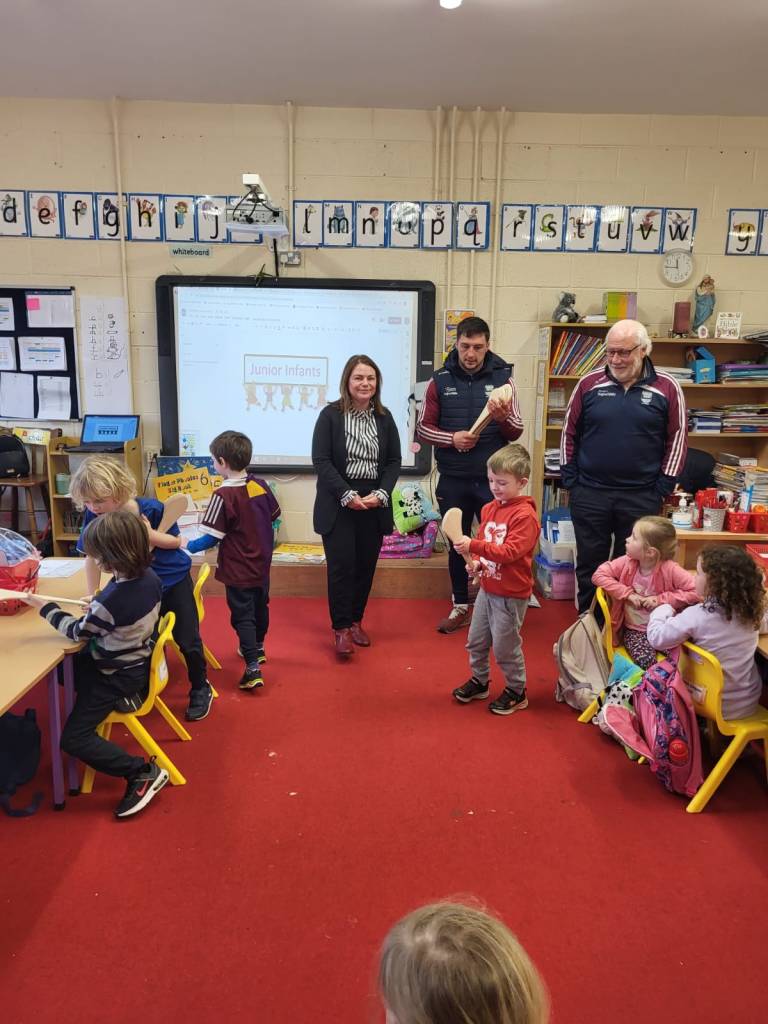 Once again, Piercestown N.S. were delighted to welcome some special guests today, Thursday 09th March, to continue the Camán Everybody Programme – a programme aimed at introducing the fundamental skills of hurling from a young age. Among those present were Kevin Waters (Chairman of St. Martin’s Club) Cian Waters, Séamus Casey (Games Promotion Officer) and Willie Clancy who made the hurls.