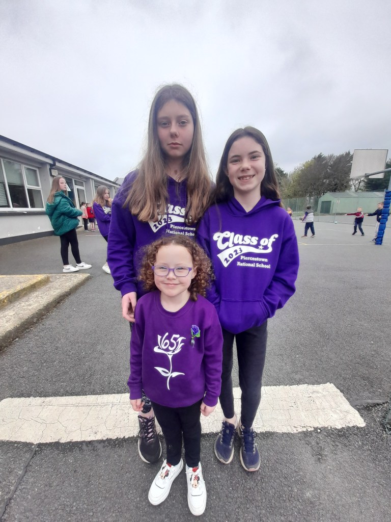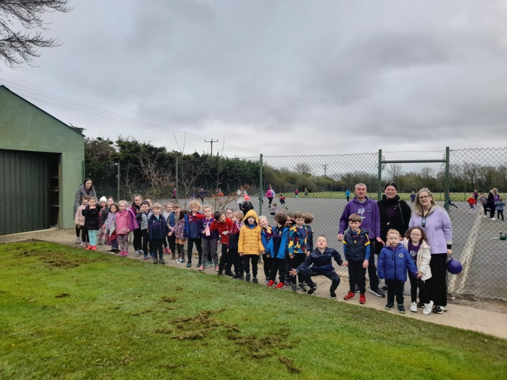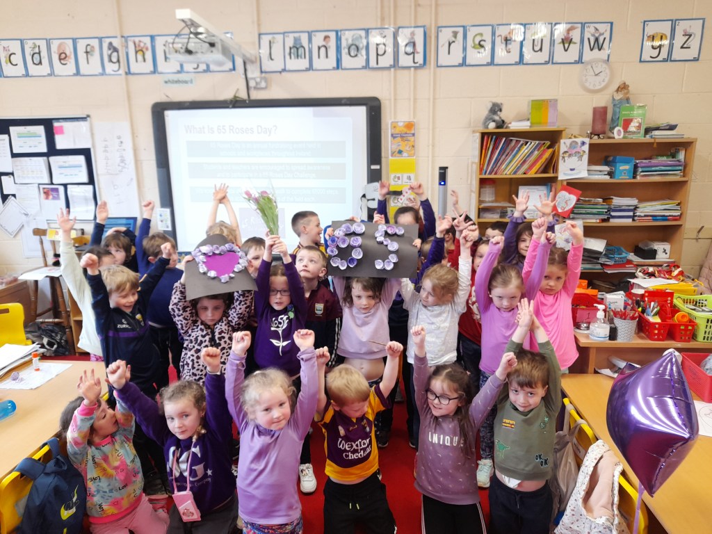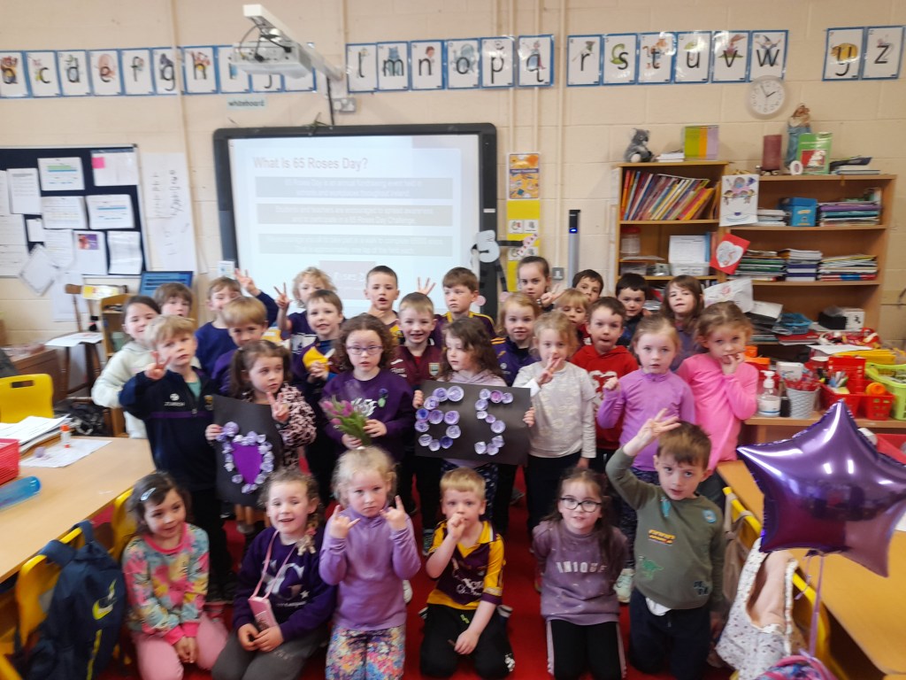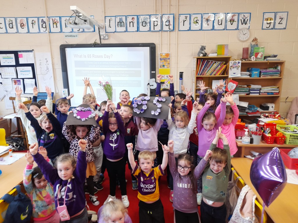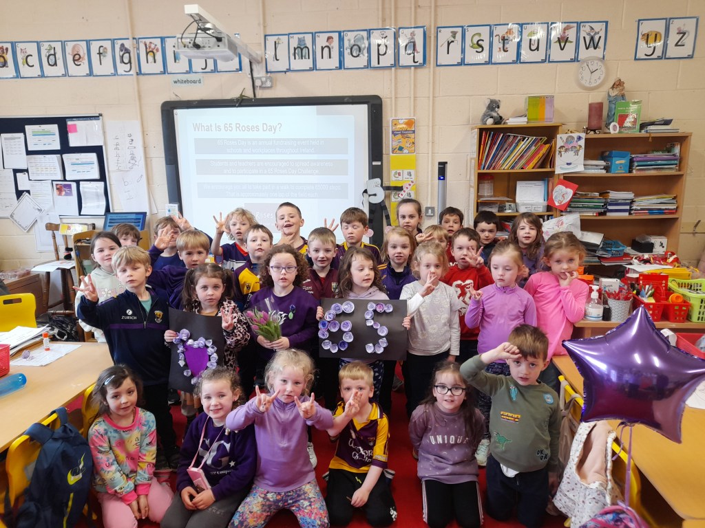 In school, we have decided to create our own 65 Roses Challenge and we completed 65,000 steps as a school community on this day…we may have even surpassed the amount! One lap of our field has been calculated by Mrs. Larkin as being 320 steps. So, Junior infants alone covered 9,600 steps. The rest of the school joined in and covered the entire 65000 steps. Therefore, all our classes worked together to complete the challenge on the Monday, kicking off term three being active straight away! Well done everyone and congratulations Savannah and family for helping us spread awareness of Cystic Fibrosis.