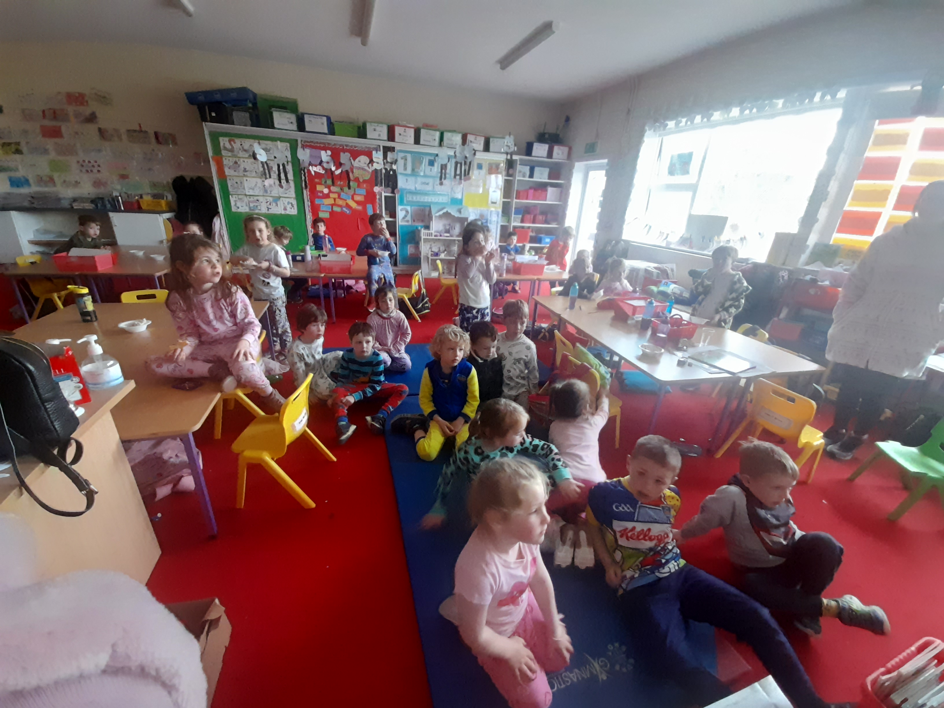 Mrs. Larkin’s brother, Davy, saved the day in Junior Infants when he popped by to tell the children all about being a firefighter. He showed Junior Infants all the equipment and uniform items they would need to fight a fire. We timed some of our friends to see if they could get ready in under 5 minutes! We have some future firefighters on our hands as they pulled it off in under 1…with a little help! We spent the afternoon saying our Firefighter rhymes, identifying dangers in our homes and playing Fire poles and Ladders! We bet Davy needed a nap after all the questions!