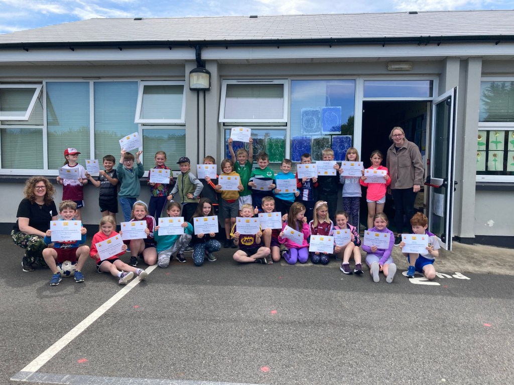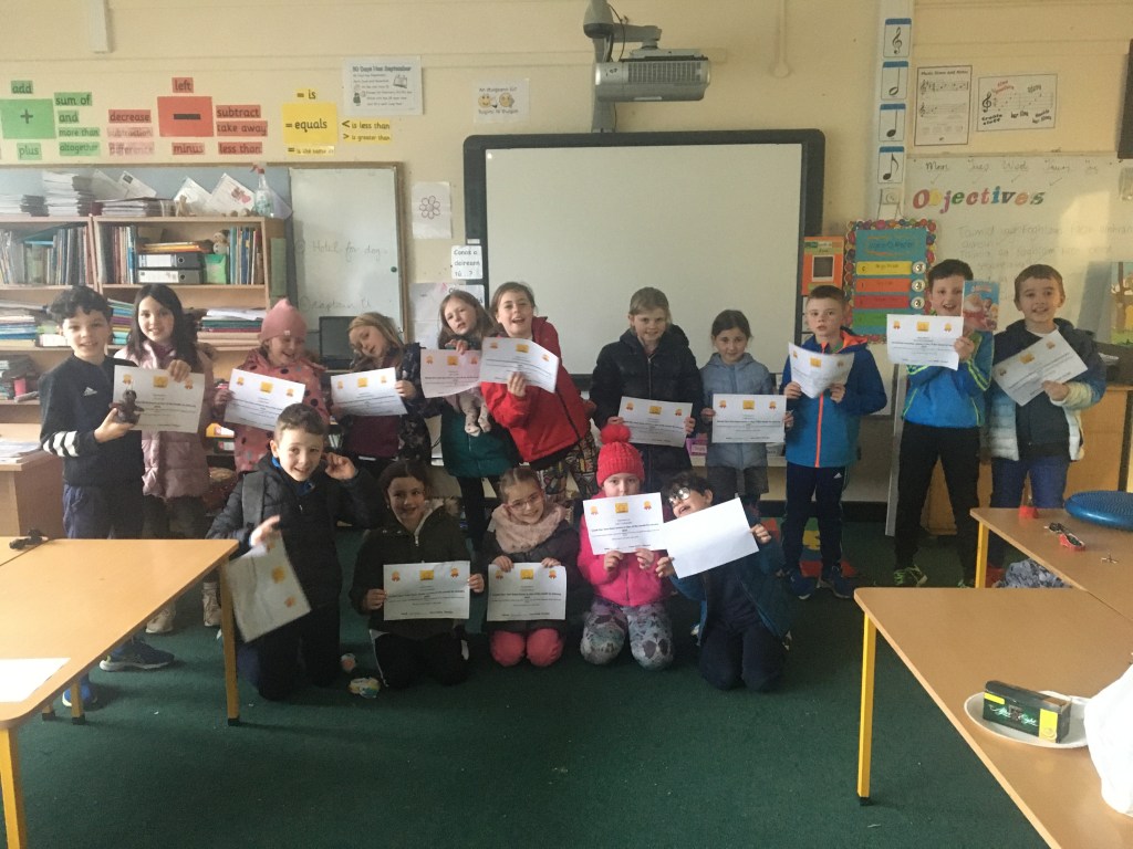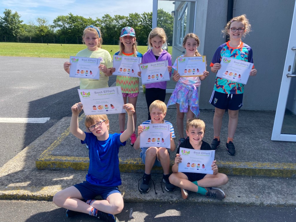 Here are some photos of the latest children to earn certificates for eating healthy ‘torthaí agus glasraí’ in school every day. Our first platinum certs were given out this week. Well done everyone. Not long left now. Please keep up the good work!