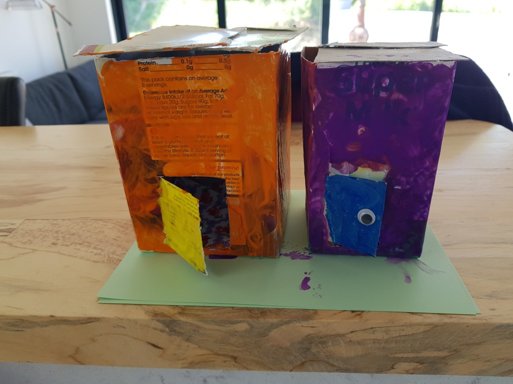I find the box that held my juice. Now it’s a bright red barn!
