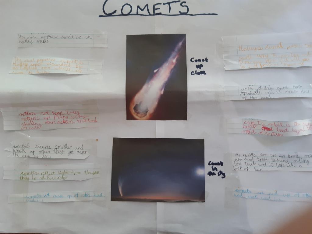As part of the topic of Earth in Space, Isaac decided to do a project on Comets. At the 2nd class Zoom meeting this week he shared lots of facts about one of the most famous comets, Halley’s Comet, with the class. Like most comets, Halley’s Comet is made of ice, dust and gas. It can be seen from Earth every 75 years. It last appeared in 1986 and will come again in 2061. Well done Isaac!