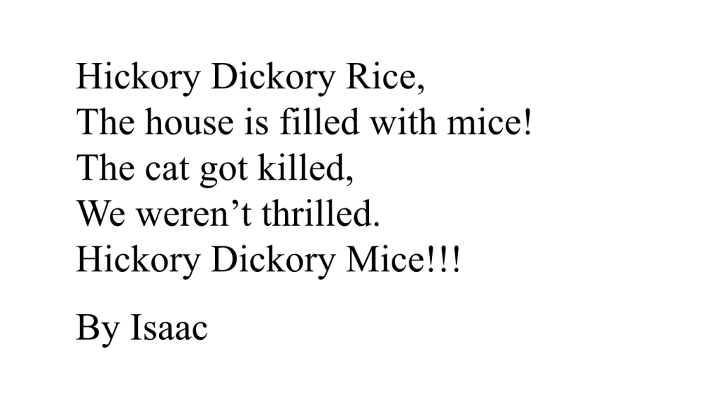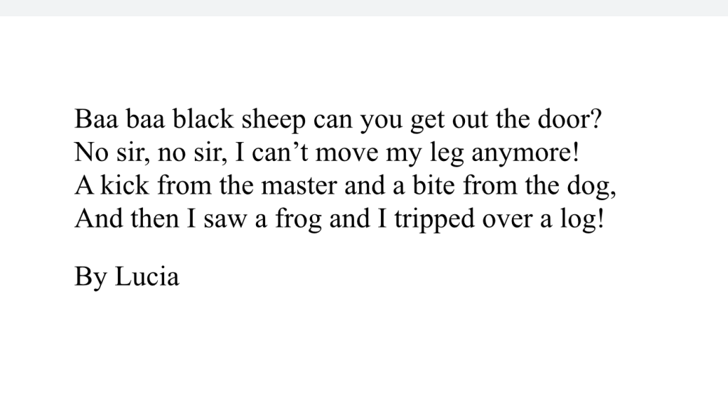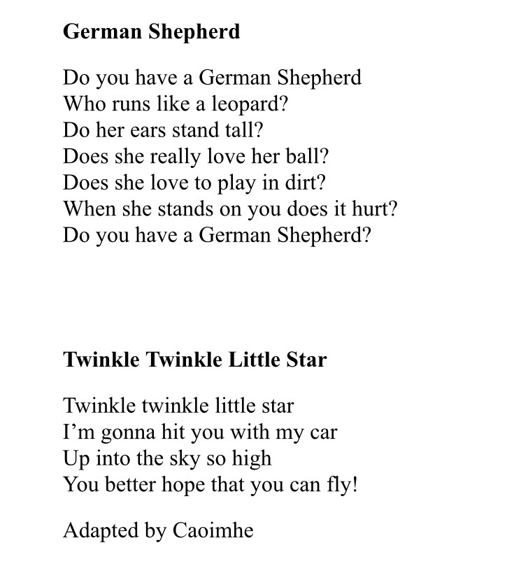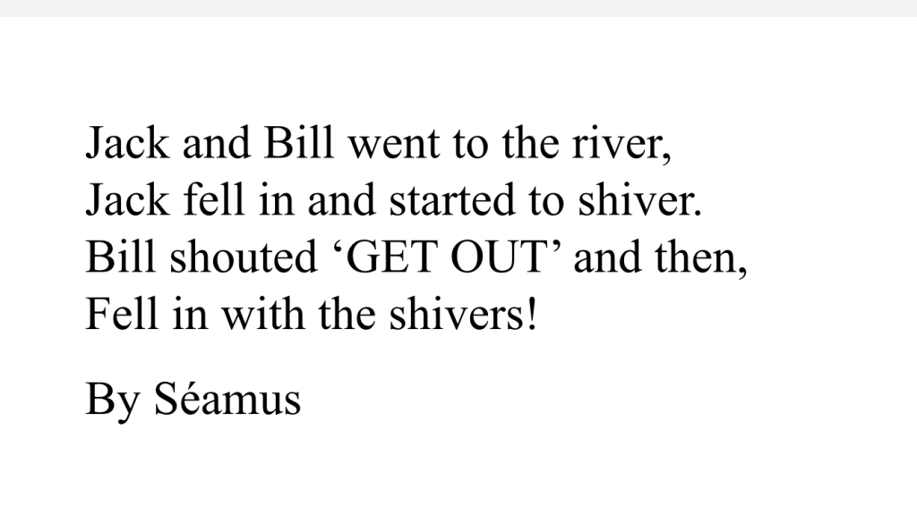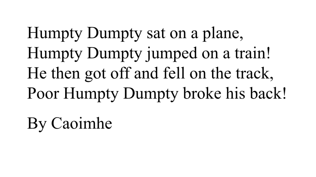 Rang a dó are still working on their poetry. Here are some Nursery Rhymes with a difference…!!!