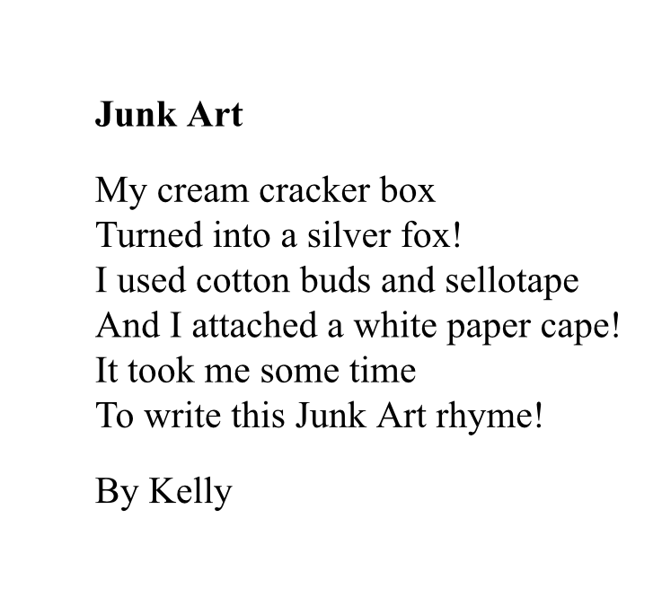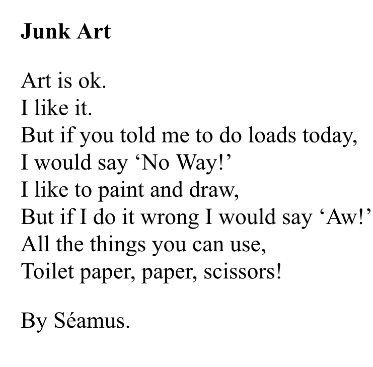 To continue their work on poetry this week the children in second class were given a poem entitled ‘Junk Art’ as inspiration for writing their own poems and for making junk art! Have a look and see what Leah, Kelly, Séamus, Joseph, Ava and Lucia came up with…