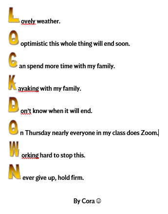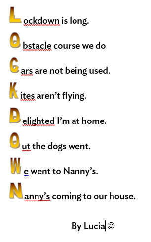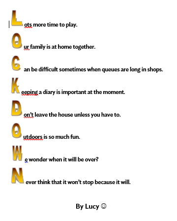 For our final week of poetry the boys and girls in Rang a dó put pen to paper and wrote an acrostic poem on their time in Lockdown. A big thank you to Lucy, Seán and Jessica for sharing their poem with us!