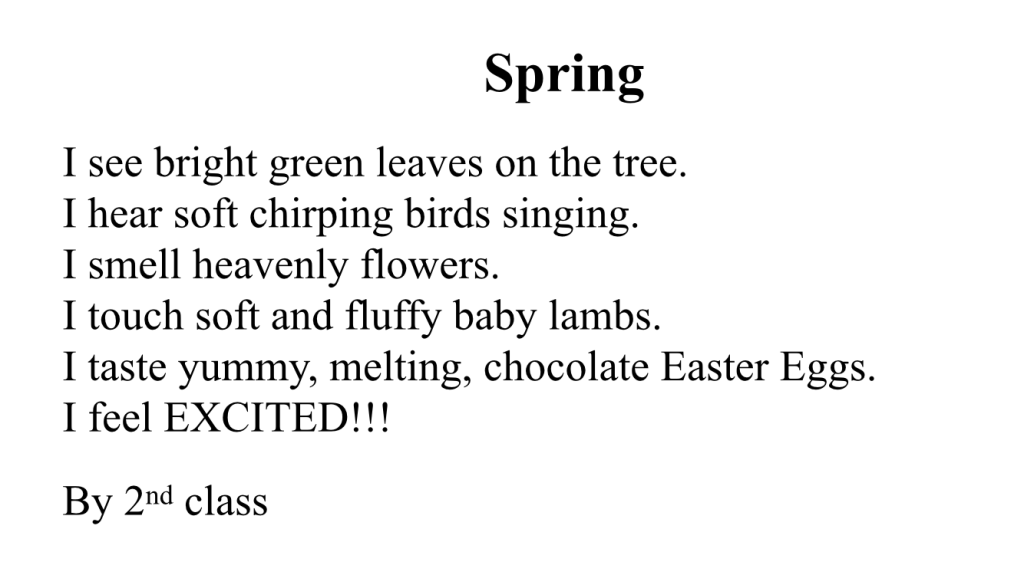 Before school closed the children had been learning about poetry with Mrs. Corrigan and Miss Cooney. They have continued some of this work in recent weeks as part of their learning at home. Here is a selection of their poems for you to enjoy!