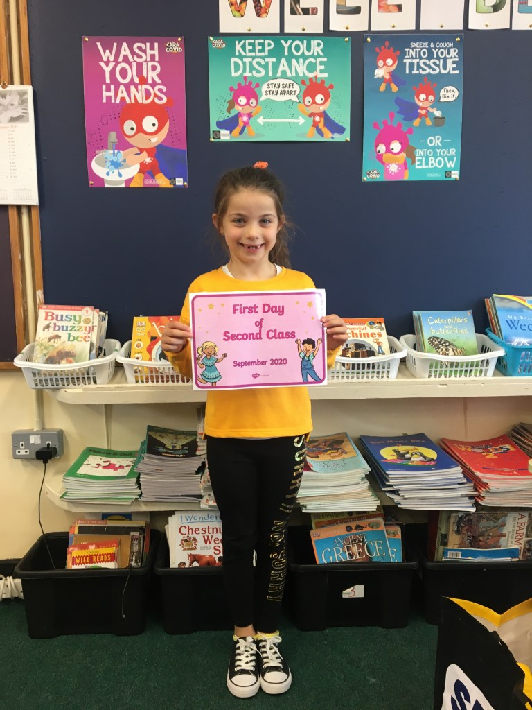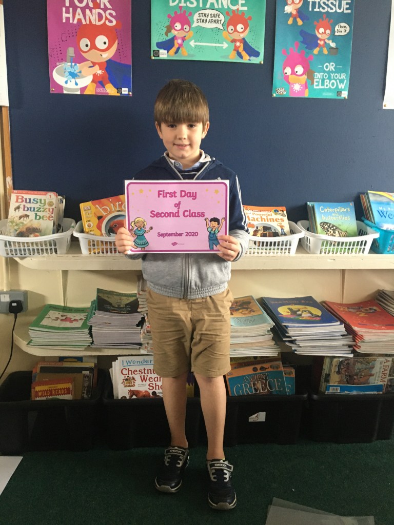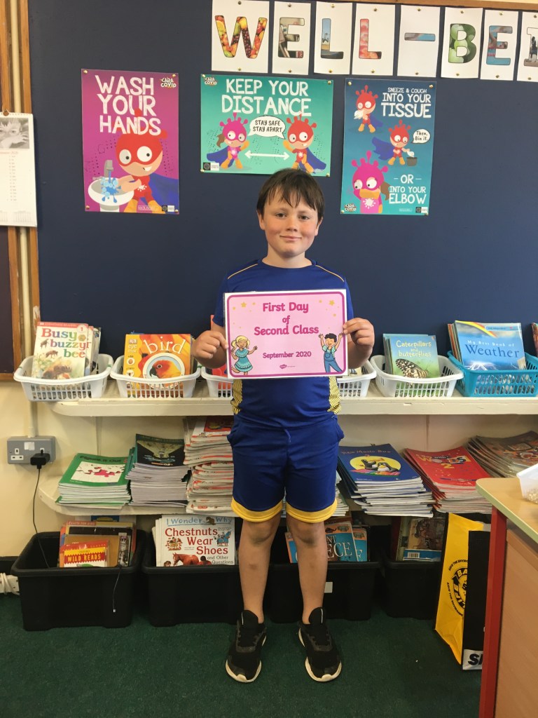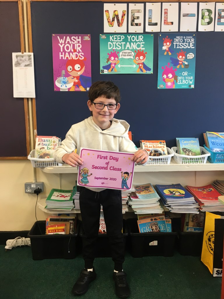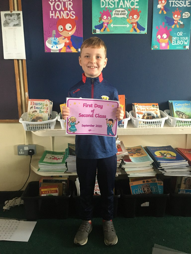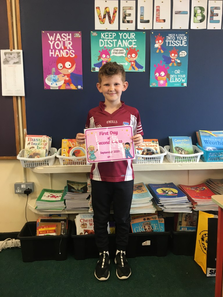 The boys and girls in 2nd class 2020/2021 were not put off by the rain as they returned to school on Thursday 27th August, after being away for over five months. They were full of the excitement of seeing their friends again and ready to embrace all of the new safety procedures put in place to protect everyone from COVID-19. During the day they had a visit from Fr. O’Reilly to welcome them back and to remind them about the special sacraments that take place in 2nd class – First Confession and First Holy Communion. Here are some photos of the children on their first day back!