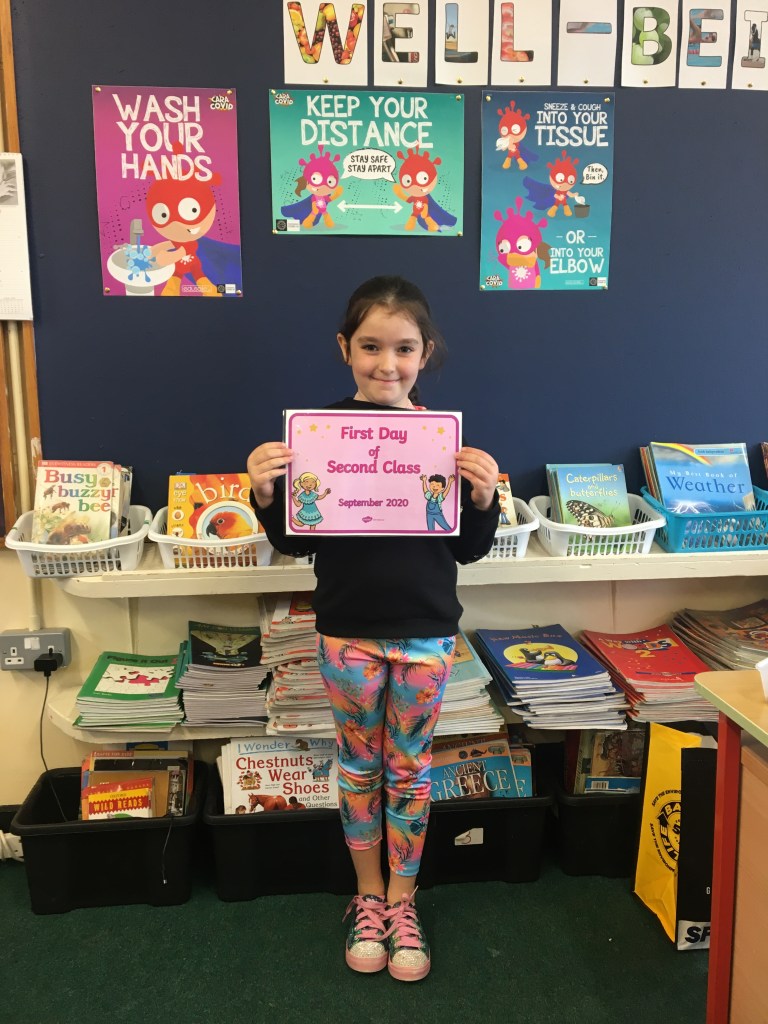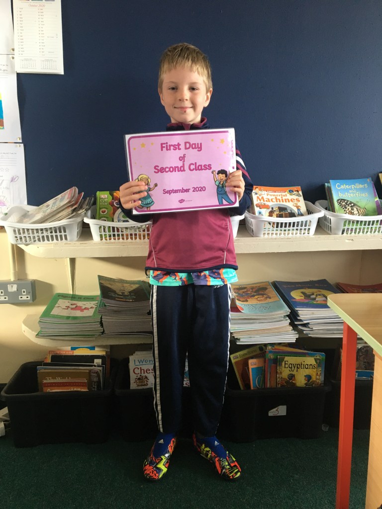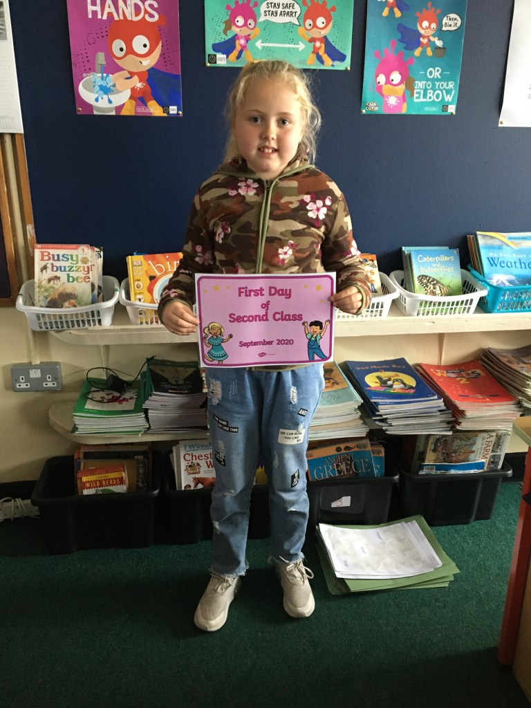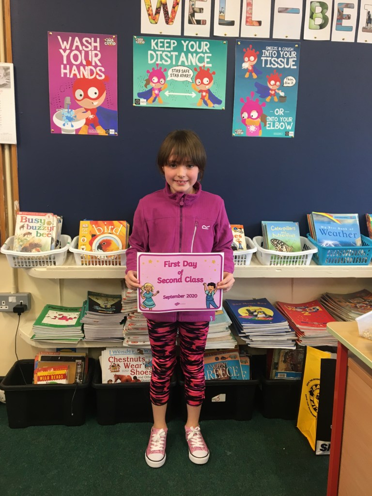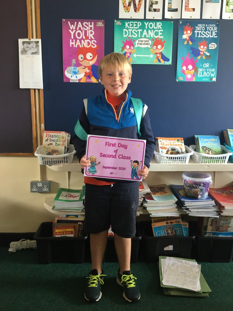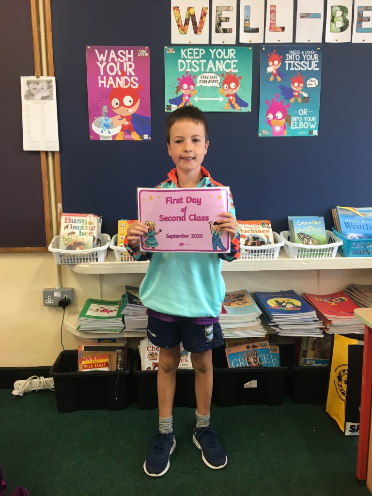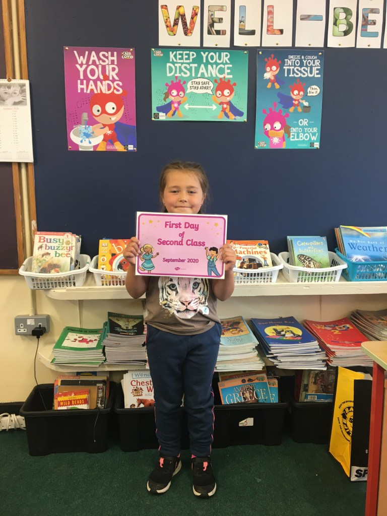 The boys and girls in 2nd class 2020/2021 were not put off by the rain as they returned to school on Thursday 27th August, after being away for over five months. They were full of the excitement of seeing their friends again and ready to embrace all of the new safety procedures put in place to protect everyone from COVID-19. During the day they had a visit from Fr. O’Reilly to welcome them back and to remind them about the special sacraments that take place in 2nd class – First Confession and First Holy Communion. Here are some photos of the children on their first day back!