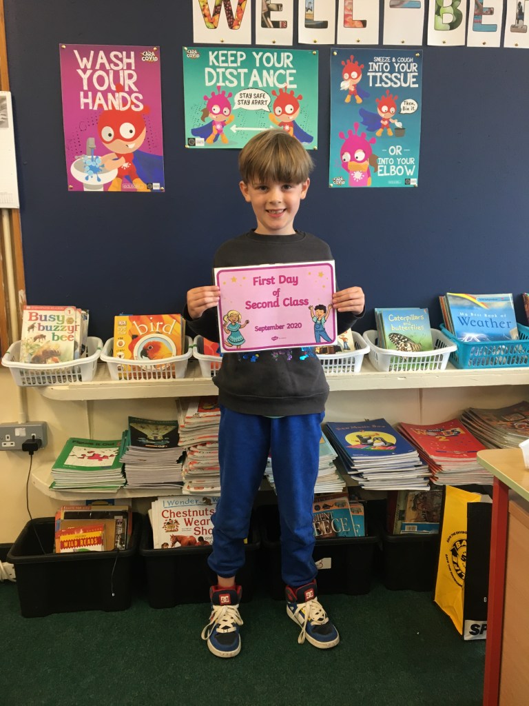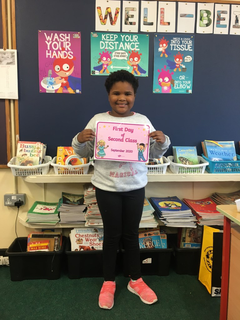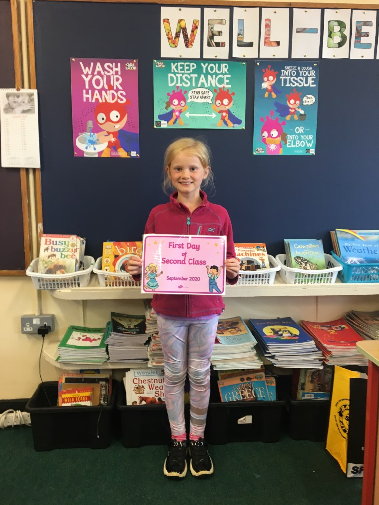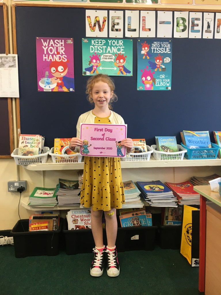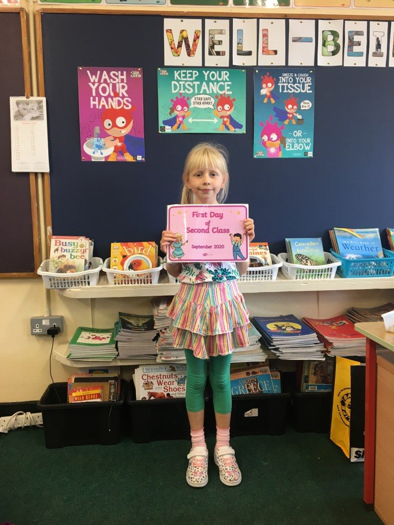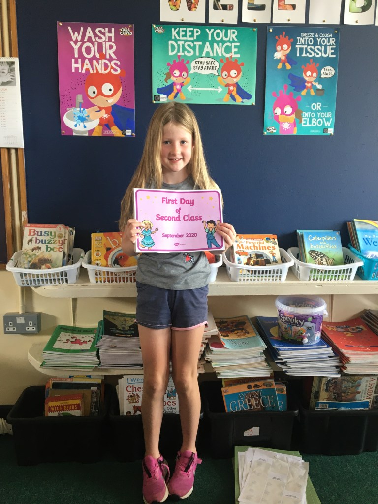 The boys and girls in 2nd class 2020/2021 were not put off by the rain as they returned to school on Thursday 27th August, after being away for over five months. They were full of the excitement of seeing their friends again and ready to embrace all of the new safety procedures put in place to protect everyone from COVID-19. During the day they had a visit from Fr. O’Reilly to welcome them back and to remind them about the special sacraments that take place in 2nd class – First Confession and First Holy Communion. Here are some photos of the children on their first day back!