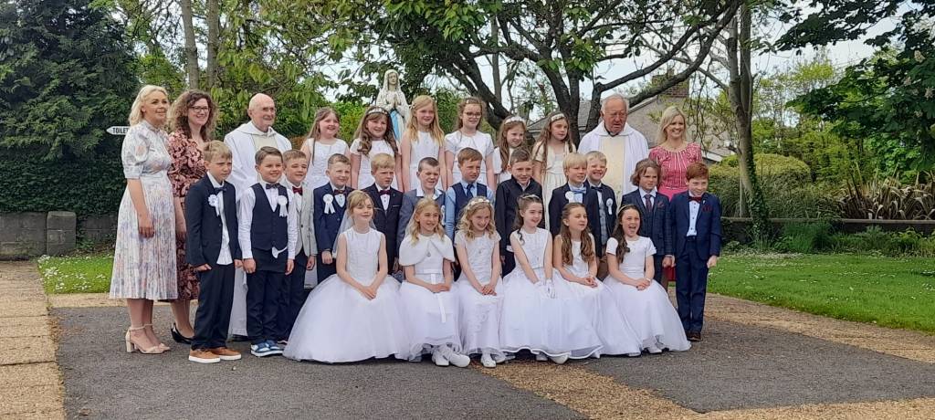 There were many early risers in Piercestown on the morning of Saturday 14th May as the children in 2nd class were full of excitement about making their First Holy Communion. Together with Mrs. Corrigan and Lena, these First Communicants had worked so hard all year to prepare for this special sacrament, learning about what it means to be a follower of Christ, saying their prayers daily and practicing their readings and hymns before the event. On the day they made everyone proud as they processed up the church and took their places on the altar, singing sweetly for all. It was a joyful occasion and everyone there was delighted to see Fr. O’Reilly and Fr. Lorenzo return to join with Fr. Aodhán in celebrating the mass. Once again, choir was provided by Ms. Sinnott and children from 4th, 5th and 6th classes who generously gave up their time to enhance the ceremony with their beautiful singing. Congratulations to all the children who made their First Holy Communion, may God bless them and keep them safe always.
