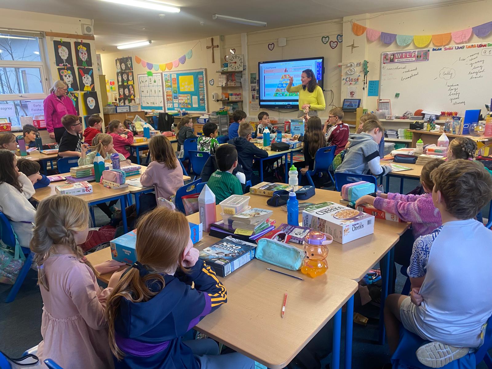 Thank you so much to Eve’s mam, Siobhán, who came to speak to 3rd Class as part of Science Week. Siobhán spoke to the class about her role as a Dietician. There was lots of chat about healthy eating, the food pyramid and the boys and girls even got to check the nutritional value on some of the cereals we all eat for breakfast. Thank you Siobhán!