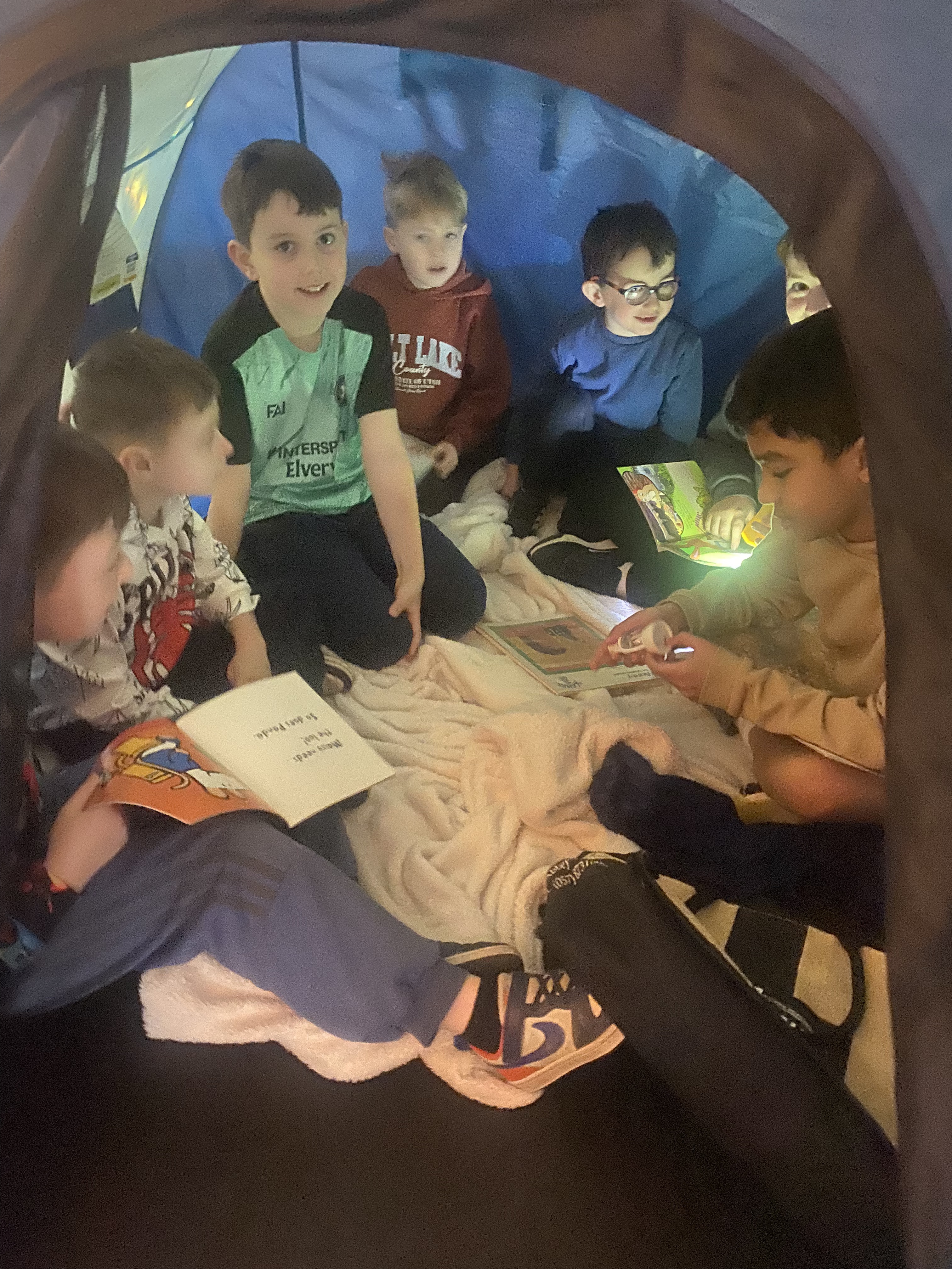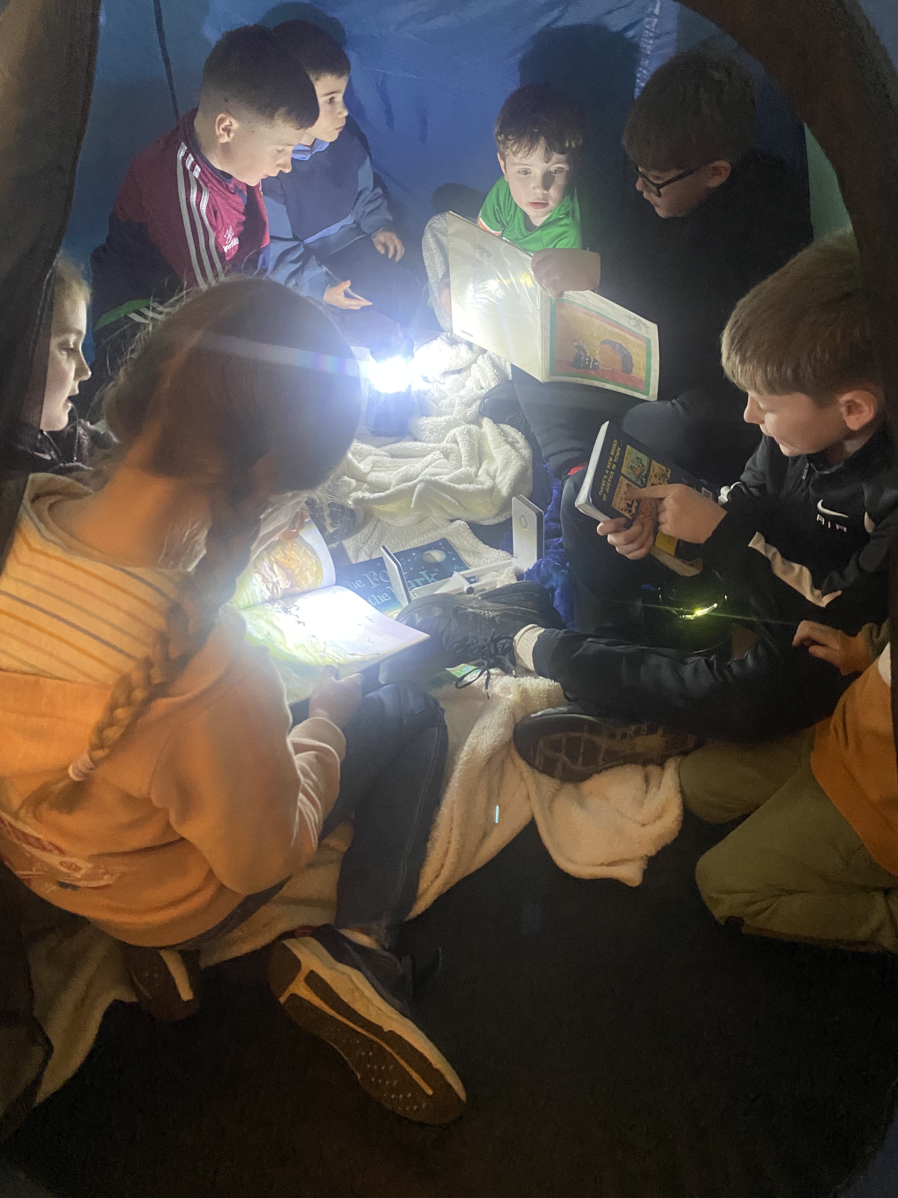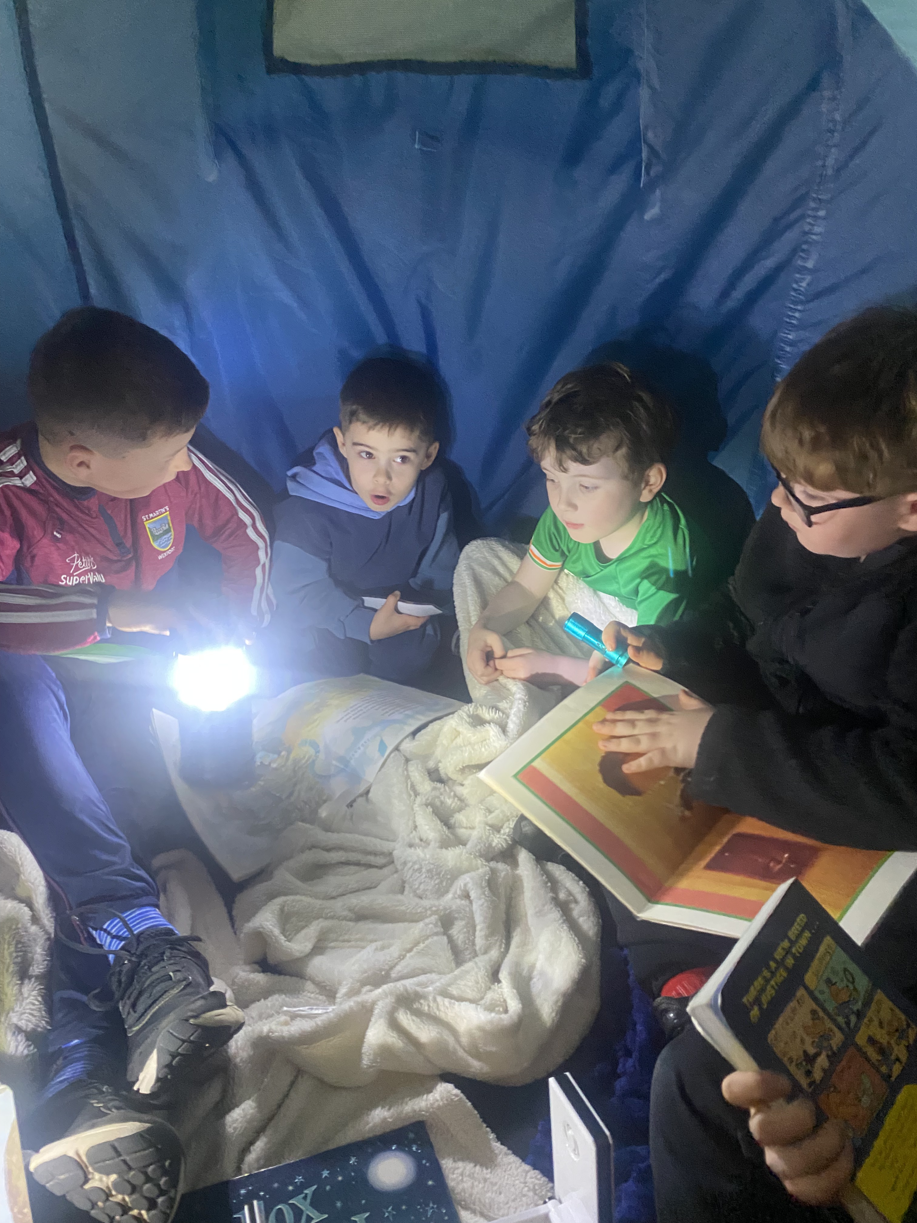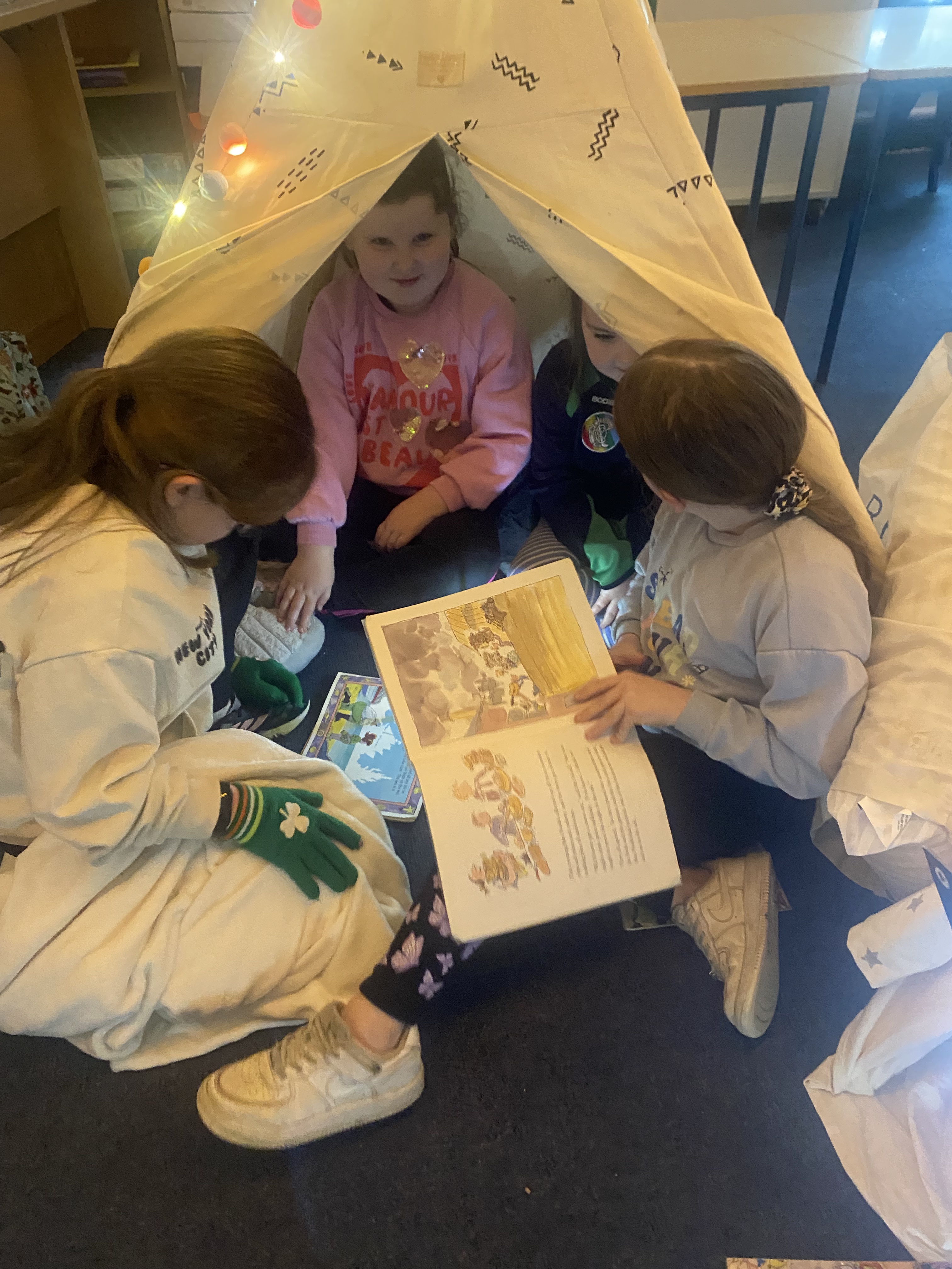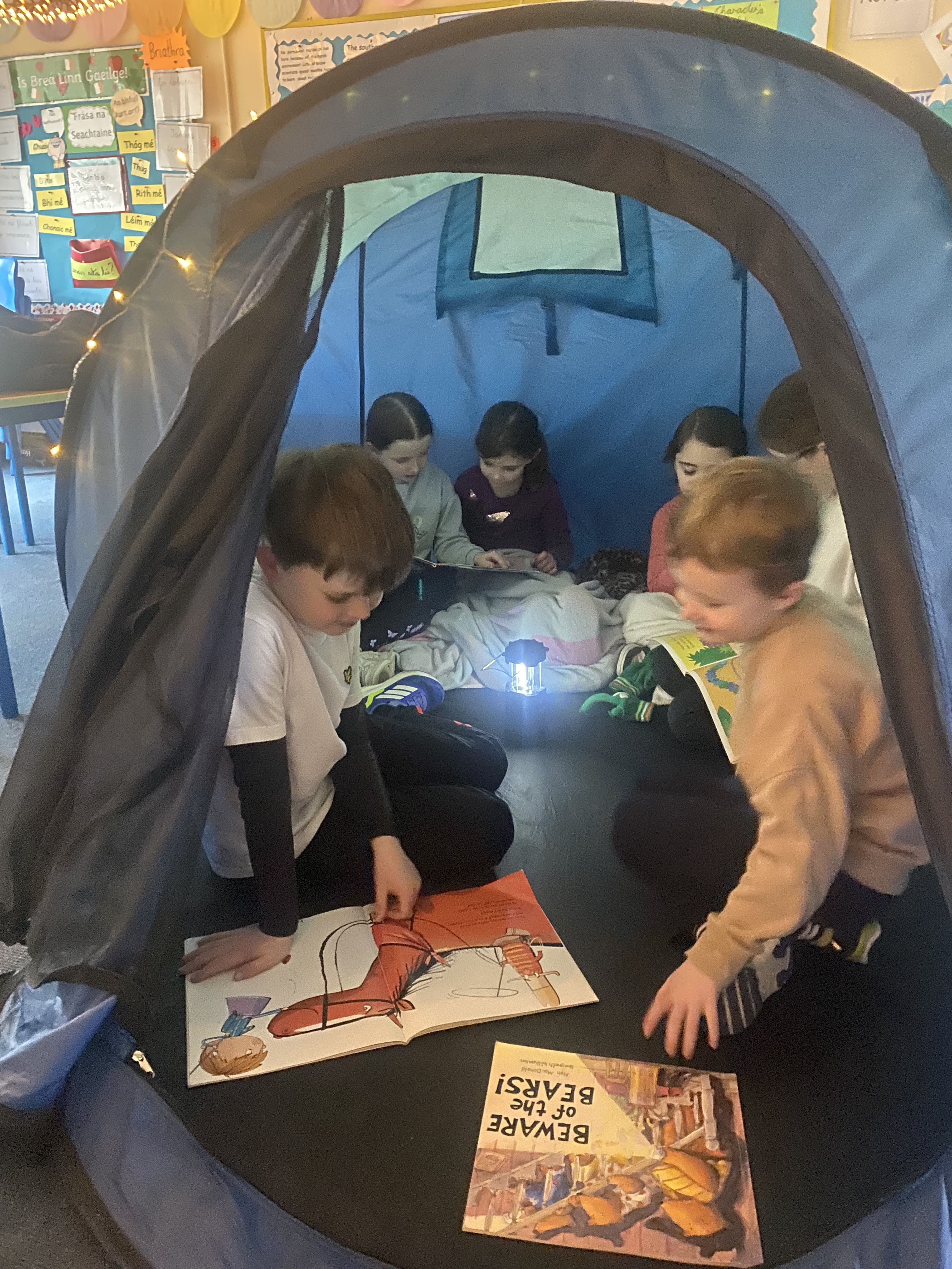 There is something truly special about reading a book by campfire, and to mark World Book Day 2025, 3rd class set about recreating this experience. Complete with tents, cushions, blankets, fake camp fire, torches and fairy lights, the 3rd class classroom was transformed into a magical campsite. Children from Junior and Senior infants along with Ms. Hearne’s and Ms. Sinnott’s class were invited to share this fun and exciting reading experience. Third class took on the role as storytellers, and as the noise of the “fire” crackled and the fairy lights twinkled above their heads, they snuggled into tents and shared storybooks with their younger friends. I am so proud of their amazing reading and how kind they were to our visitors today. Well done everyone!