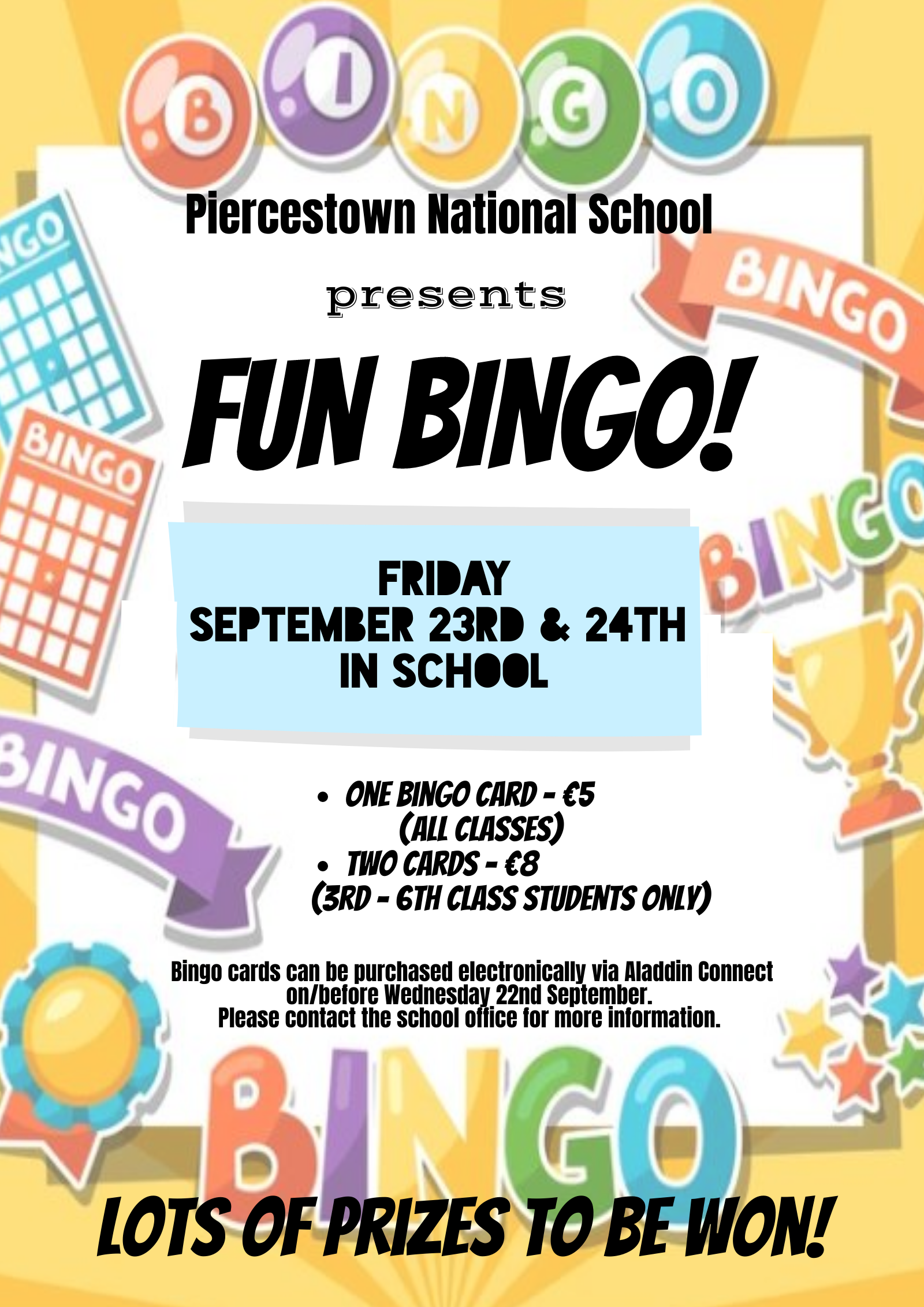 At Piercestown N.S., we have decided to organise a fun Bingo for the children to help towards our fundraising.