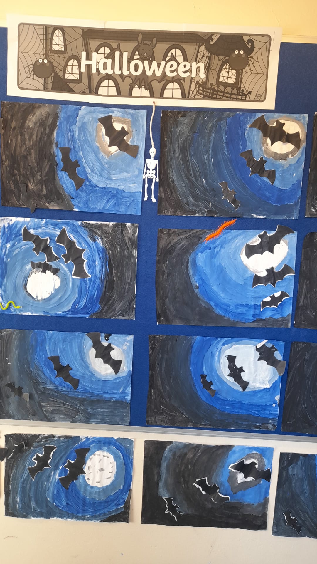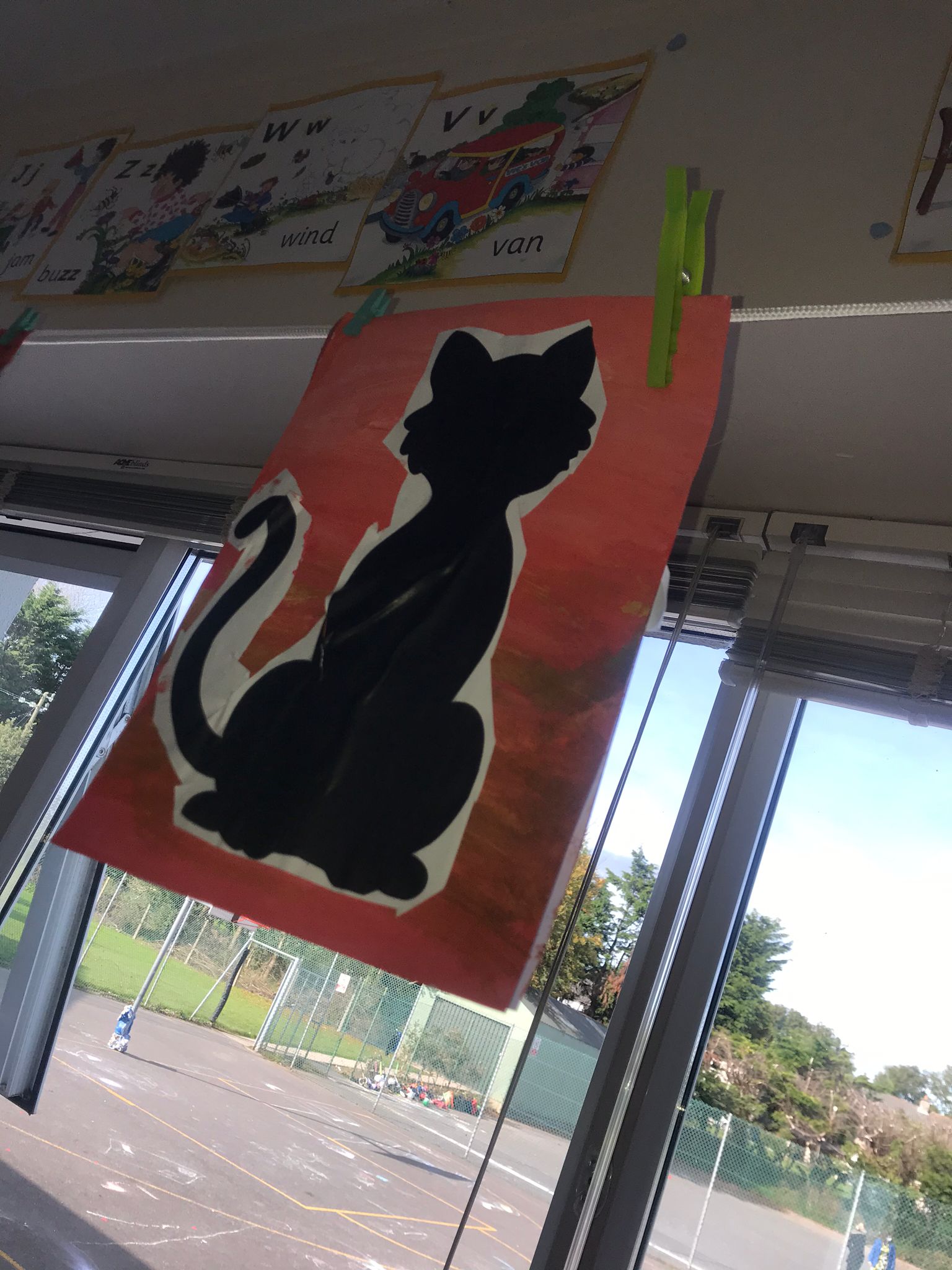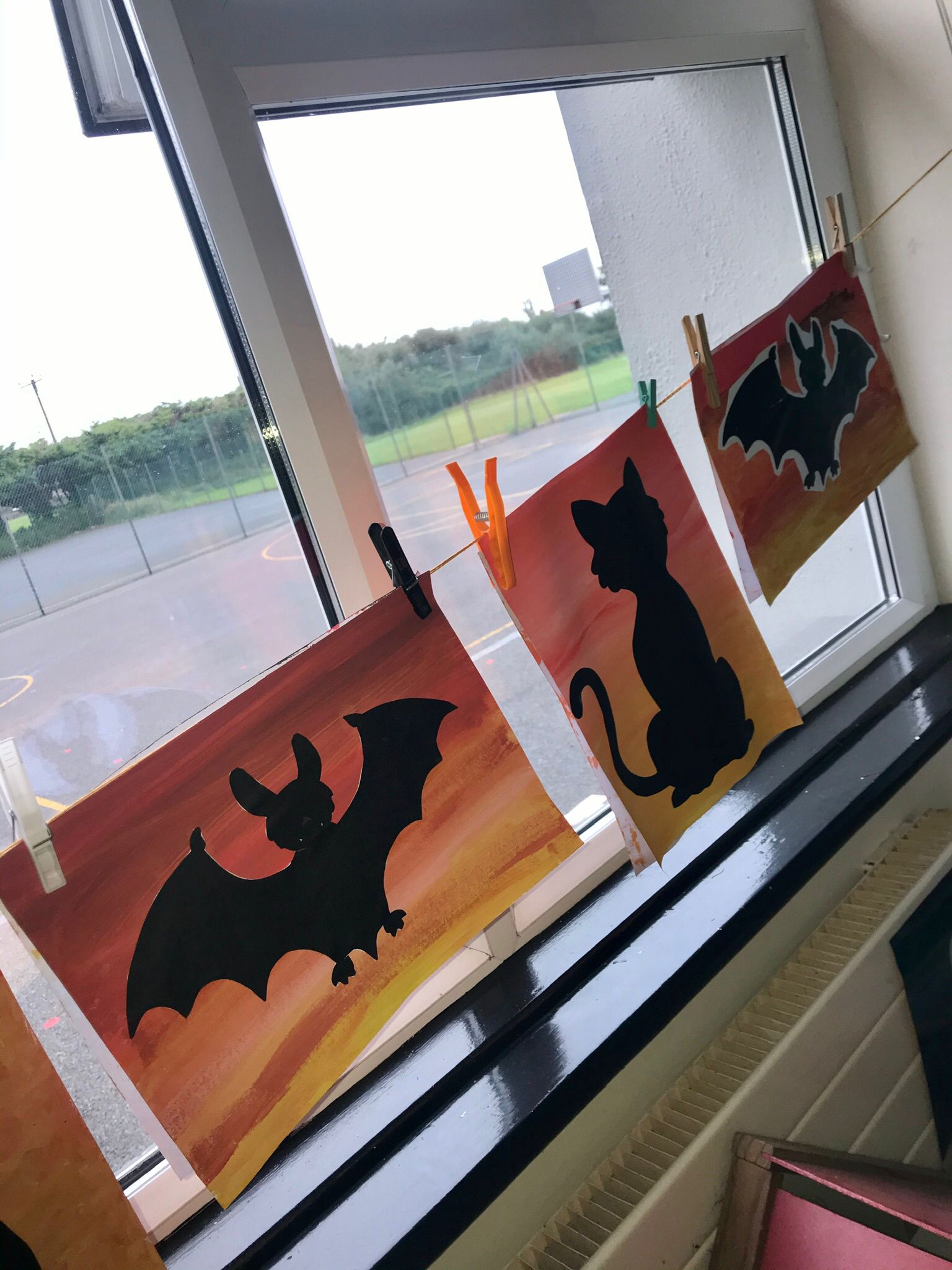 Senior Infants were hot on the heels of 1st class today with their Halloween art. From dark skies with nocturnal bats to orange glowing sunsets, with silhouettes of bats and cats!