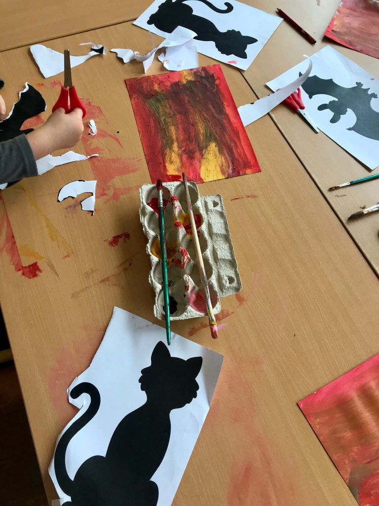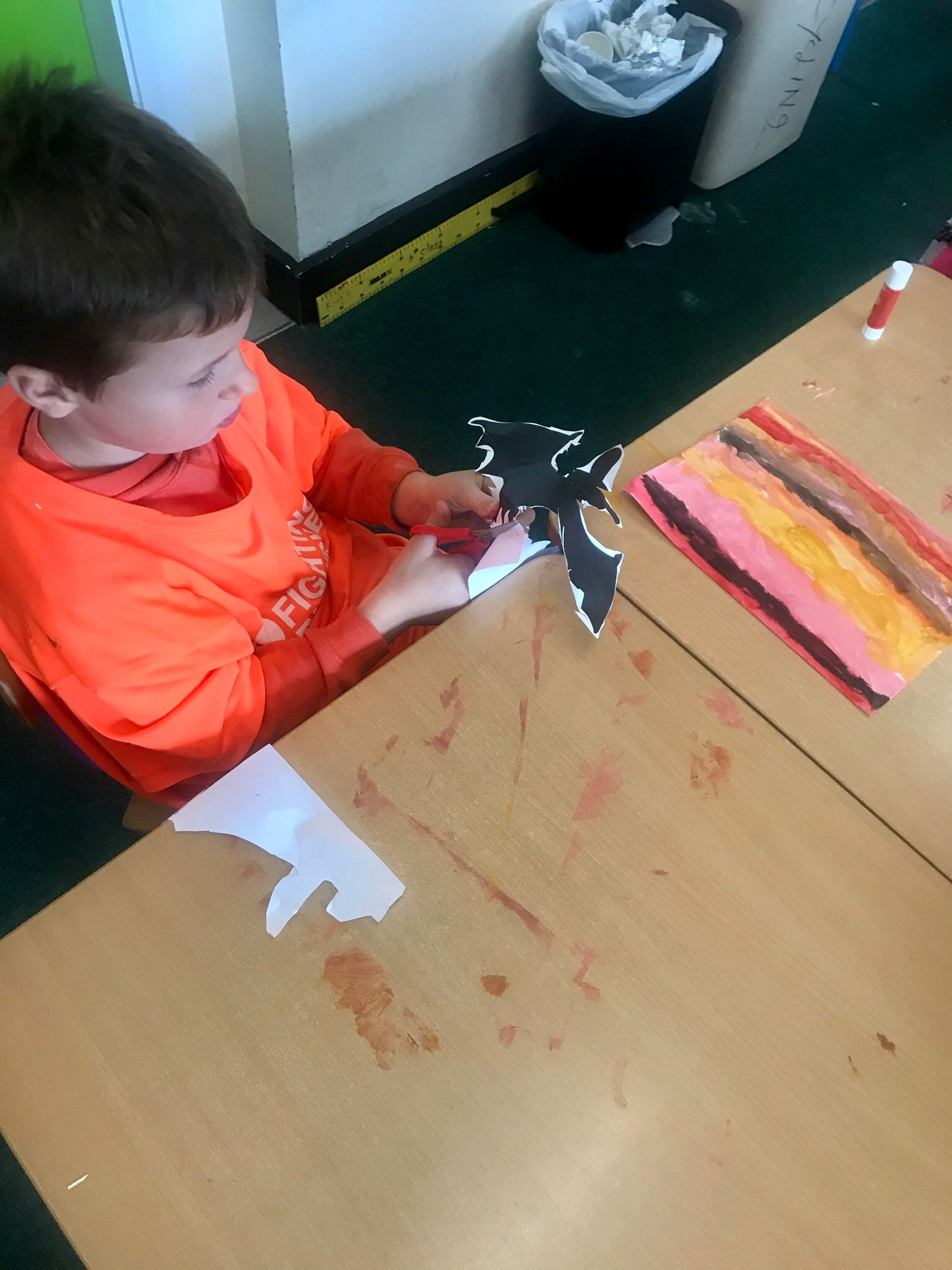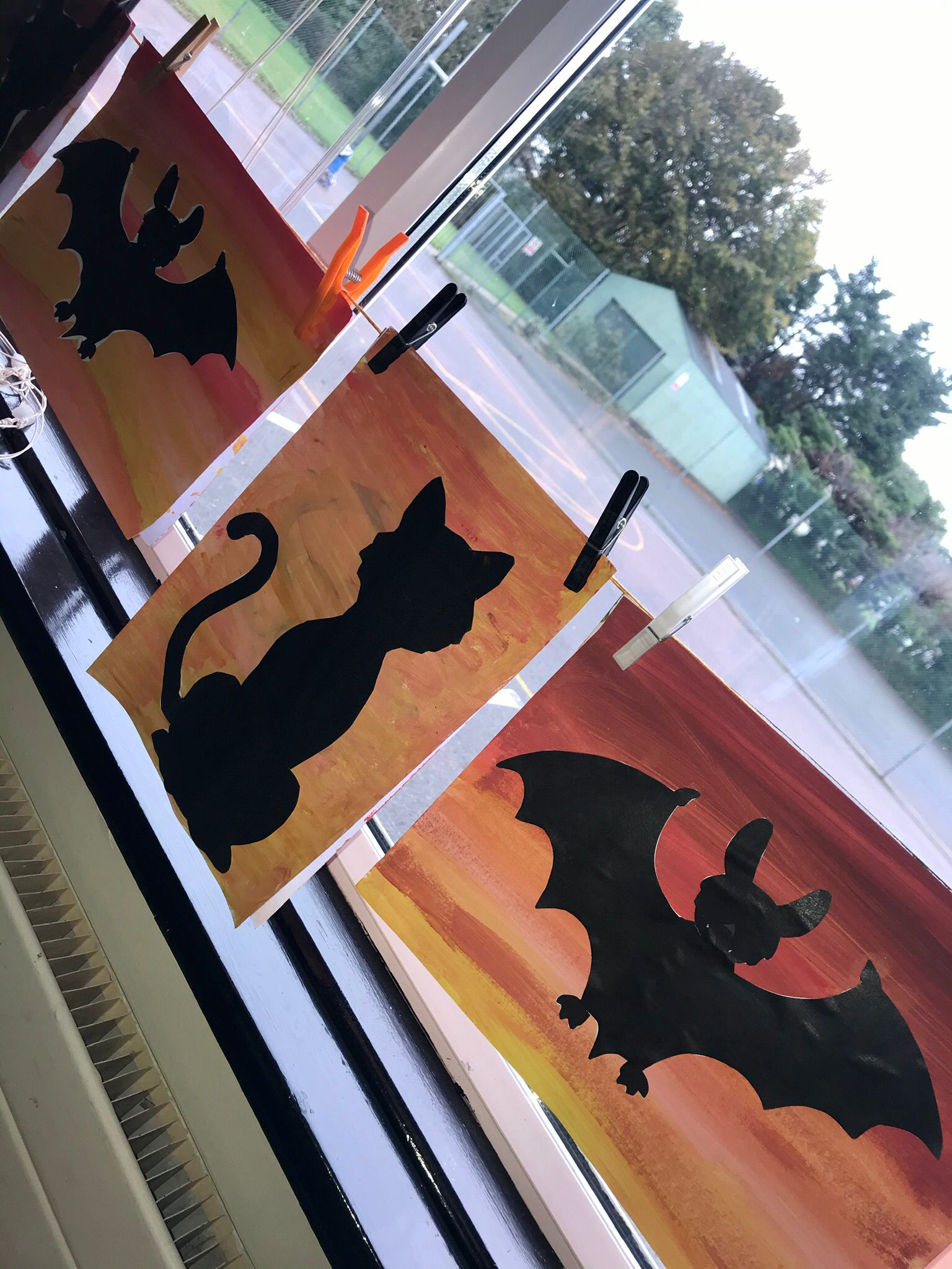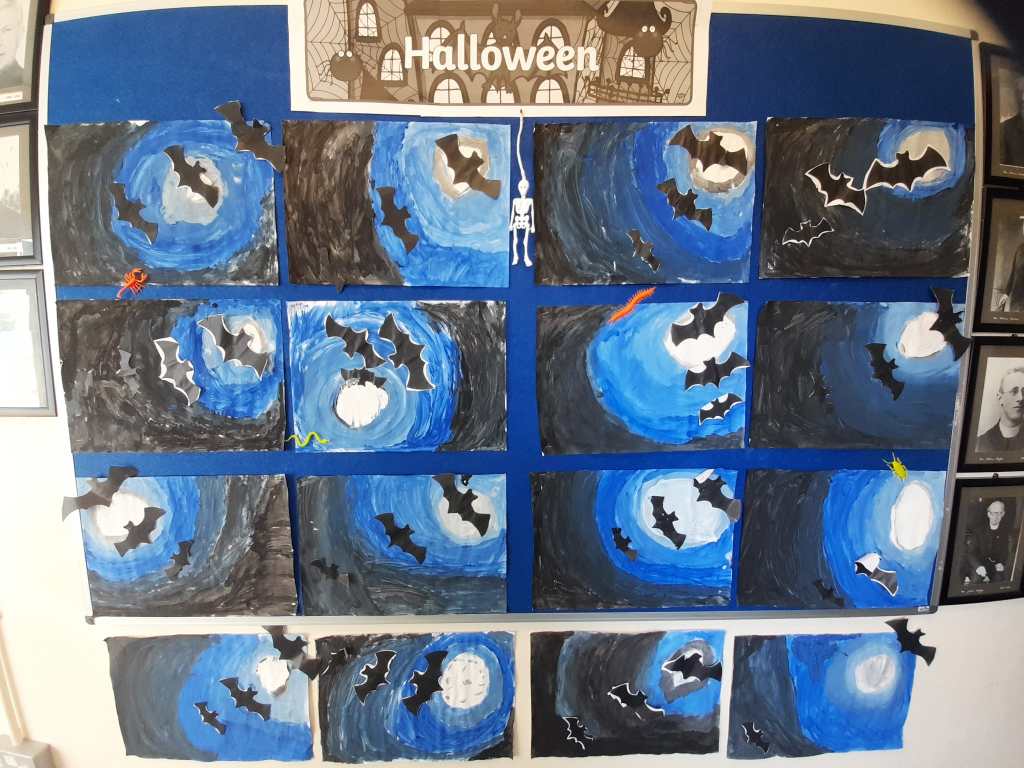 Senior Infants were hot on the heels of 1st class today with their Halloween art. From dark skies with nocturnal bats to orange glowing sunsets, with silhouettes of bats and cats!