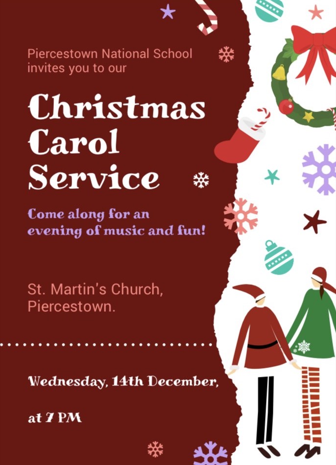 Annual Christmas Carol Service Wed 13th 7pm – Come along for music and joy with all of us at Piercestown N.S.