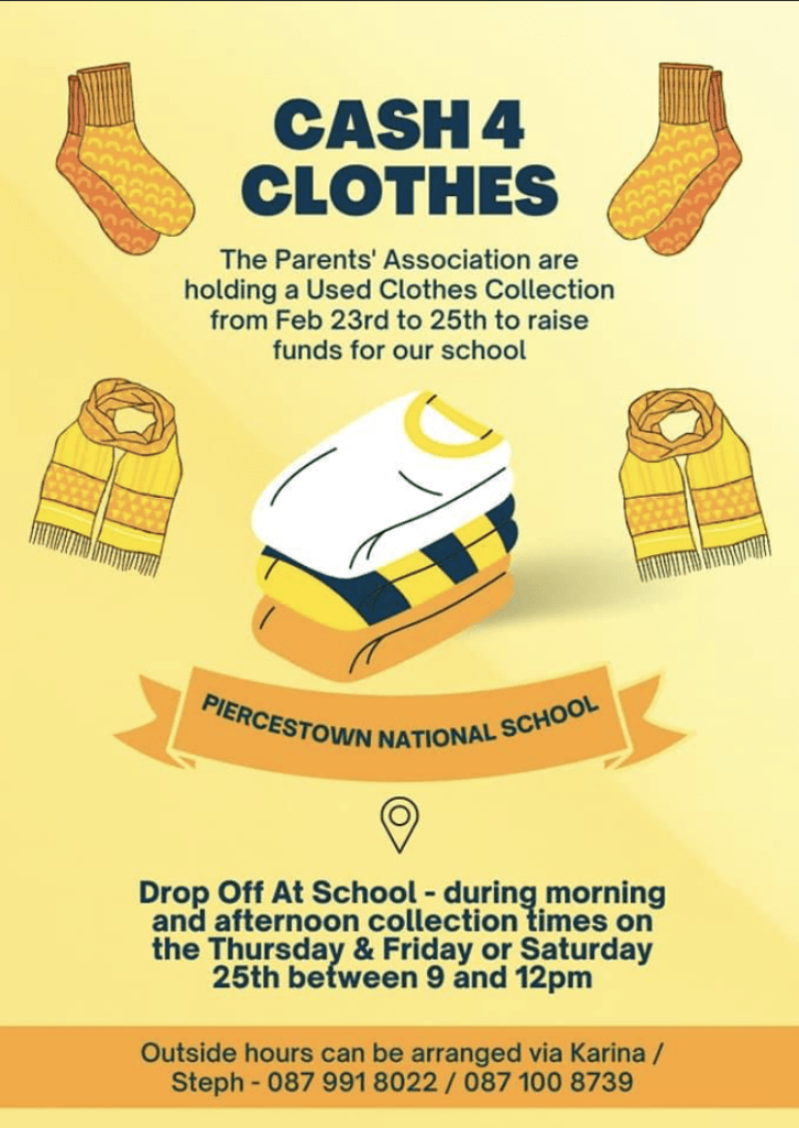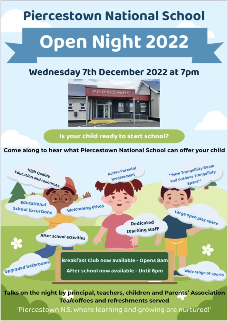 Is your child ready to start big school in September 2024? Come along to hear what Piercestown N.S. has to offer on Wednesday January 24th at 7pm in our school. We look forward to seeing you. For further information, call the office on 053-9158854.