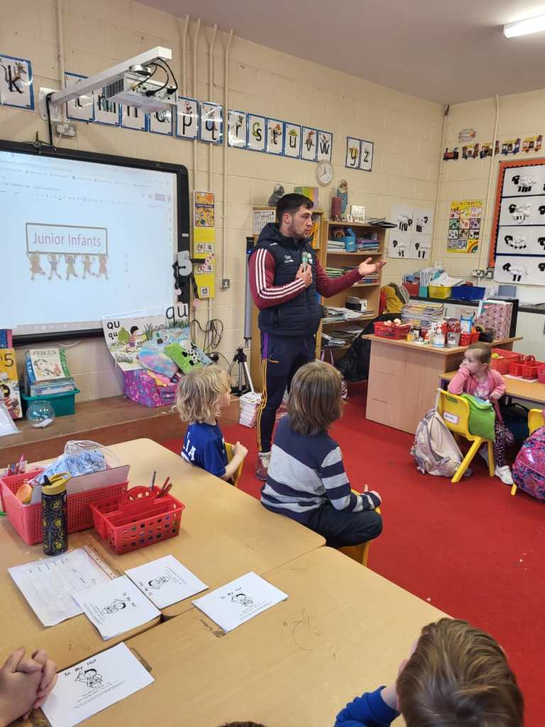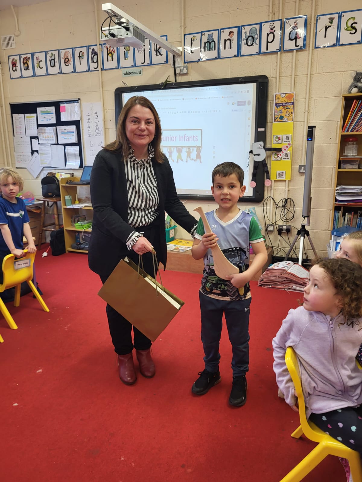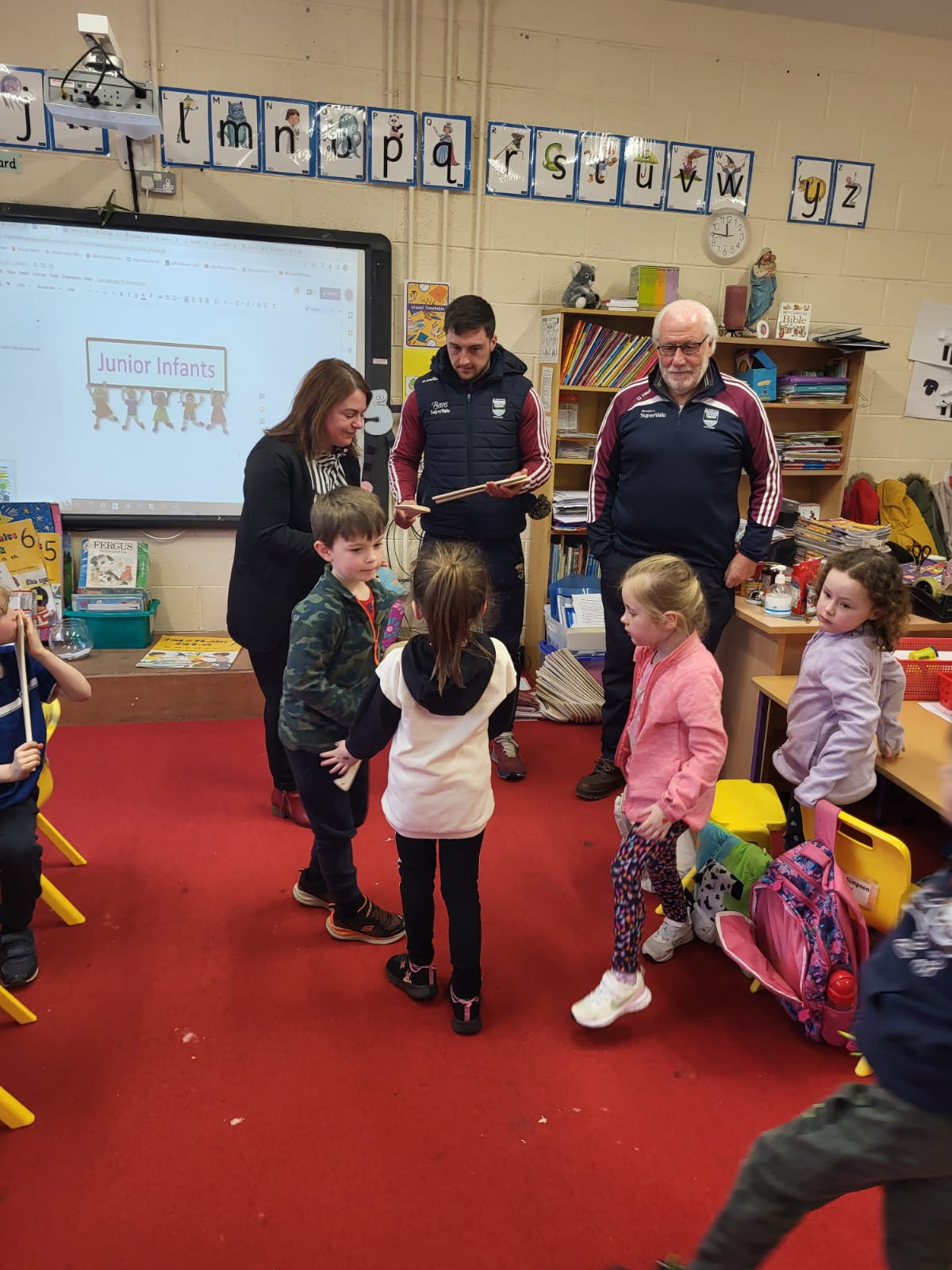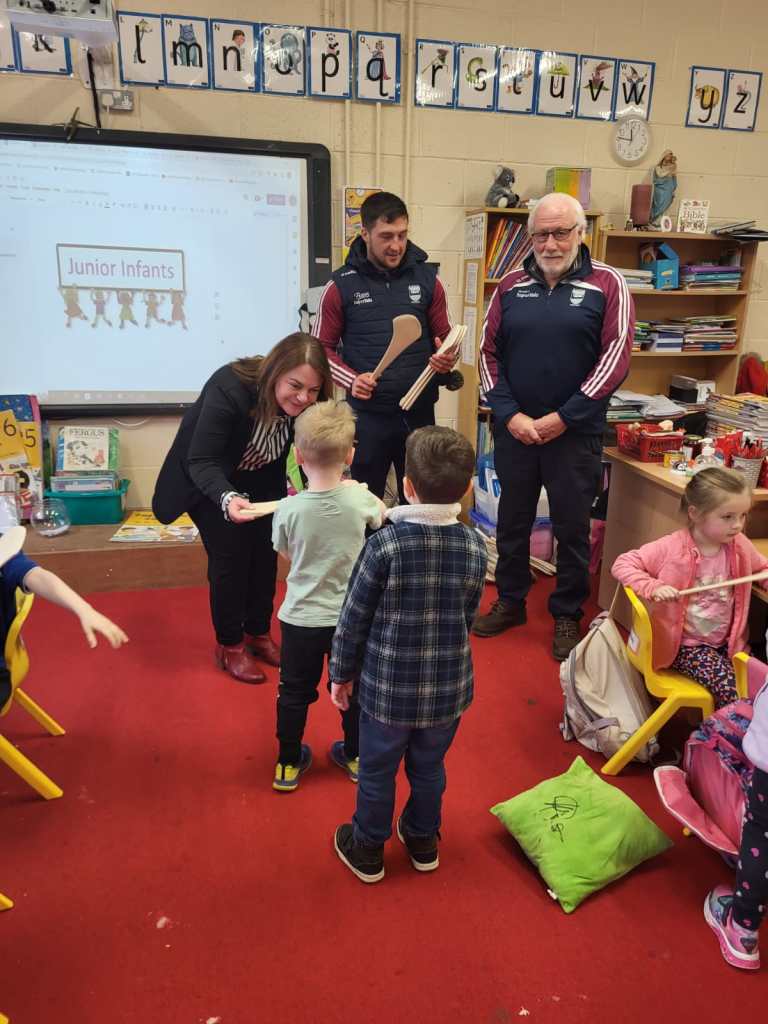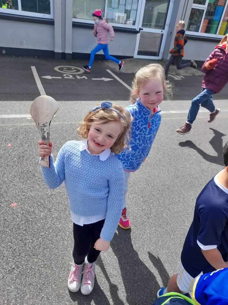 Two pods of children, one from Junior Infants and one from Senior Infants, were invited up to the socially distant gathering in the PE hall, to receive their hurls on behalf of their classes. The children were delighted to be chosen and proudly received their hurls presented to them by Vanessa and Becky.