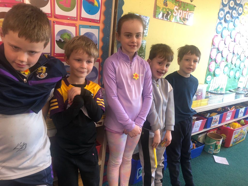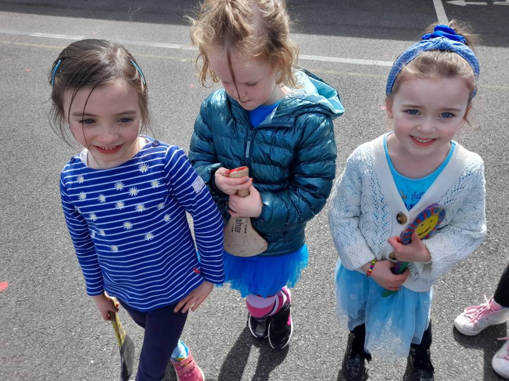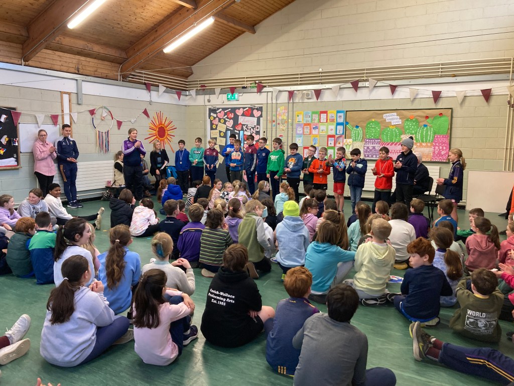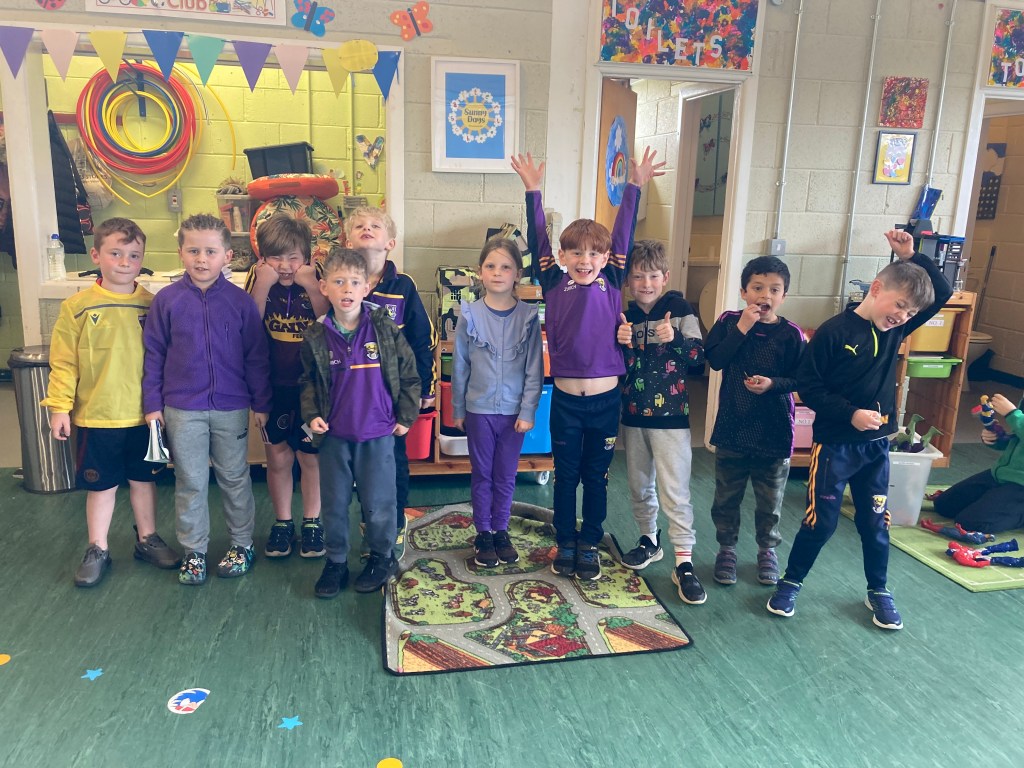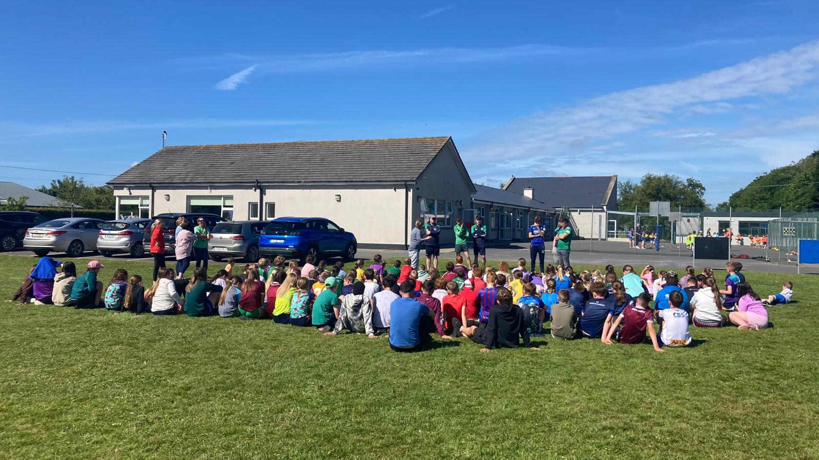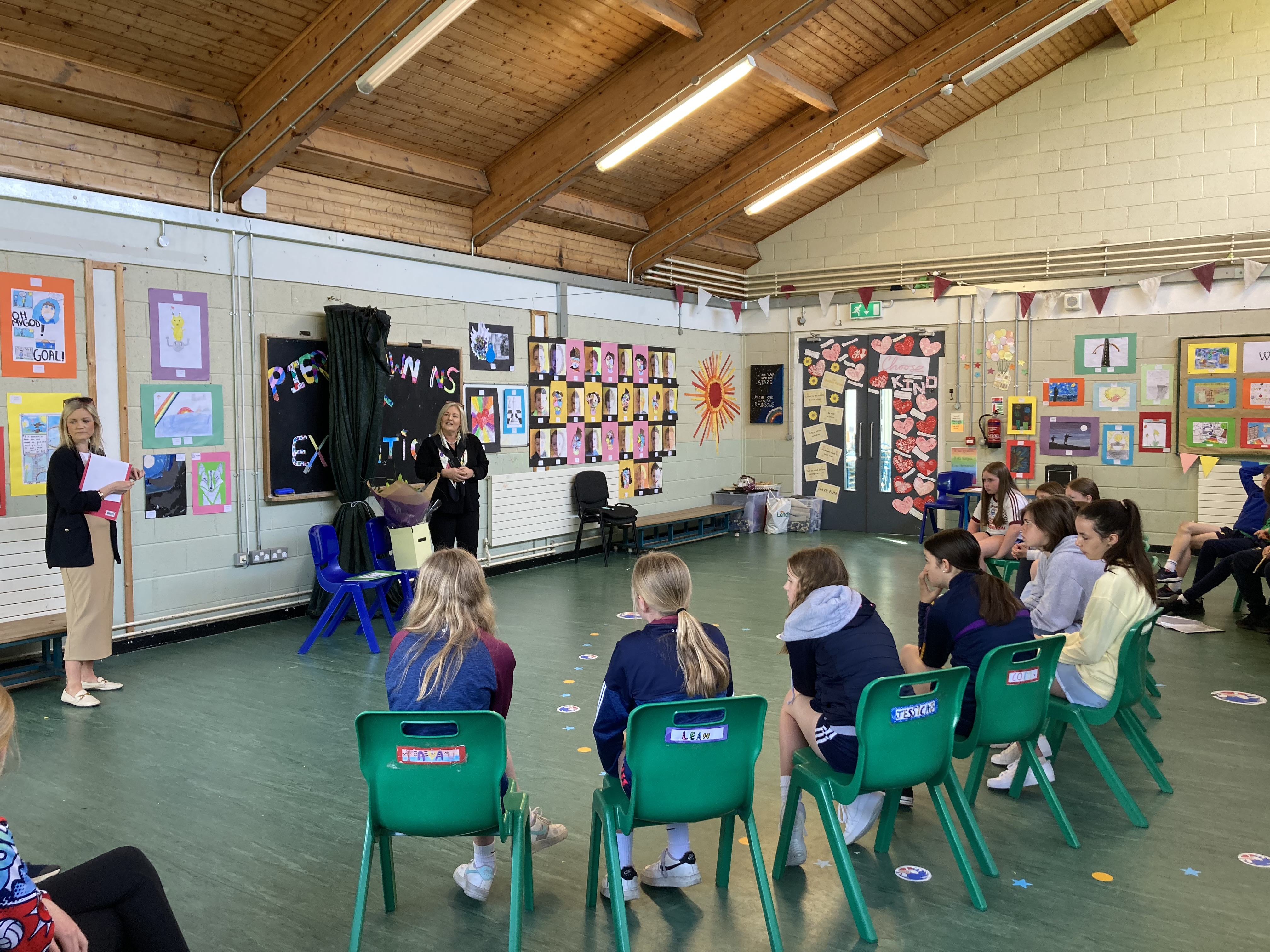 Two pods of children, one from Junior Infants and one from Senior Infants, were invited up to the socially distant gathering in the PE hall, to receive their hurls on behalf of their classes. The children were delighted to be chosen and proudly received their hurls presented to them by Vanessa and Becky.