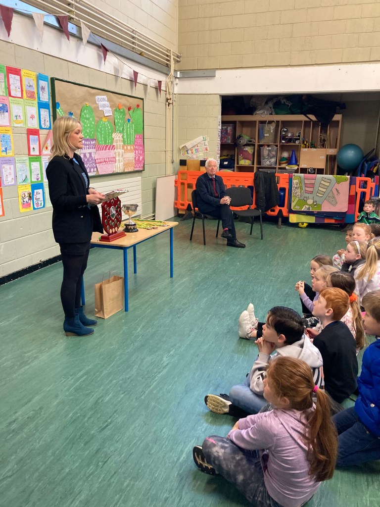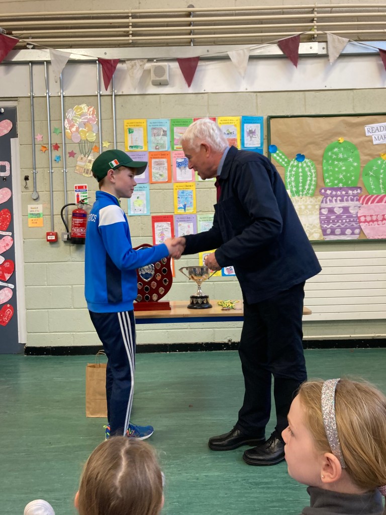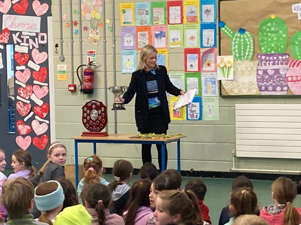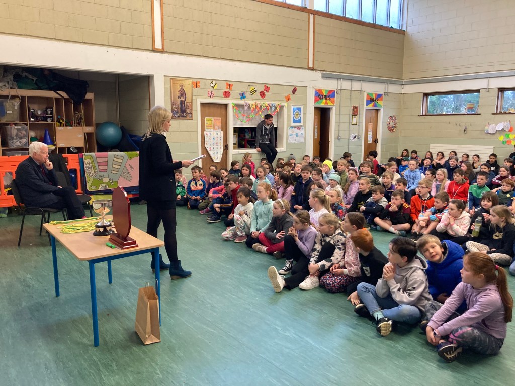 180 children ranging from 1st class to 6th class took part in our recent handwriting competition, where we looked at children’s handwriting and how it developed and improved during term two. At the end of this period we held our first ever handwriting awards ceremony on Friday 22nd March and many children received certificates of excellence for their efforts. One child from each class and one from SET, each received a very special glass trophy, the first of its kind to feature our new school crest. The overall winner, Oliver from 2nd class, was presented with a beautiful pen and glass holder. Check out the video to see the children who received awards. Well done to everyone involved!