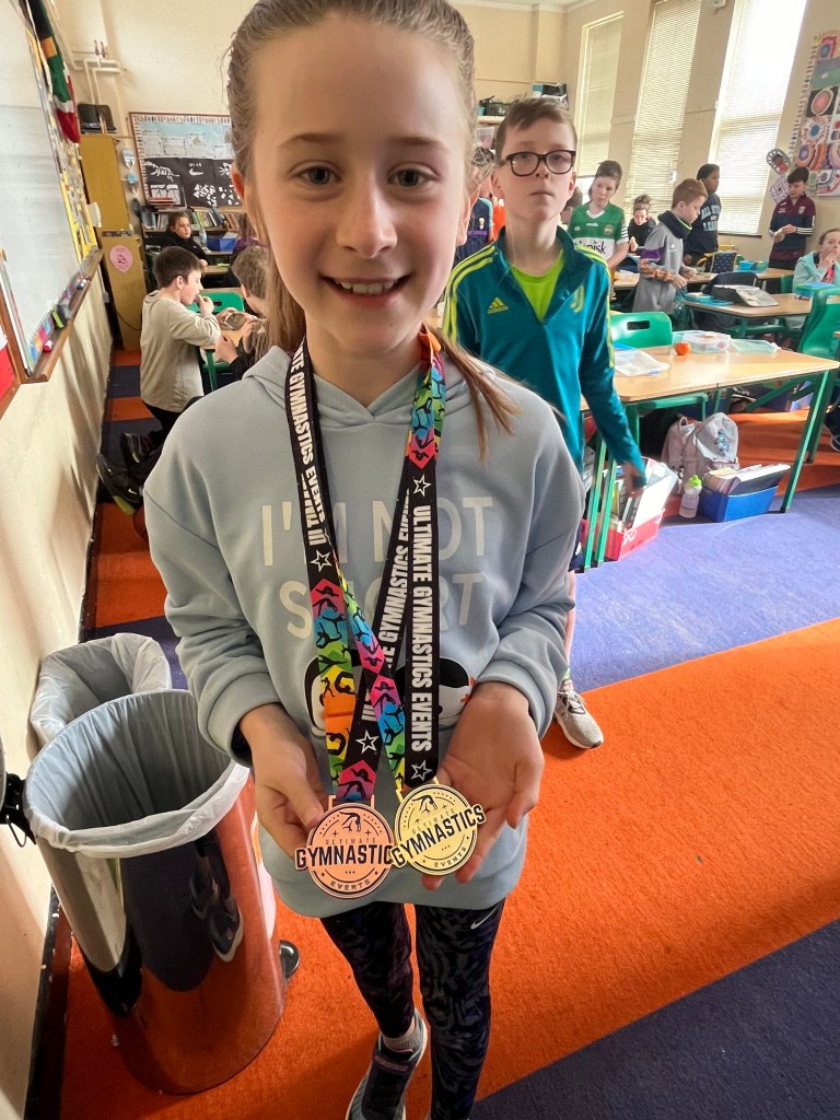 “I had to get up at quarter to six in the morning because our flight was at eight . We got over there and the train Victoria brought us straight to London. We saw Big Ben, London Eye, Buckingham Palace and we also went into the Science Museum. The next day was my gymnastics competition. My registration was at eight . I won 3rd place on trampette and 1st place on bars . I stayed there to watch all of the other girls. There were 12 of us and 31 medals came home!! If I could rewind time and do it again I definitely do it again.” – Mia, 5th class