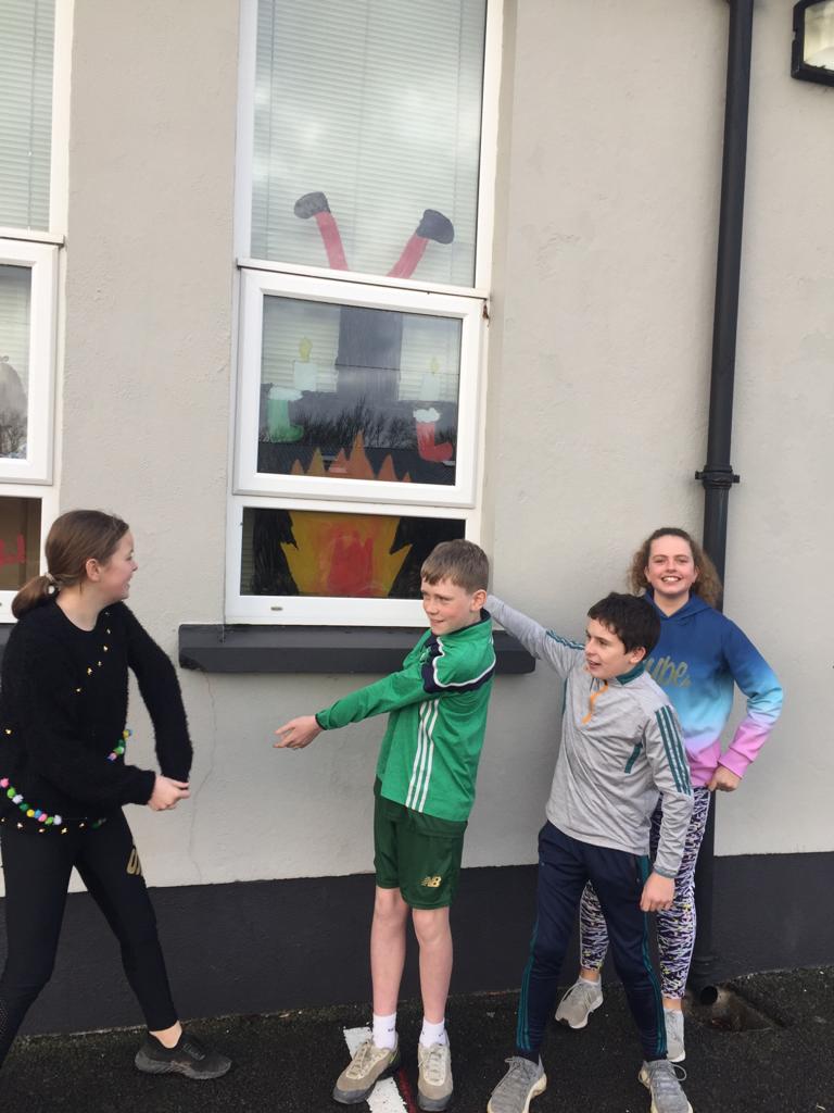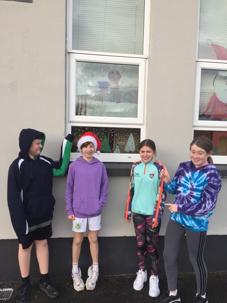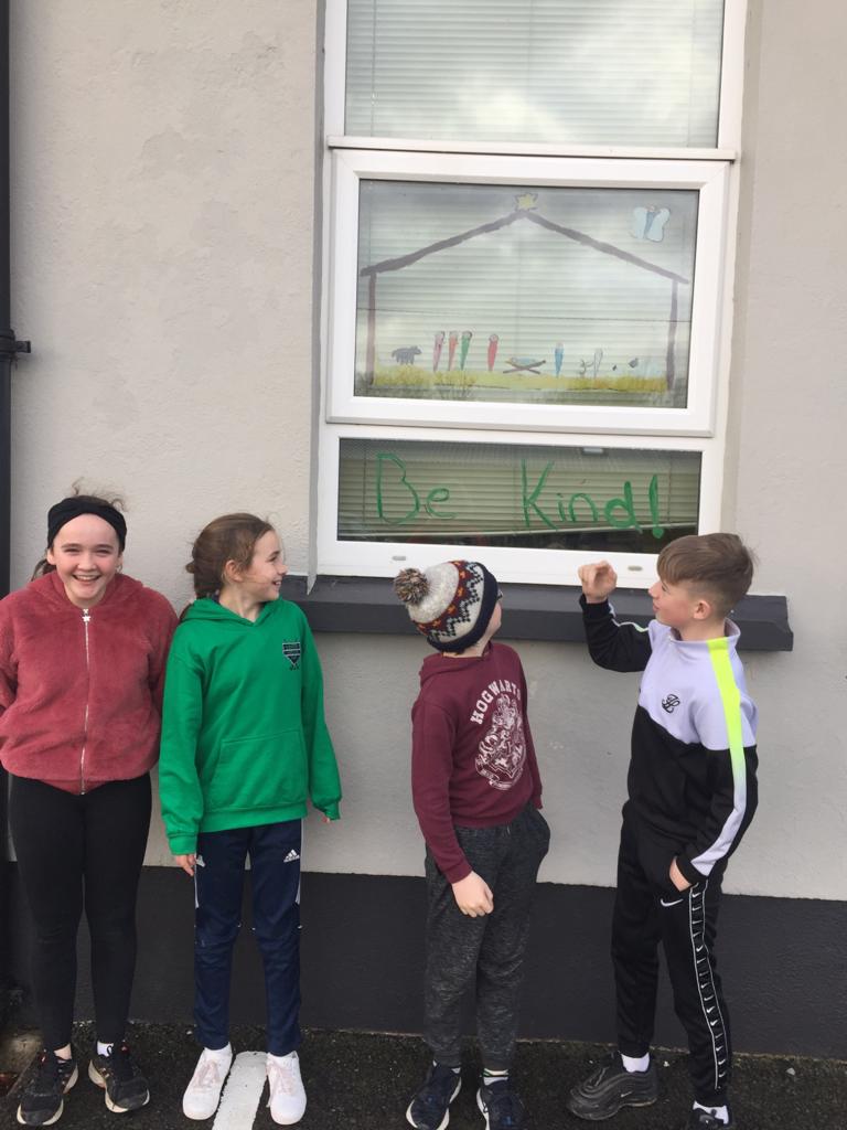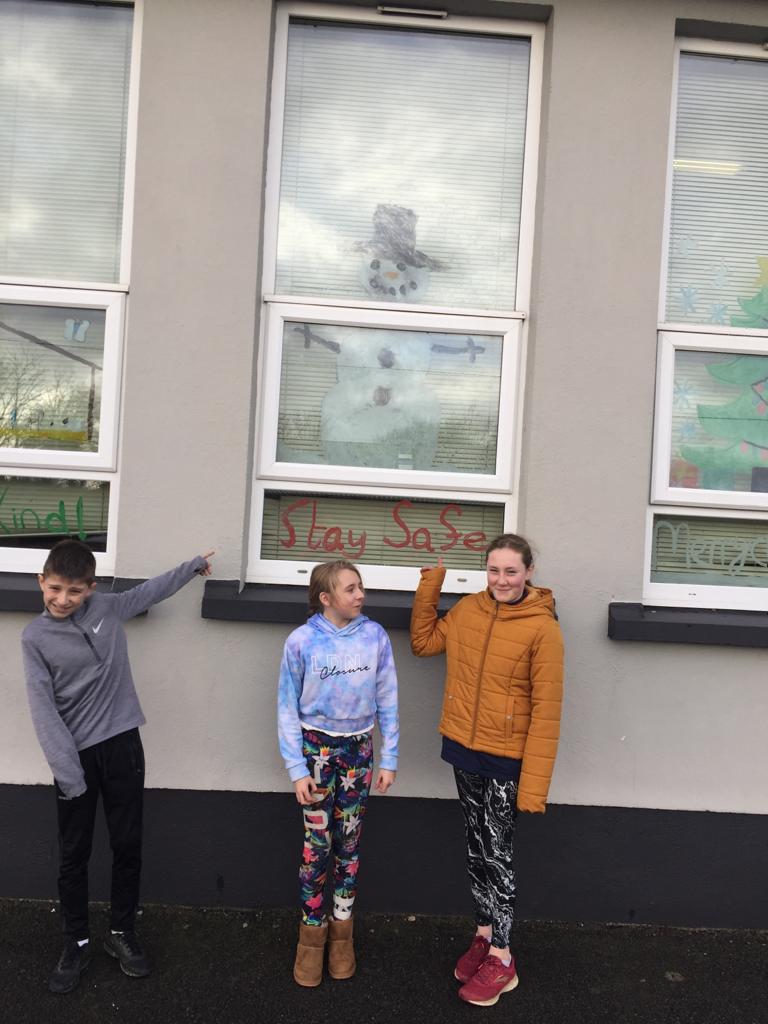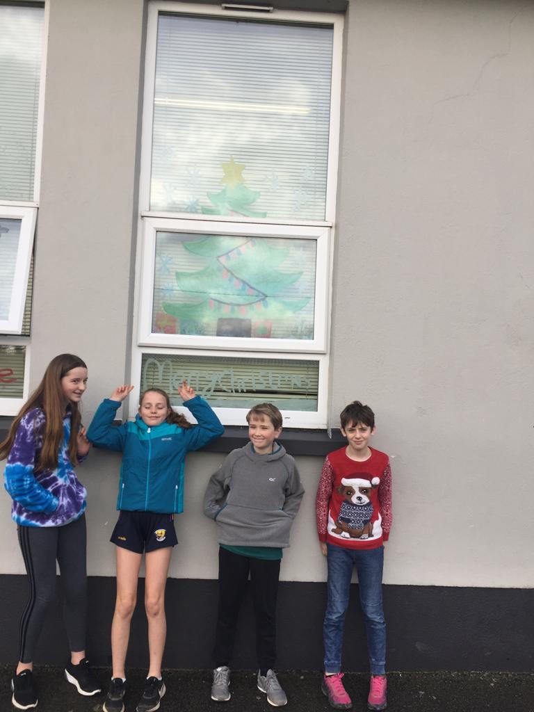 For their last Christmas in primary school the children in 6th class have really entered into the spirit of the season. As part of Advent and in preparation for Confirmation, they have ‘attended’ mass virtually throughout December from the safety of their own classroom, by tuning in to the parish web cam one morning each week. Some of the 6th class children are also doing readings at the special Christmas Eve Drive-In Mass in St. Martin’s pitch. On Thursday last, two separate pods of children, accompanied by their teacher, Ms. Hearne, went over to the church to decorate the Christmas tree. The children have also been busy decorating their own tables in their classroom and painting lovely Christmas scenes on their windows.