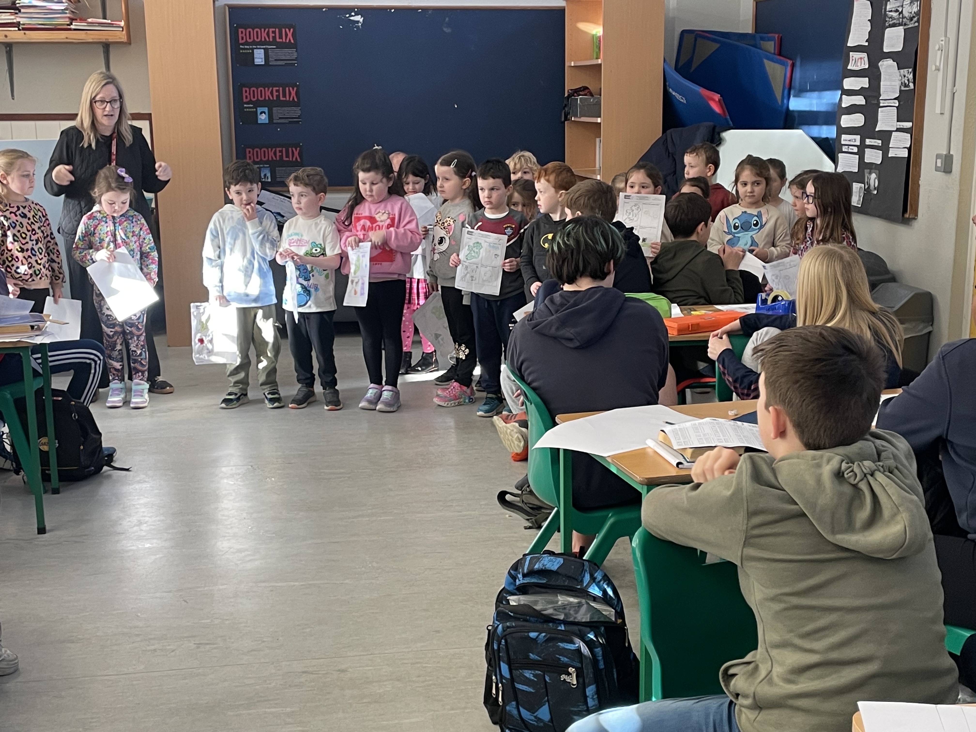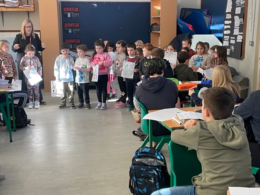 Junior Infants came for a visit to show off their reports on Ireland. They were so good and 6th class loved learning about the facts the Juniors had looked up. 6th class will drop in next week to show off their animal reports next week.